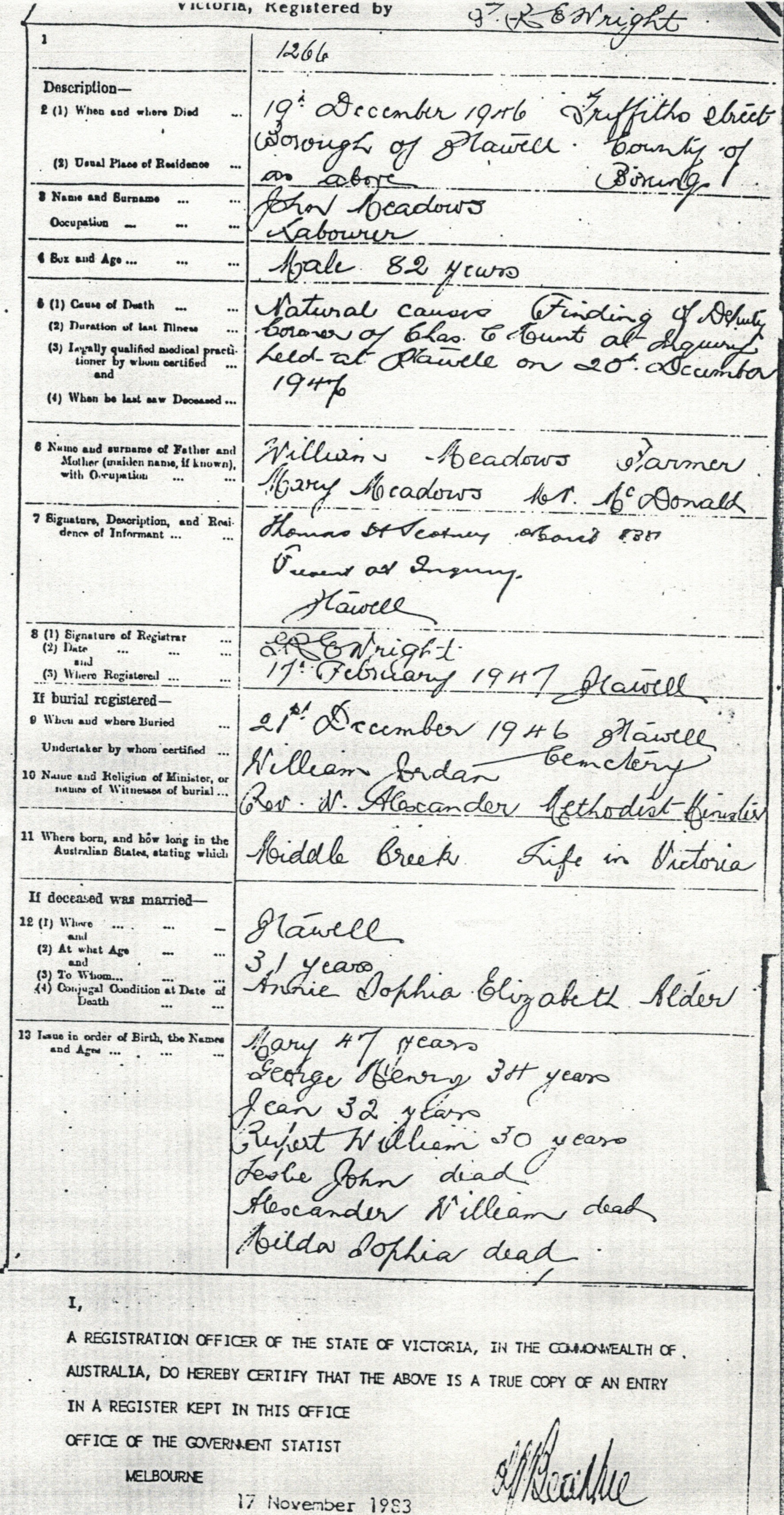 Documents and Memorabilia (1.3.1 ADLER/MEADOWS) Death certificate of Jack Meadows, Stawell, 1946 [BDMVic.]/Bob Quincey]. Note “Adler” mispelt as “Alder”.