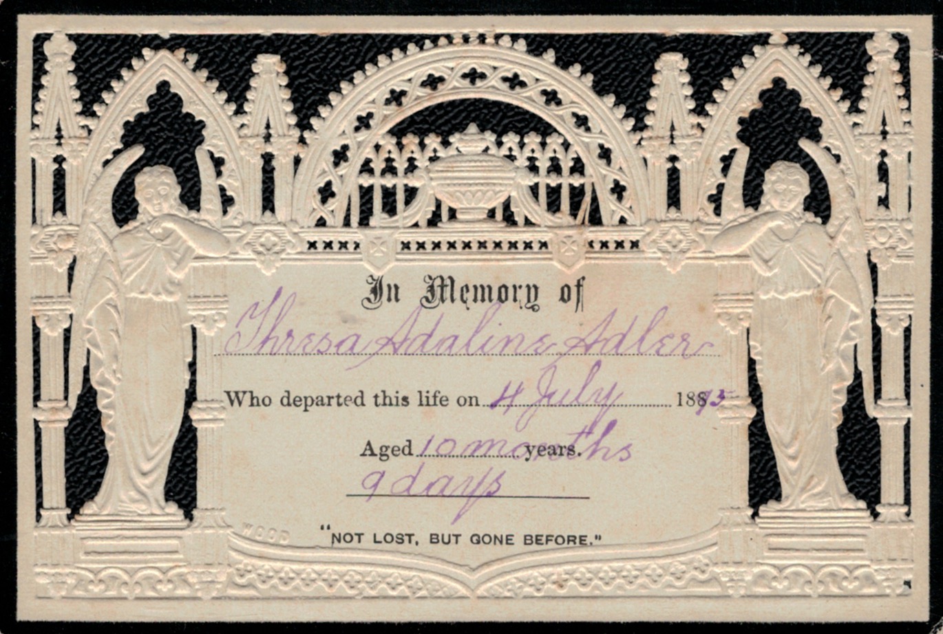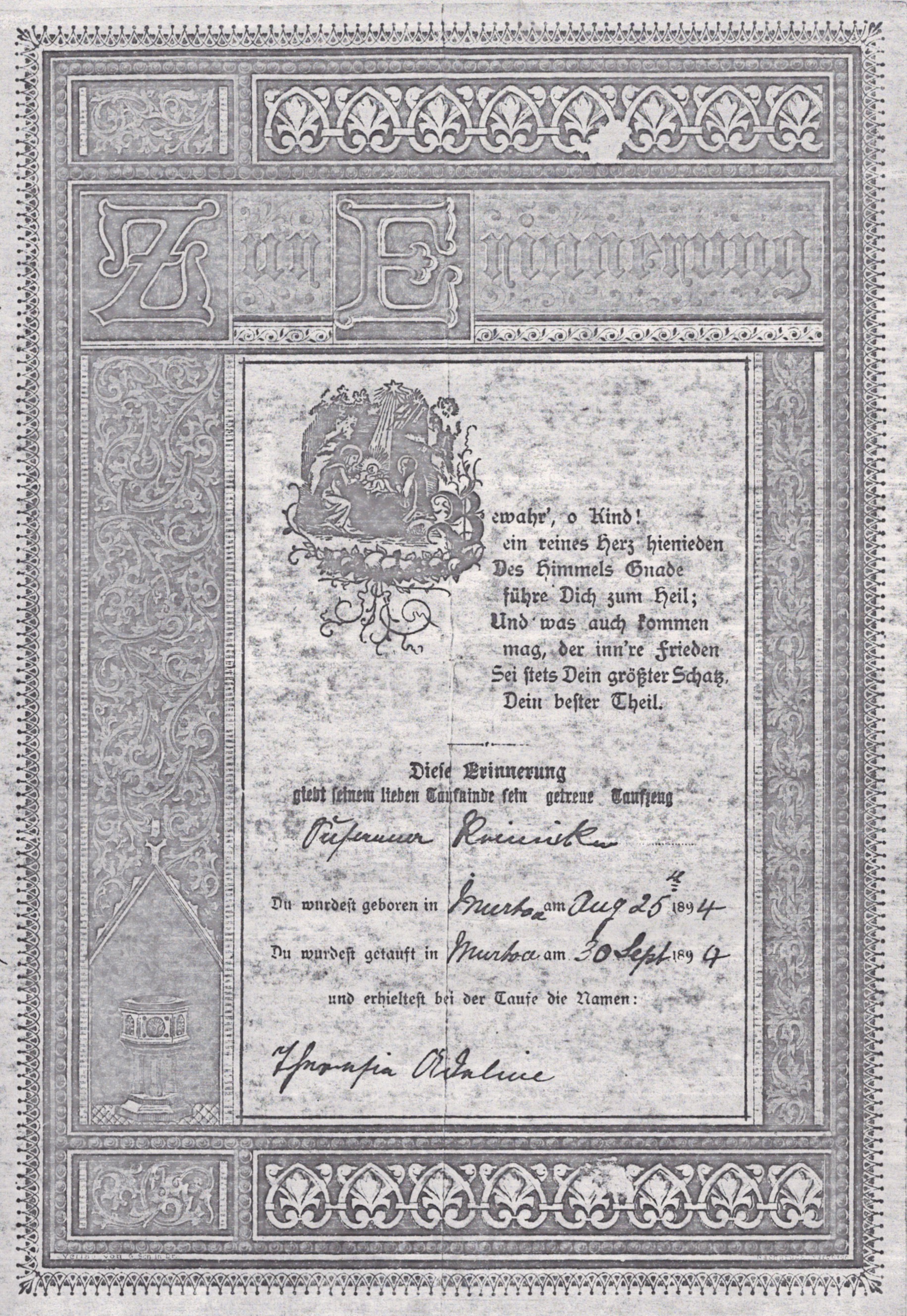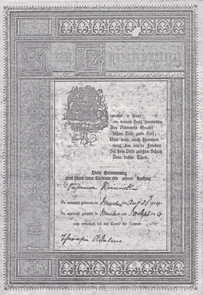 Documents and Memorabilia (1.3.10 ADLER) Baptismal certificate for Theresa Adler from her aunt Susan Reinecke (Schache), Murtoa, Vic., 1894 [Winnie Schubert (Adler)]. Memorial card for Theresa Adler, 1891 [Winnie Schubert (Adler)].