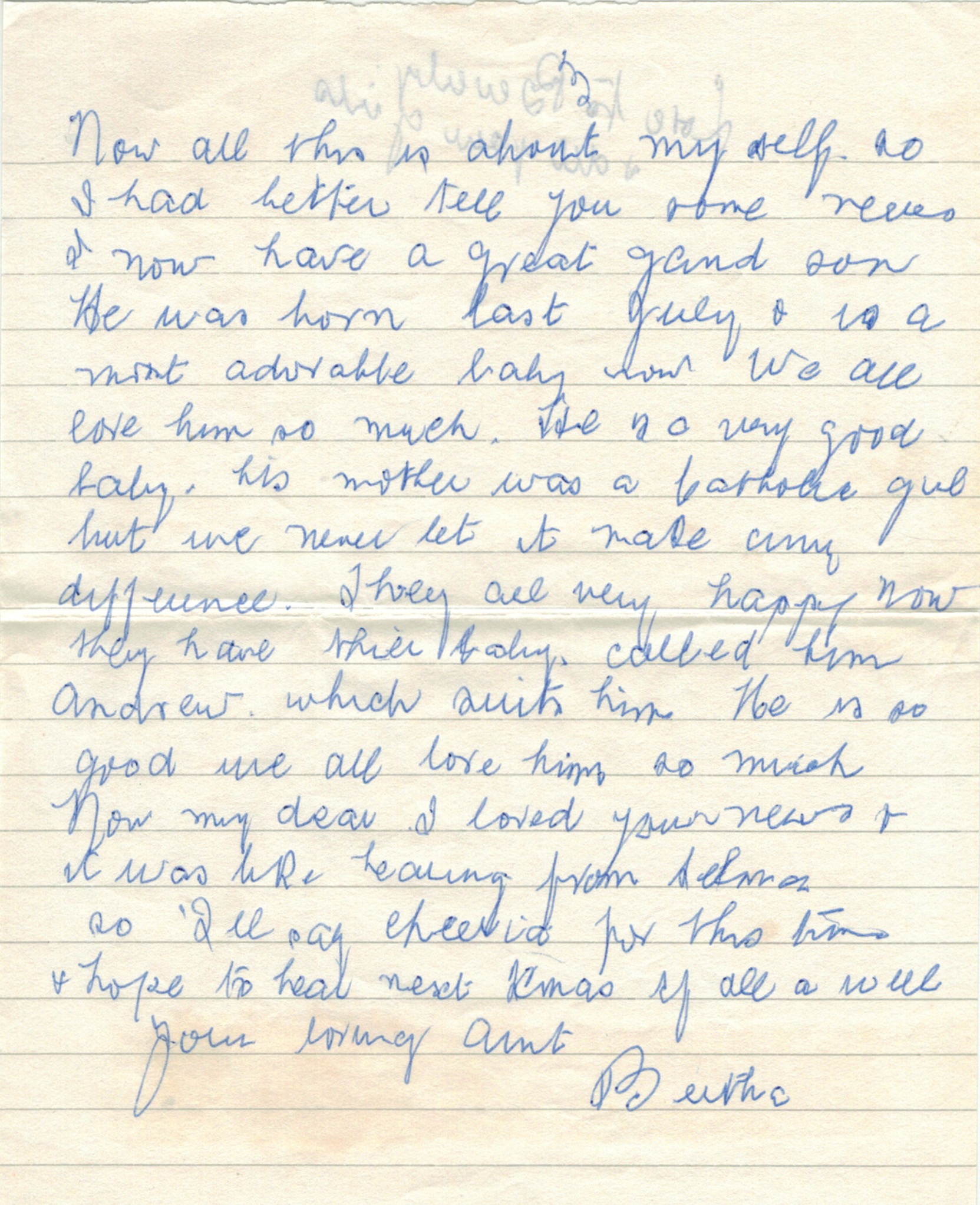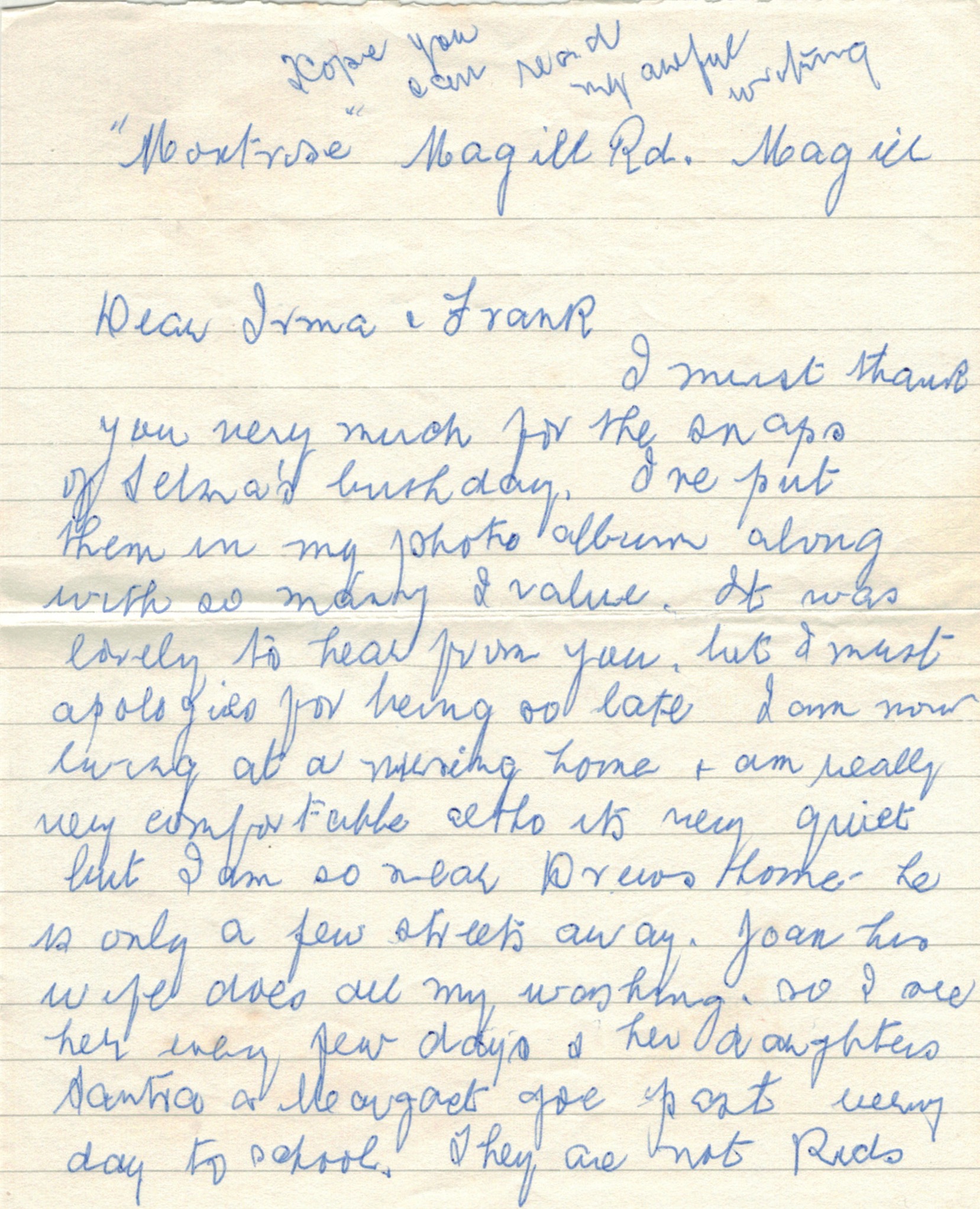 Letter from Bertha Polglase (Reinecke) to Irma Russell (Schache), Vic., written late in her life [Irma Russell (Schache)].