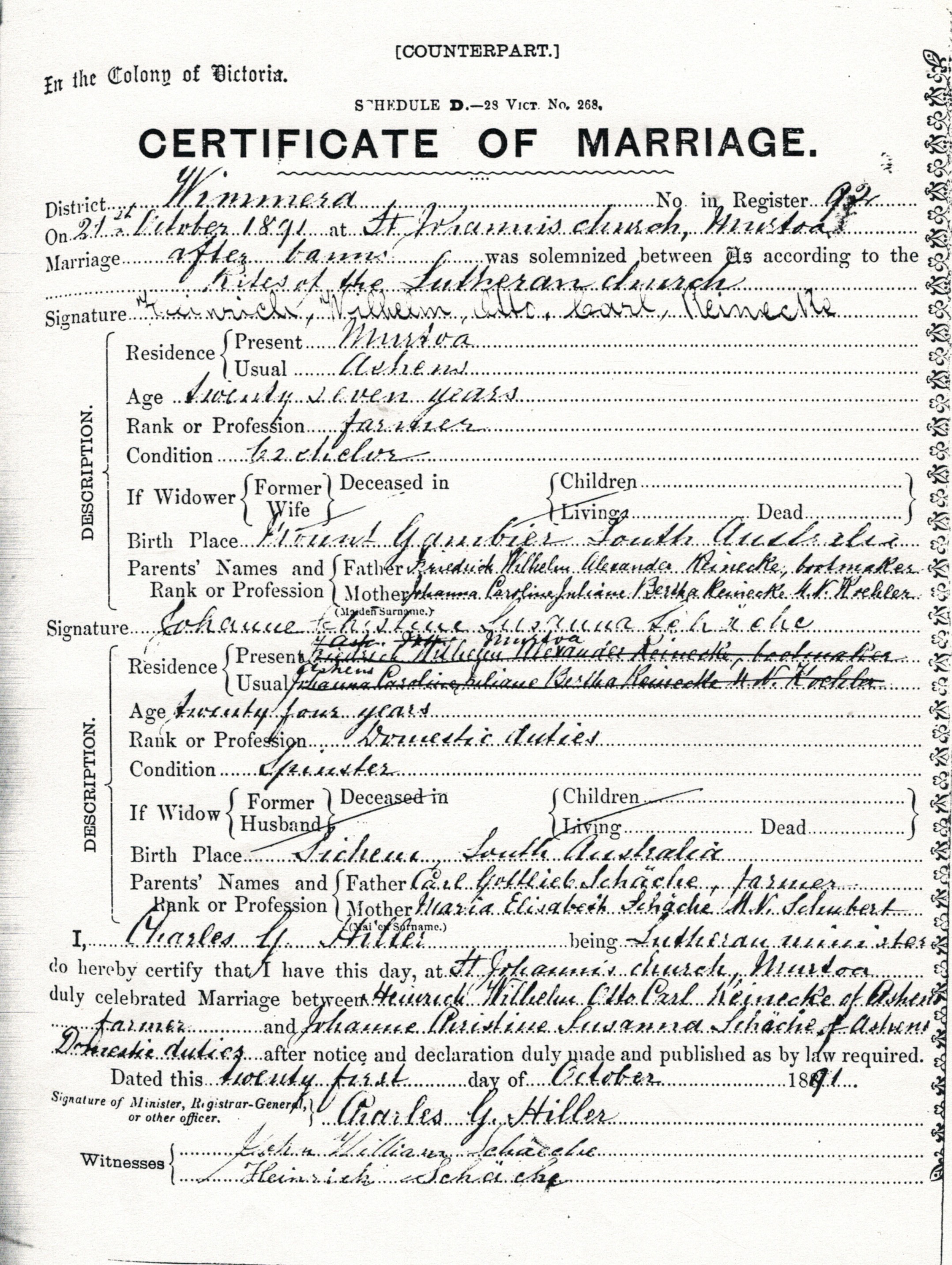 Marriage certificate of Charlie and Susan Reinecke (Schache), Murtoa, Vic., 1891 [Lutheran Archives/David Ikin].
