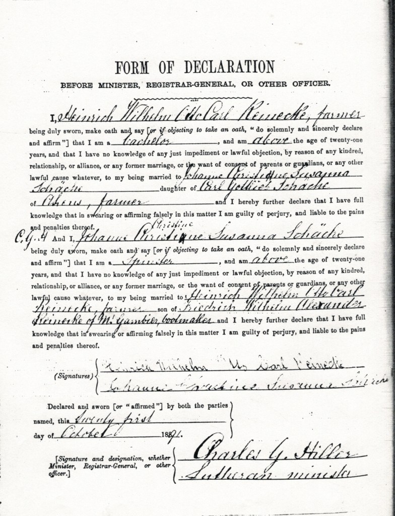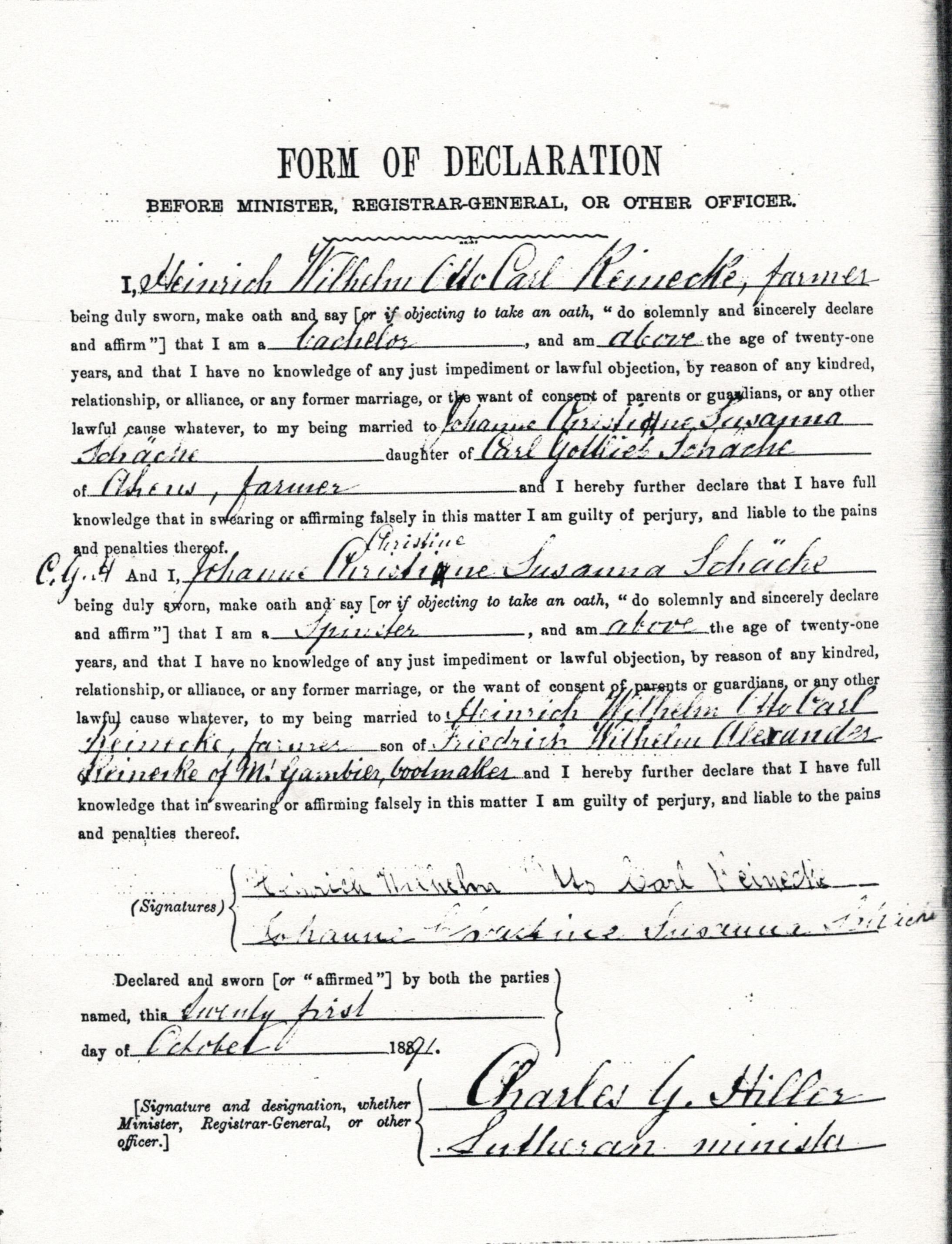 Marriage declaration form of Charlie and Susan Reinecke (Schache), Murtoa, Vic., 1891 [Lutheran Archives/David Ikin].