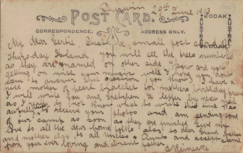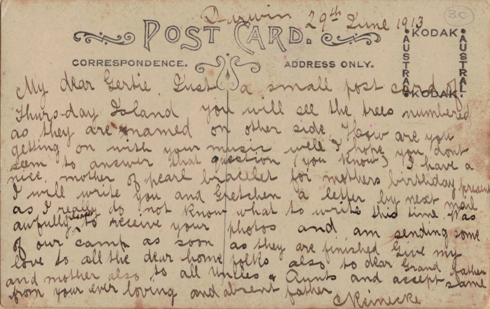 Postcard sent by Charlie Reinecke from Darwin to his daughter Gertie (later Ikin/Turner), Mount Gambier, SA. 1913 [David Ikin]