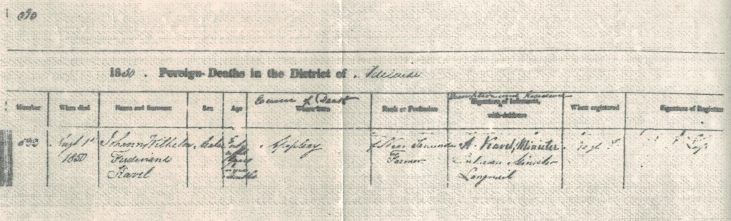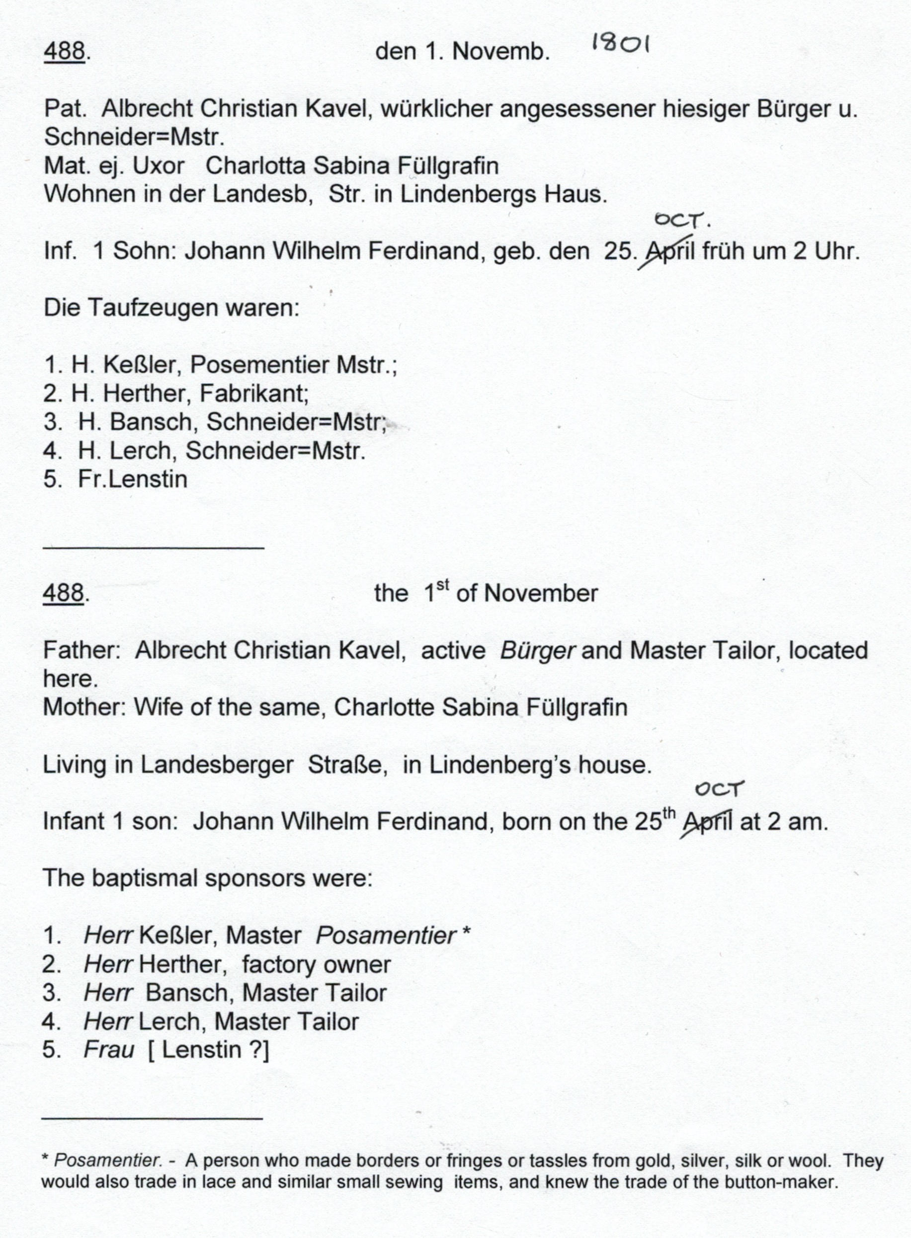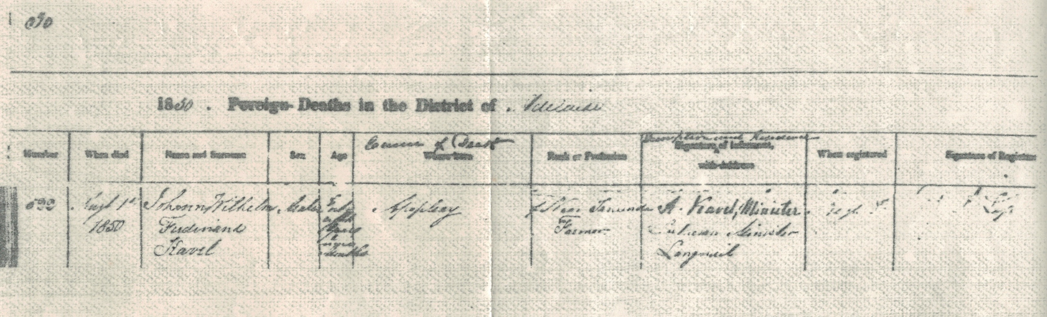 Baptismal record for Ferdinand Kavel at the Evangelische Sankt Georgenkirche (Evangelical St. George Church), Berlin, 1801 [transcription and translation by Herbert Mees].Reisebericht der lutherischen Auswanderer aus Preußen, ihrem Vaterslande, nach Australien. (von Ferdinand Kavel, Bruder des Pastor Kavel) [Travel Report], Hamburg, 1839.Death registration of Ferdinand Kavel, Langmeil SA, 1850 [BDMSA: Foreign Deaths in the District of Adelaide, South Australia, 1850; 6th column, cause of death; 7th column, occupation; 8th column informant, Pastor Kavel].
