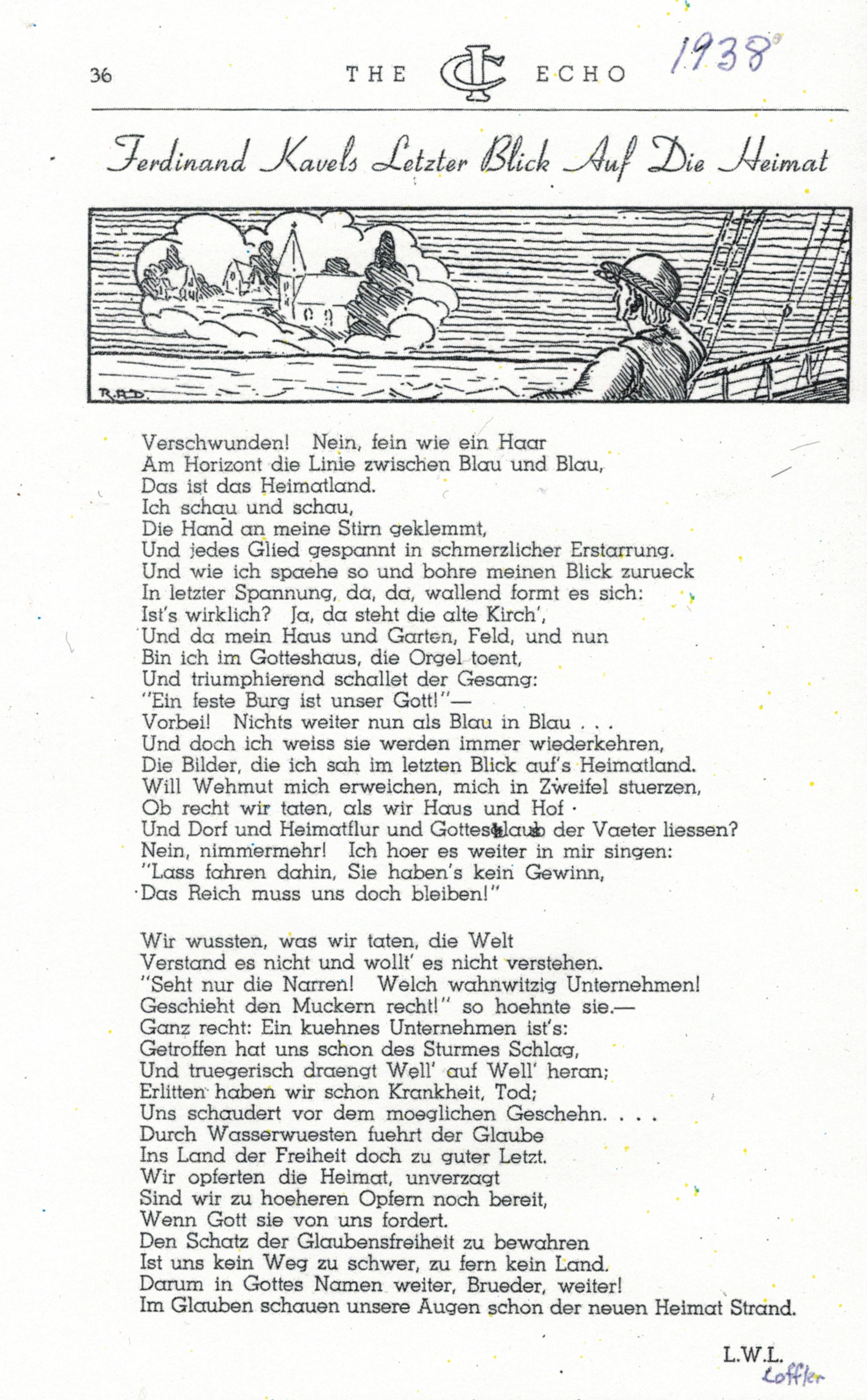 “Ferdinand Kavels Letzter Blick Auf Die Heimat” [Ferdinand Kavel’s Last View of Home], Echo, North Adelaide, Immanuel College, 1938.
