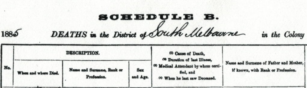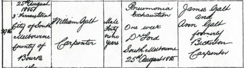 Documents and Memorabilia (1.4 PARKER) Death registration of William Galt, South Melbourne, Vic. 1885 [BDMVic./Joy Quinn].