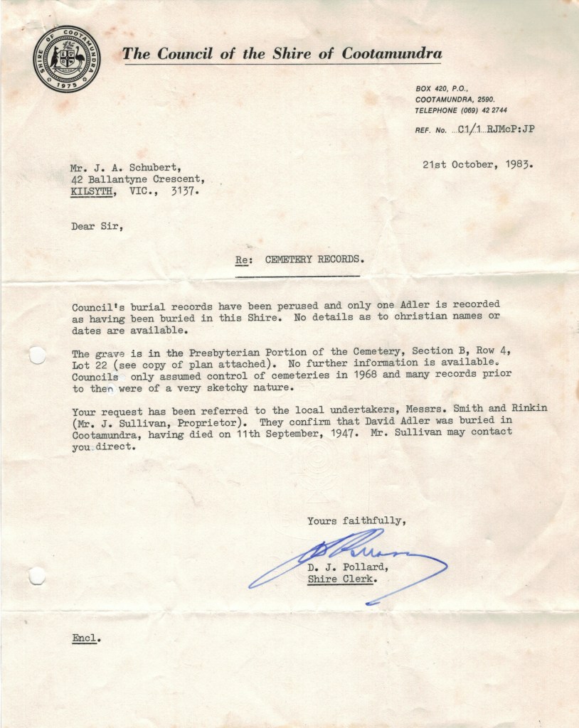 Documents and Memorabilia (1.5.1 ADLER) Council of the Shire of Cootamundra, letter dated 21 October 1983 [JAS].