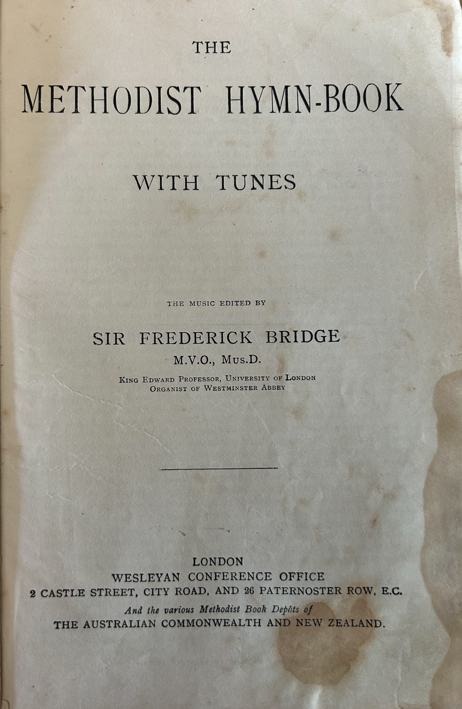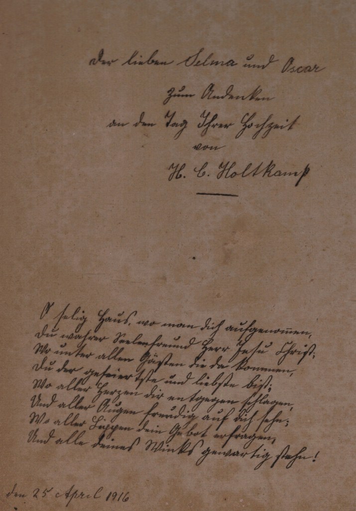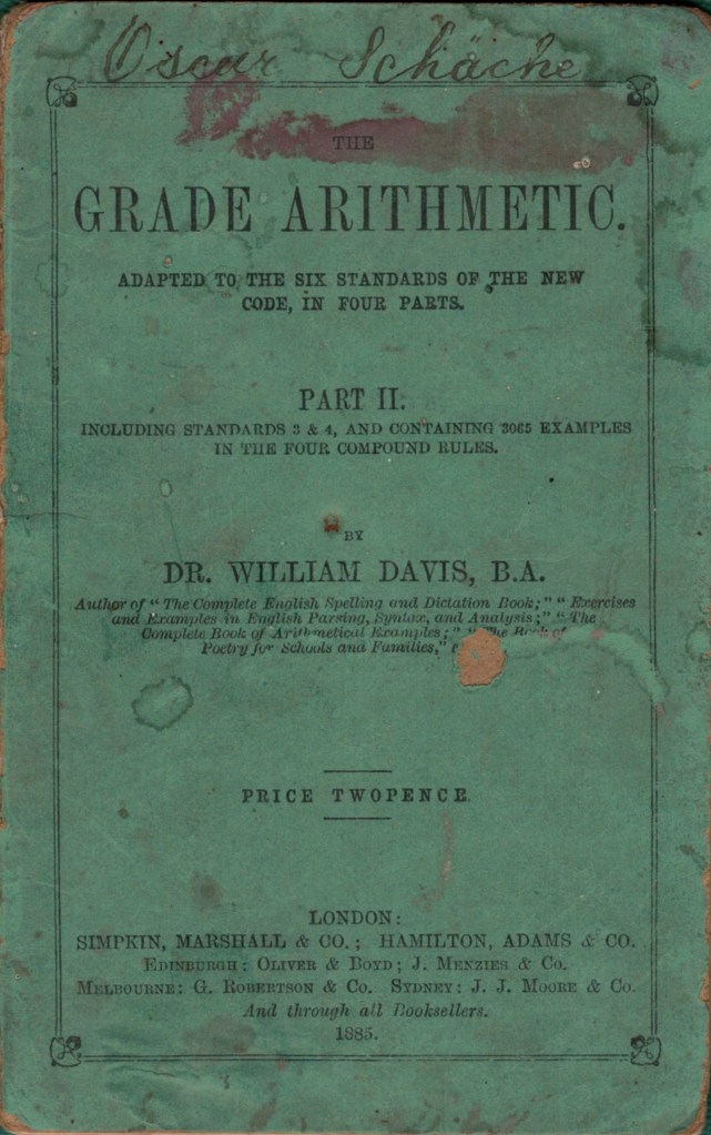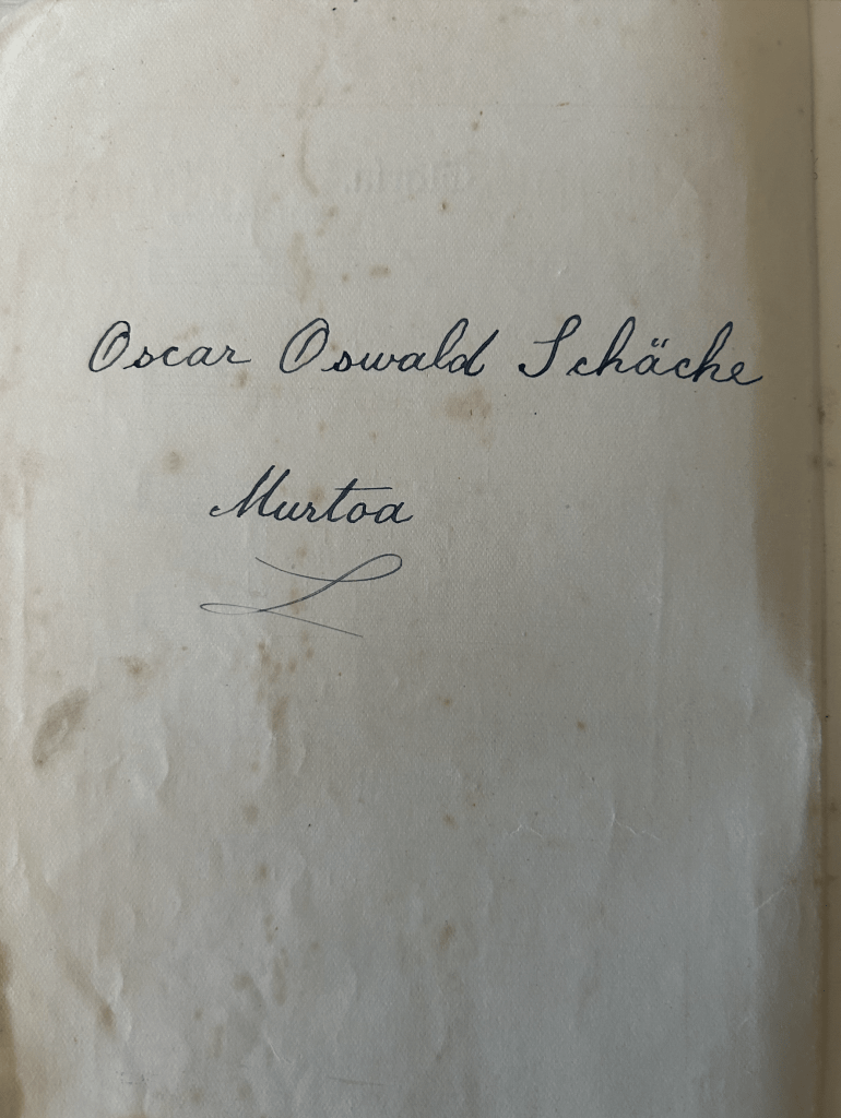 Fred Schache’s primary school arithmetic book, later used by Ossie Schache.Ossie Schache’s Methodist hymnbook. Inscription on the back of a German religious wall text; a gift to Ossie and Selma Schache (Adler) on their wedding, Murtoa, 1916.