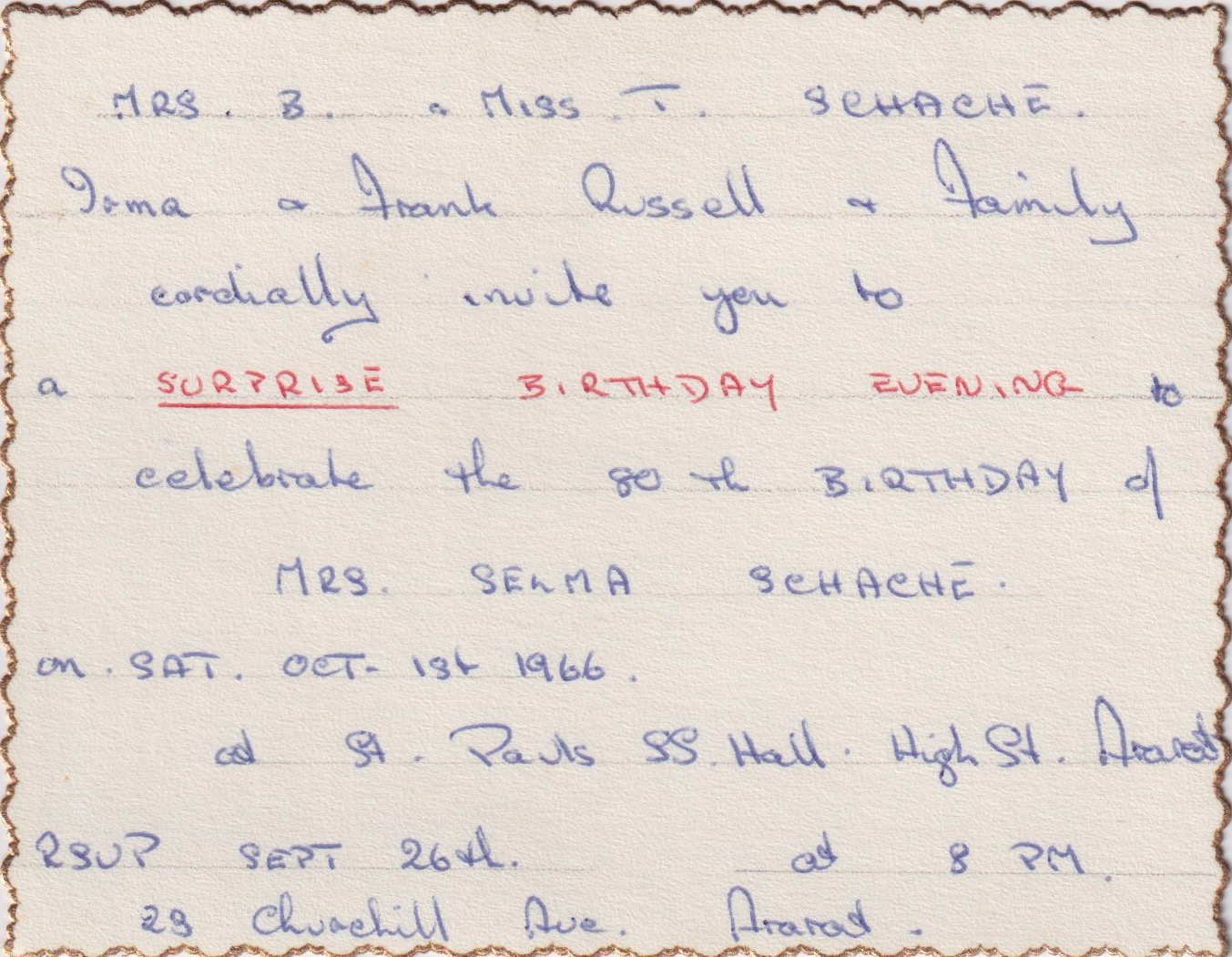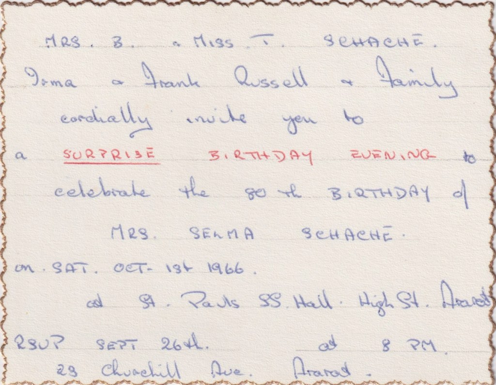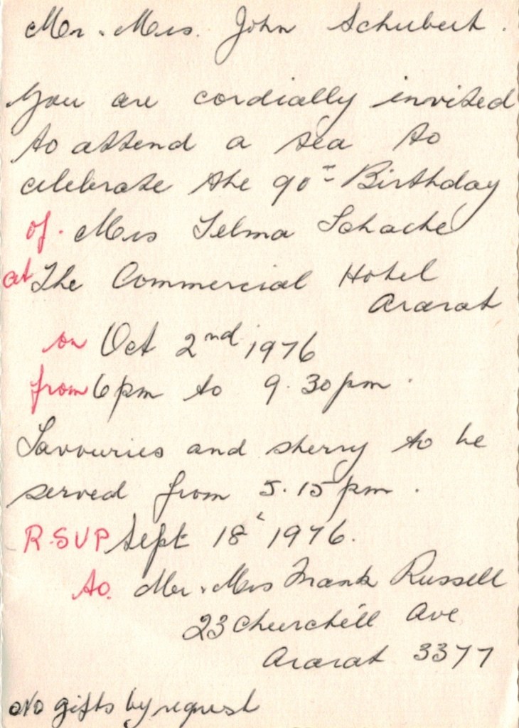 Invitation to 80th birthday of Selma Schache (Adler), Ararat, Vic., 1 October 1966 [Tess Hausler (Schache)].Invitation to 90th birthday of Selma Schache (Adler), Ararat, Vic., 2 October 1976.Funeral service order for Selma Schache (Adler), Ararat, Vic., 22 April 1977.