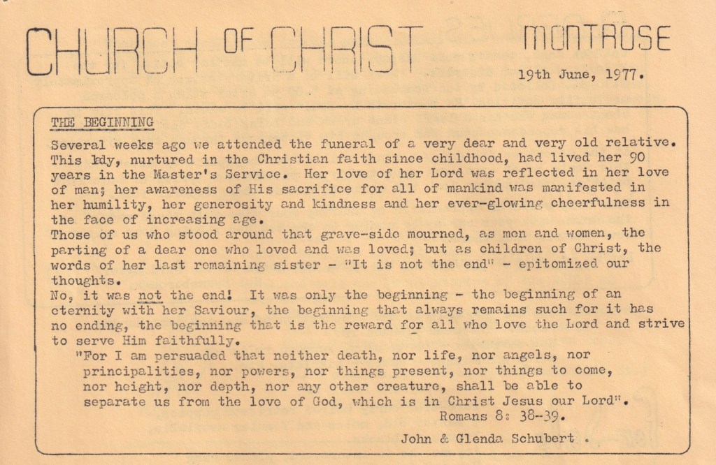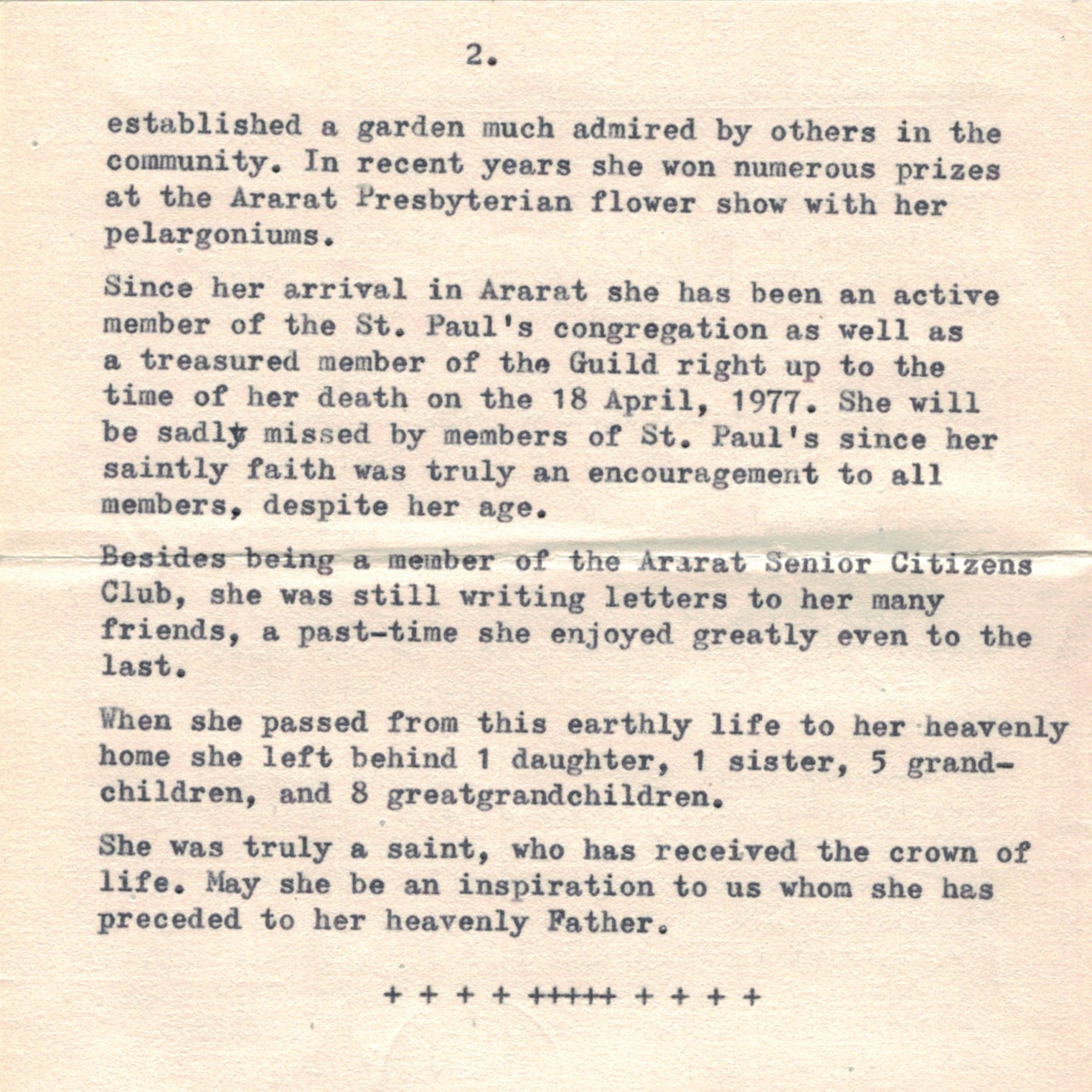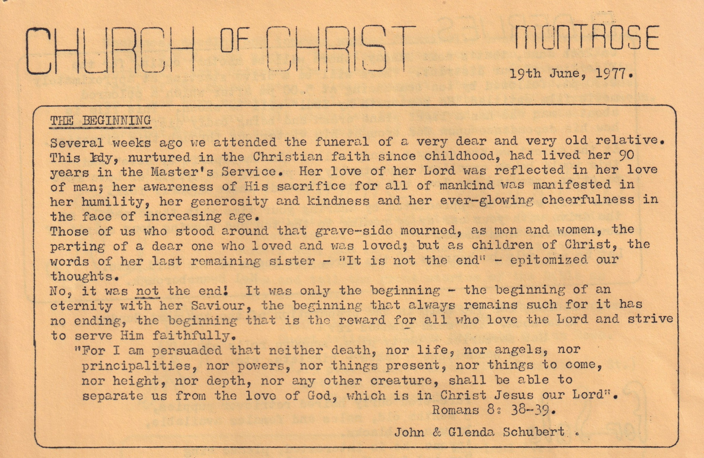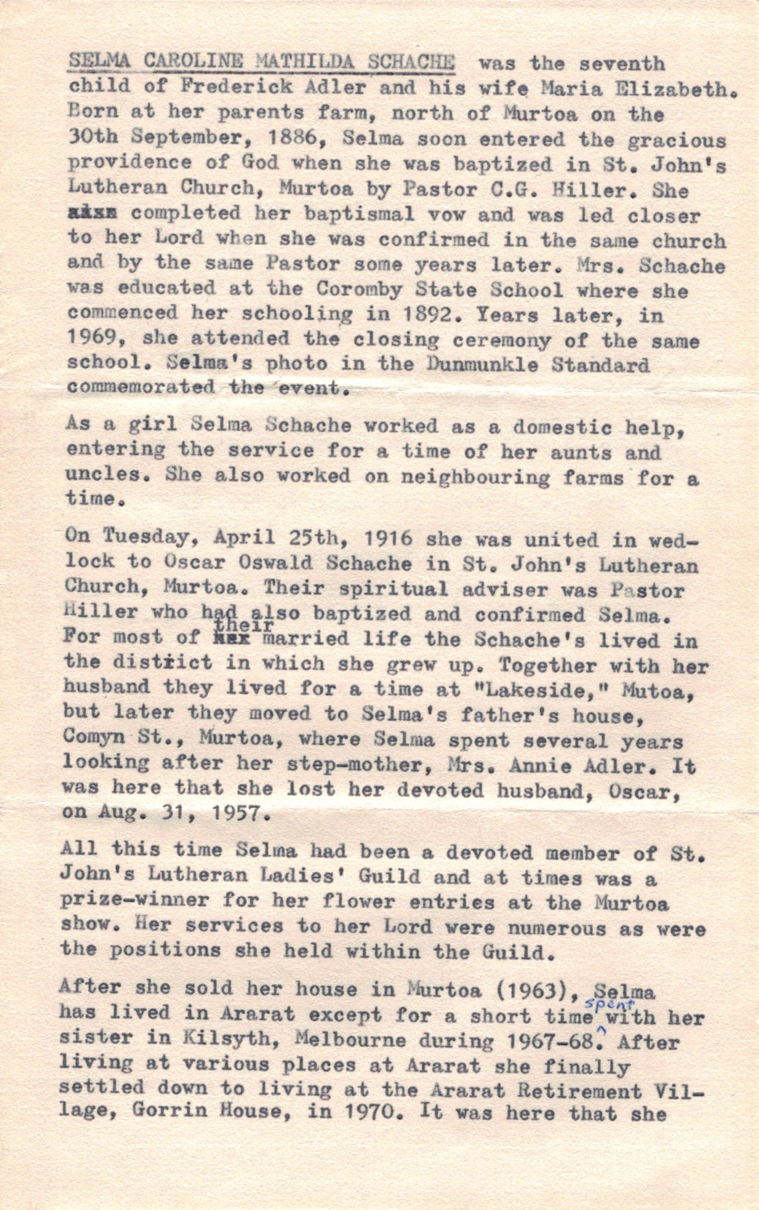 Obituary for Selma Schache, funeral Ararat, Vic., 22 April 1977, Pastor J. H. Kirchner.Montrose Church of Christ newsletter, 19 June 1977, page 1 [JAS].