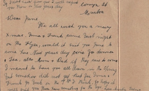 Letter in a card with needles, Selma Schache (Ader) to June Schubert (Bawden), Warracknabeal, Vic., c. late 1940s.