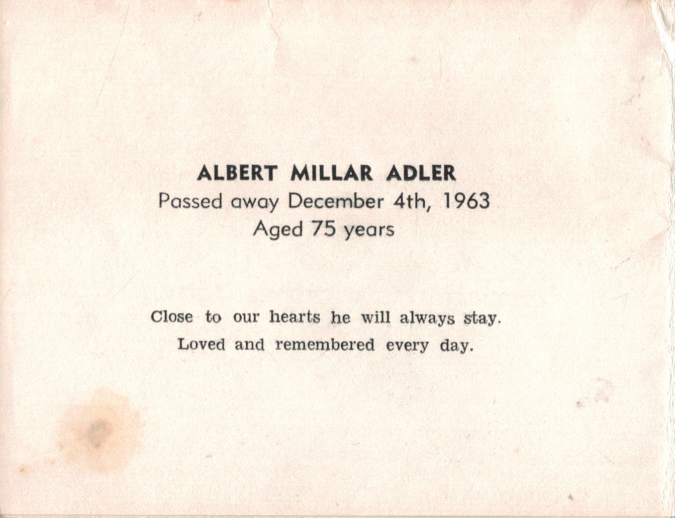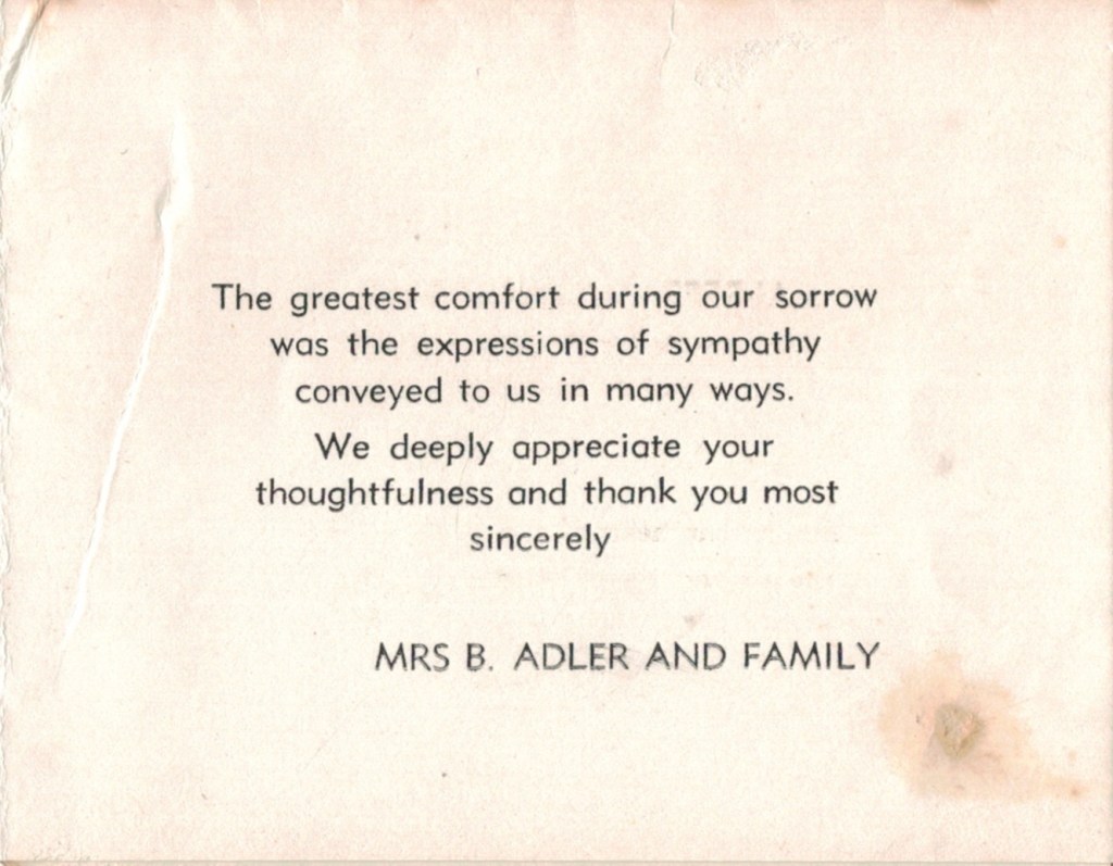 Documents and Memorabilia (1.5.3 ADLER) Bereavement thanks card for Albert Adler, 1963 [Winnie Schubert (Adler)].