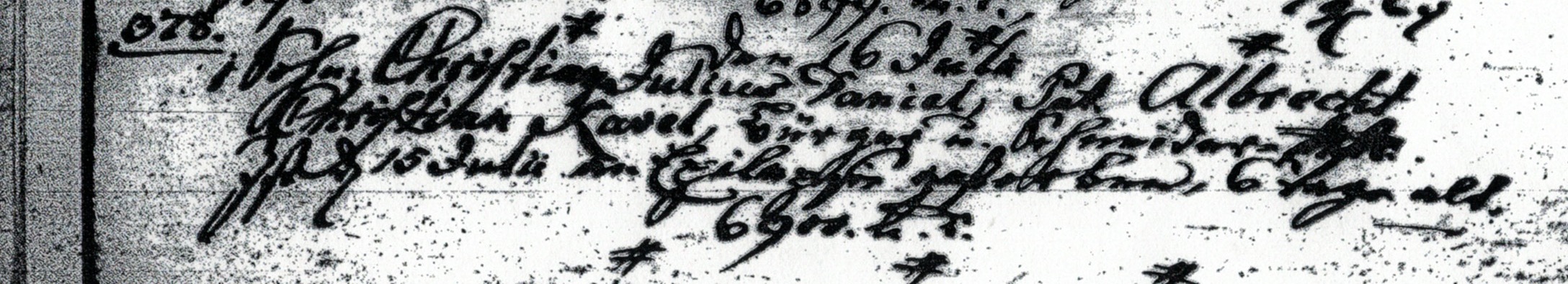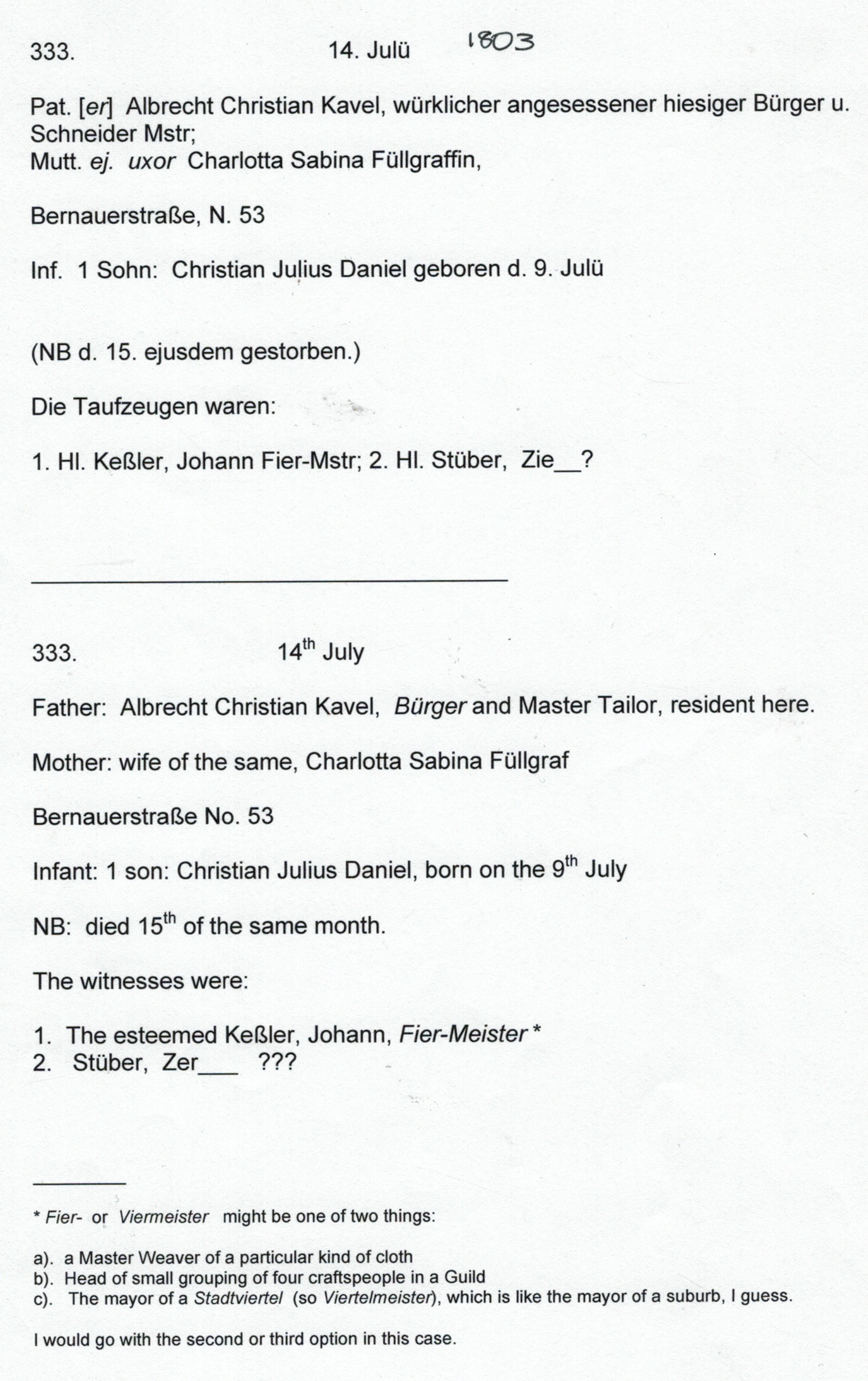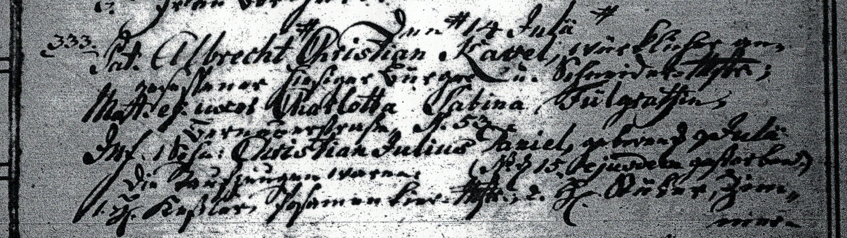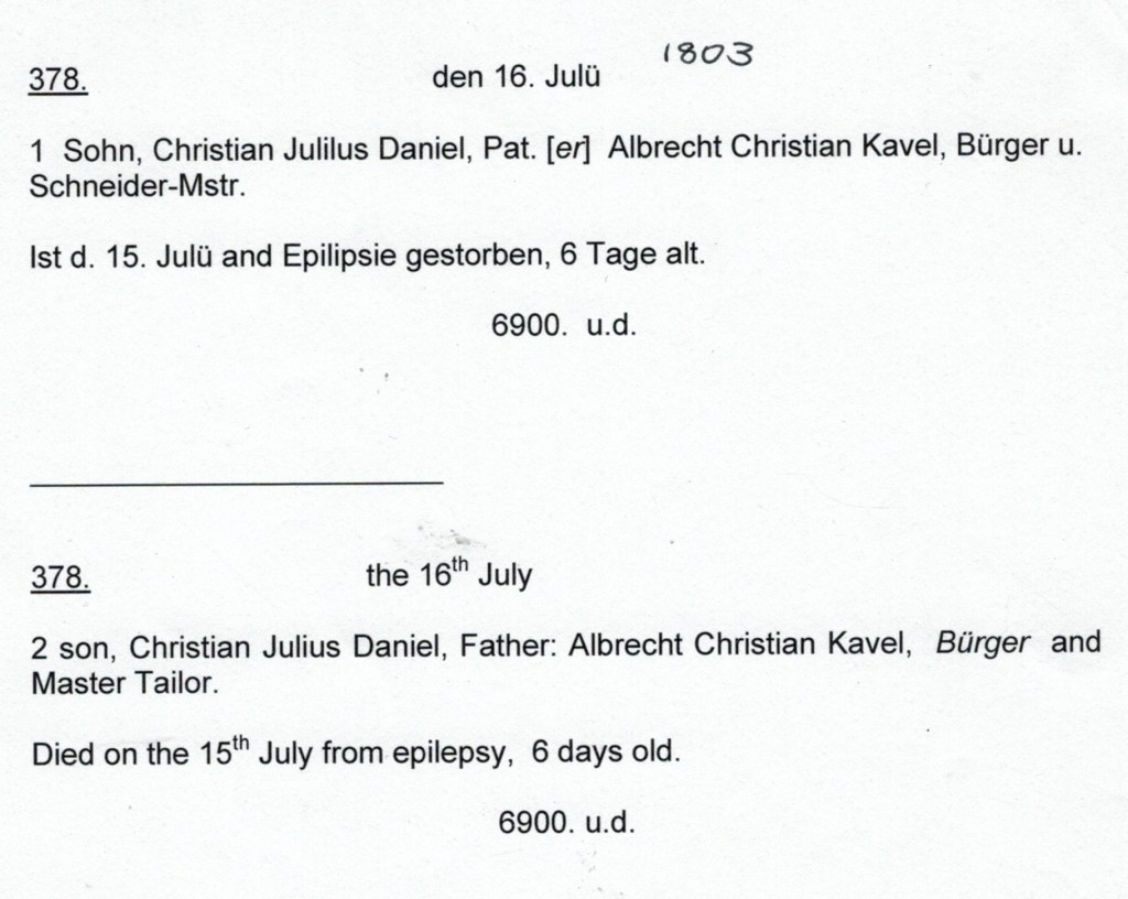 Burial record for Julius Kavel at the Evangelische Sankt Georgenkirche (Evangelical St. George Church), Berlin, 1803 [transcription and translation by Herbert Mees].
