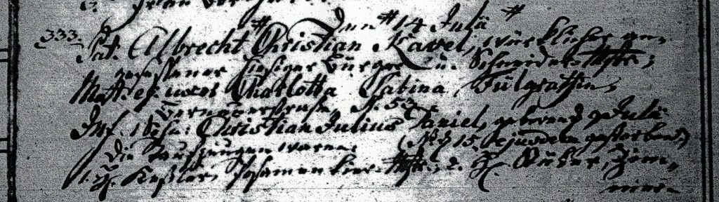 Baptismal record for Julius Kavel at the Evangelische Sankt Georgenkirche (Evangelical St. George Church), Berlin, 1803 [transcription and translation by Herbert Mees].