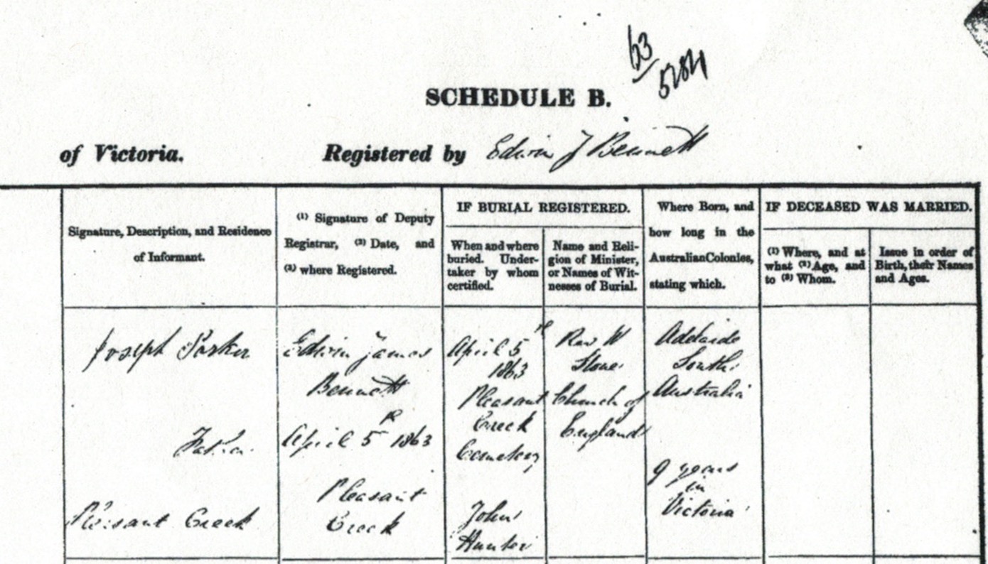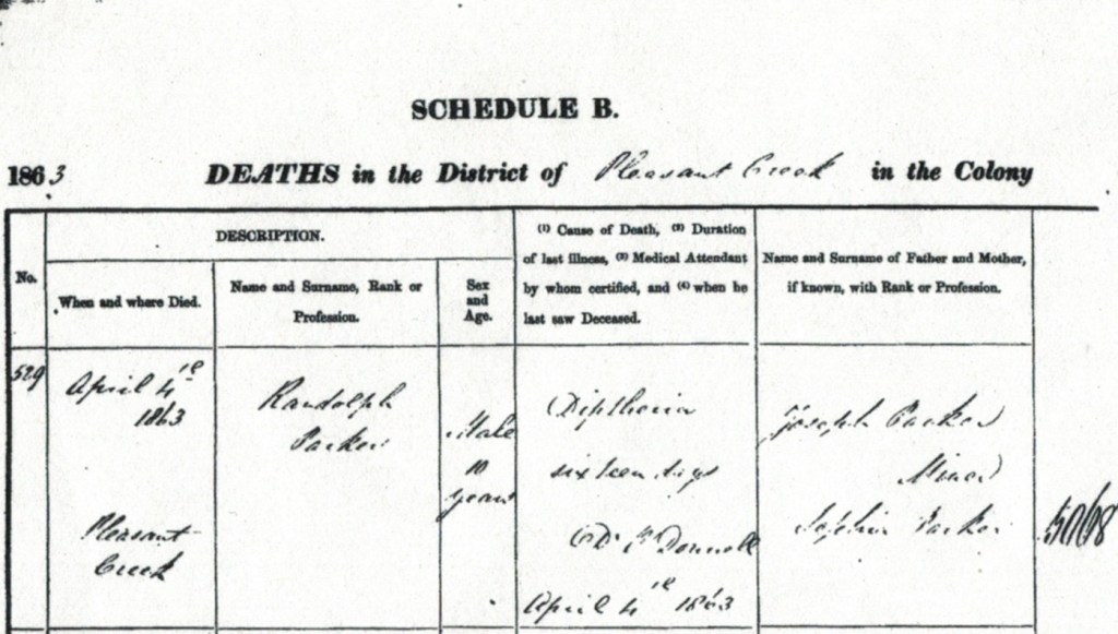 Documents and Memorabilia (1.5 PARKER) Death registration of Randolph Parker, Pleasant Creek (Stawell), Vic., 1863 [BDMVic./Joy Quinn].