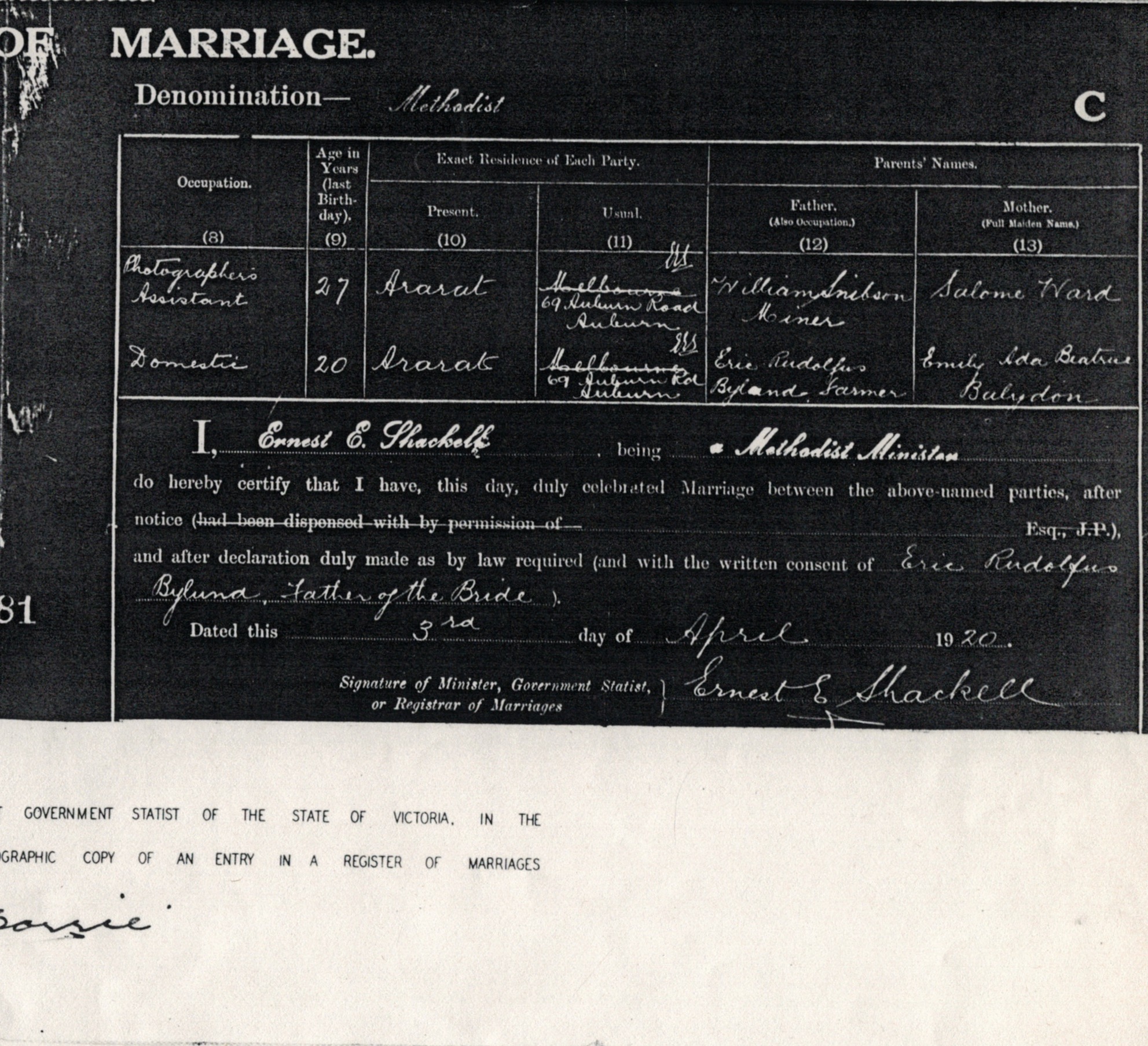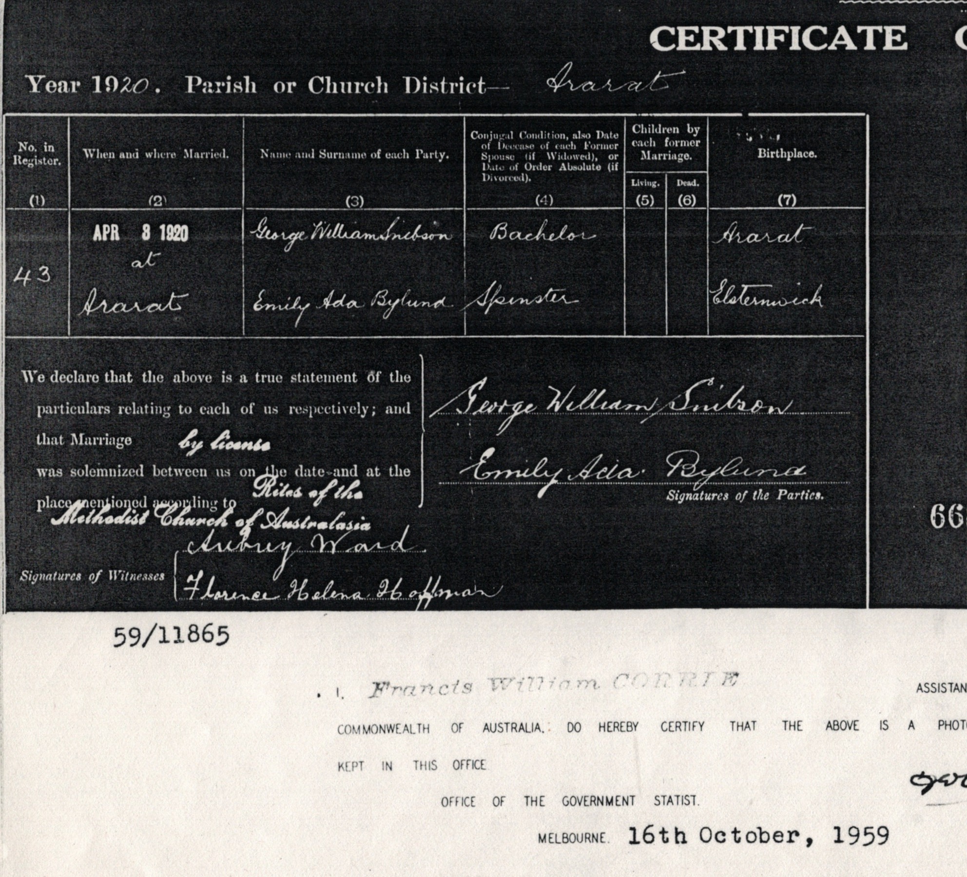 Documents and Memorabilia (1.6.1 SNIBSON) Marriage registration of George and Emily Snibson (Bylund), Ararat, Vic., 1920 [BDMVic., 1959].