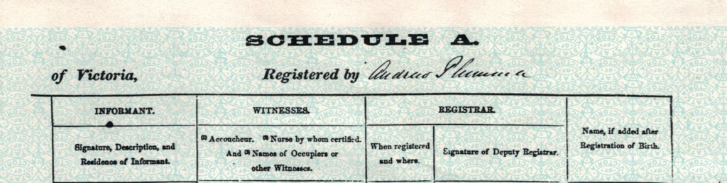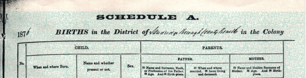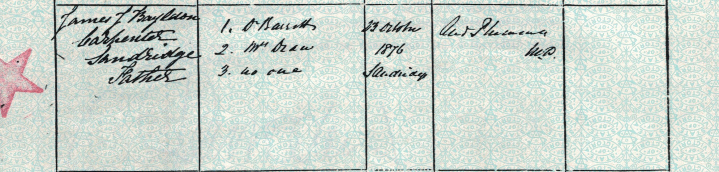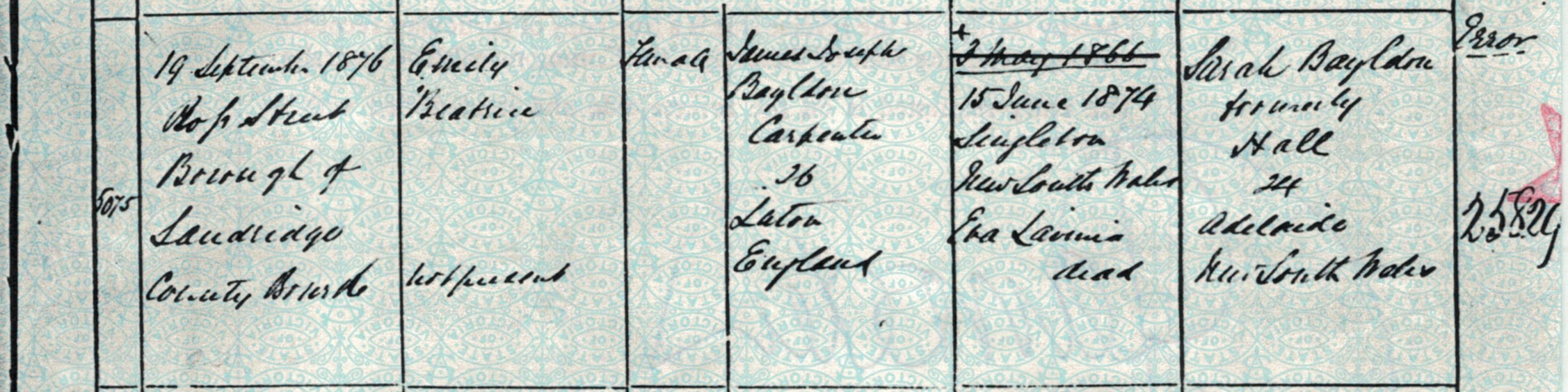 Documents and Memorabilia (1.6.2 BAYLDON) Birth registraton of Ada Bayldon (Bylund/McCay), Sandridge (Port Melbourne), Vic., 1876 [BDMVic.).