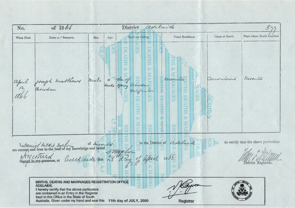 Documents and Memorabilia (1.6 BAWDEN) Death registration of Joseph Bawden, Moonta, SA, 1866 [BDMSA].
