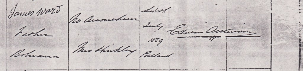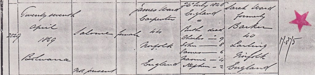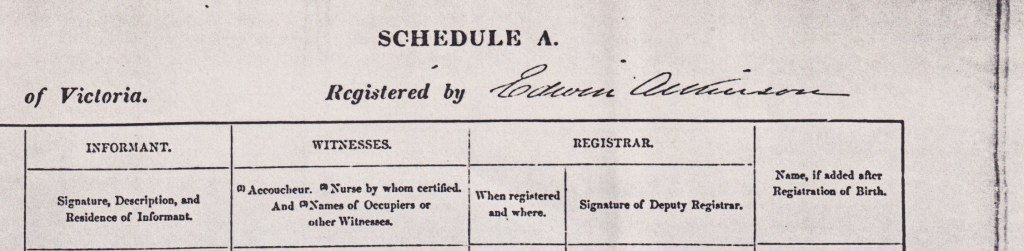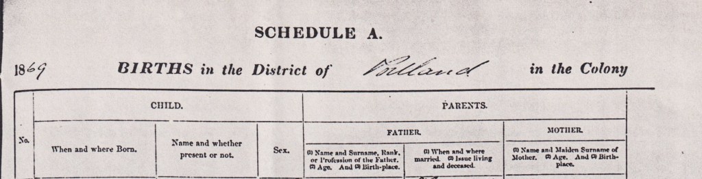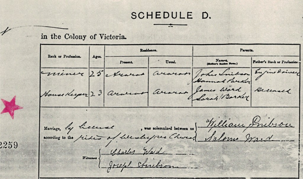 Documents and Memorabilia (1.6 SNIBSON) Birth registration of Salome Ward, Portland, Vic., 1869 [BDMVic. 1988]. Marriage registration of William and Salome Snibson (Ward), Ararat, Vic., 1892 [BDMVic., 1988].