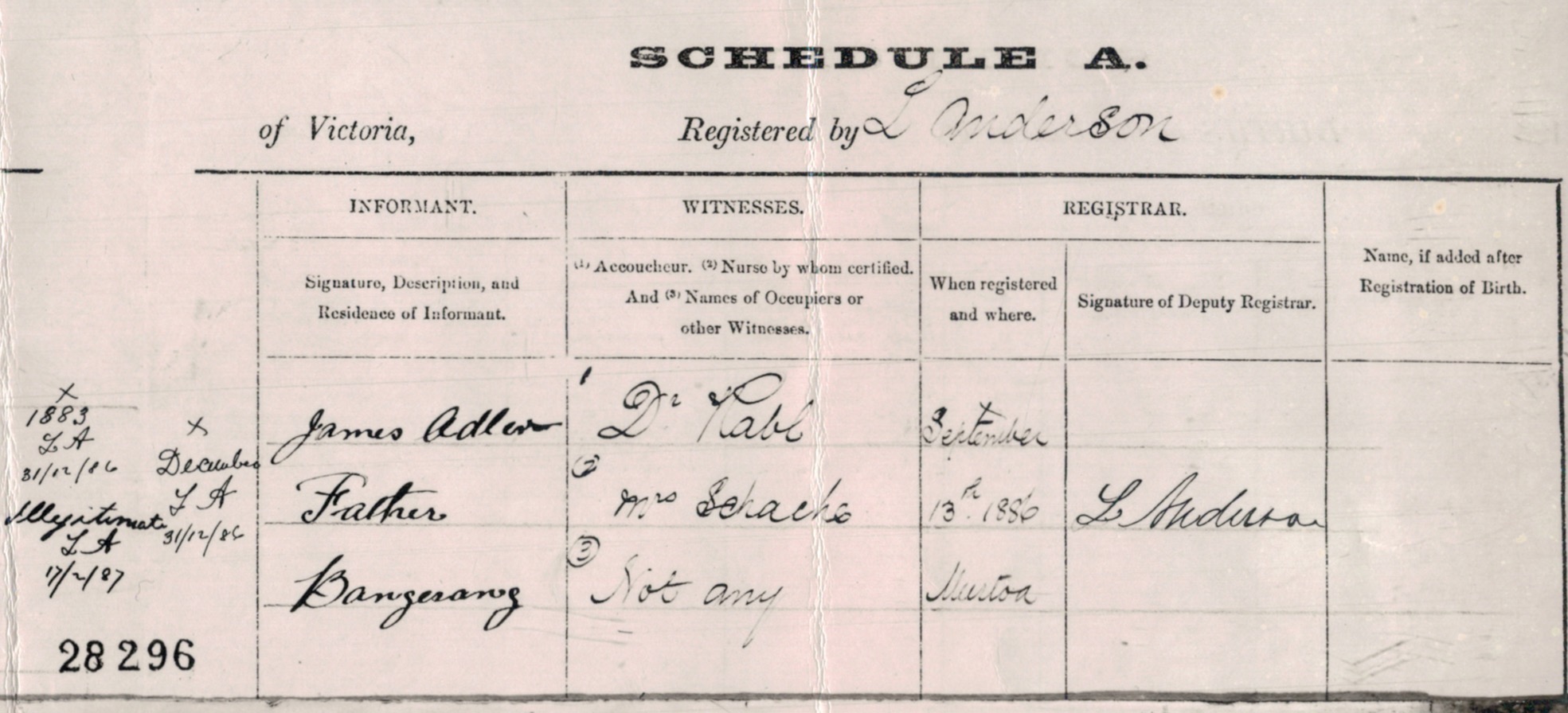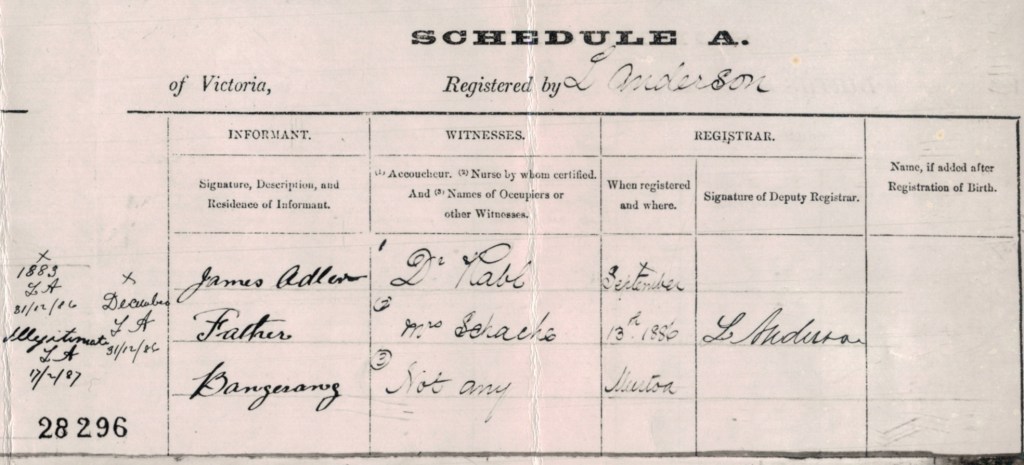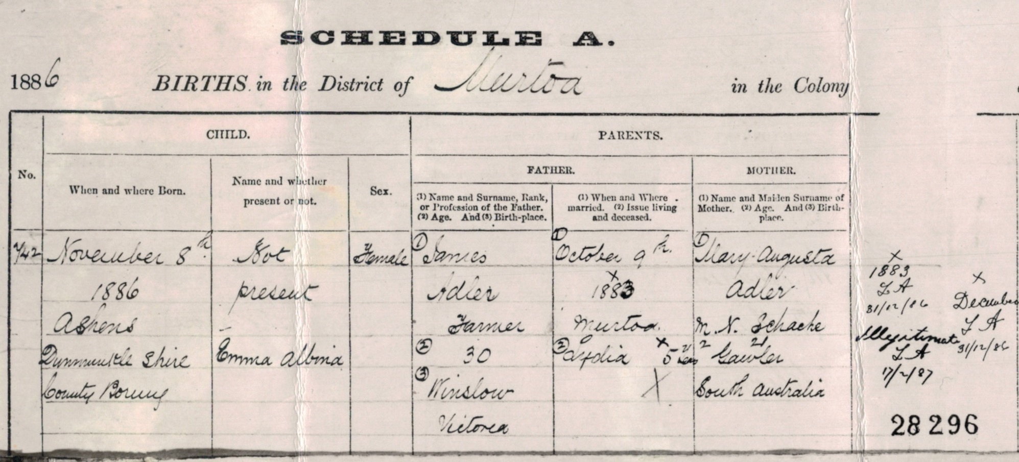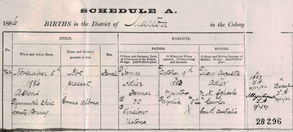 Documents and Memorabilia (1.7.2 ADLER) Birth certificate of Emma Adler, Murtoa, Vic. [BDMVic., 1985].