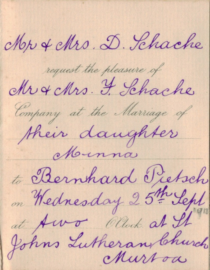 Documents and Memorabilia (1.7.7.1 SCHACHE) Wedding invitation for Ben and Minna Pietsch (Schache), Murtoa, 1918 [Tess Hausler (Schache)].