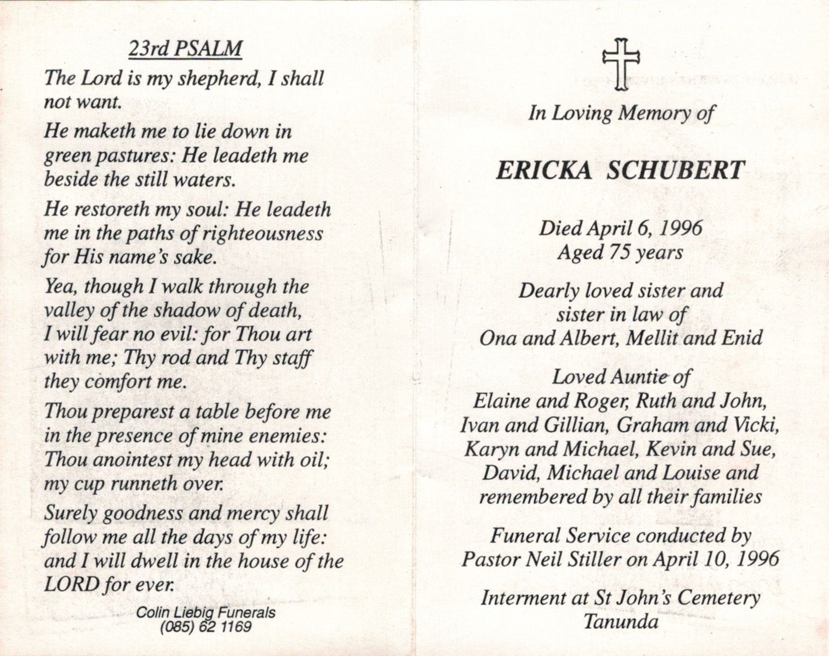 Documents and Memorabilia (1.8.11.1 SCHUBERT) Bereavement card for Erika Schubert, 1996 [Mellit Schubert].