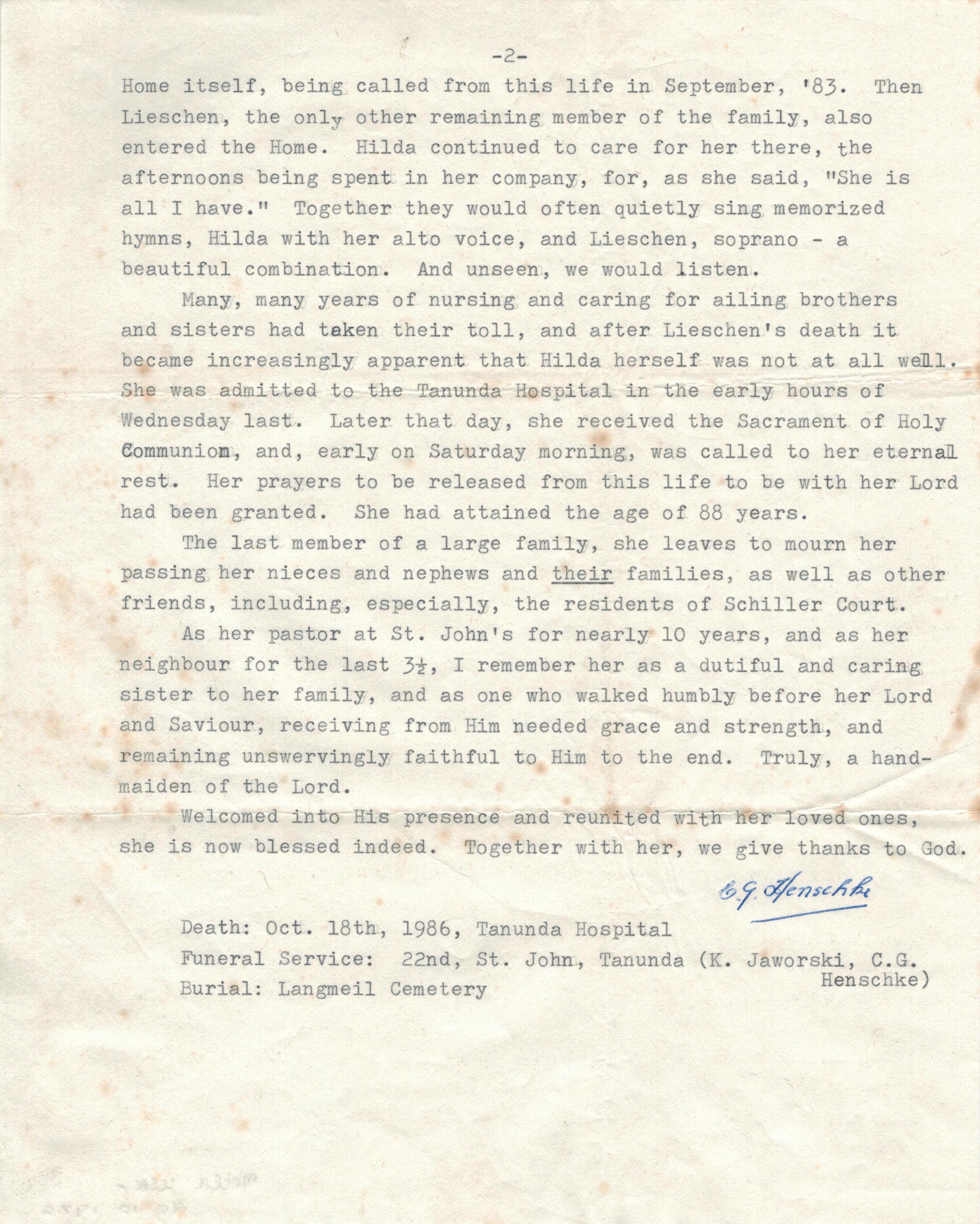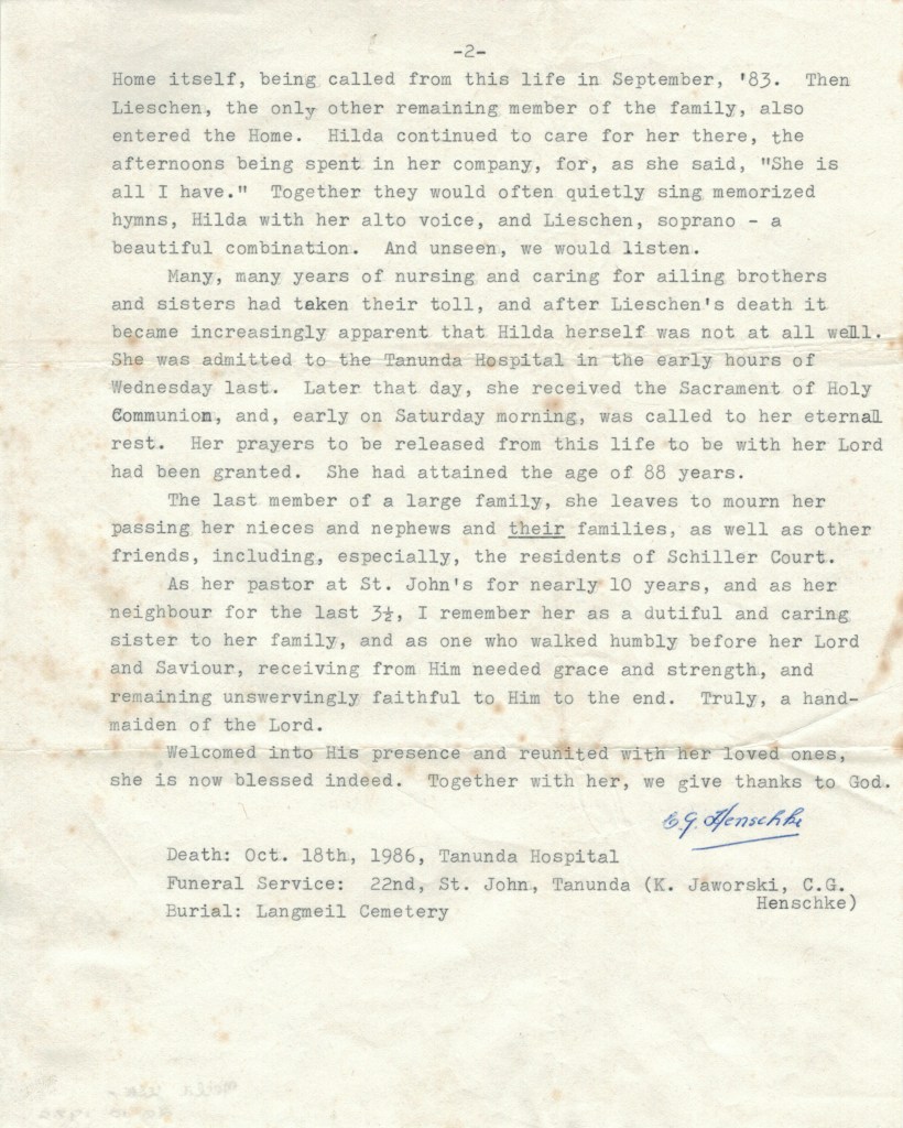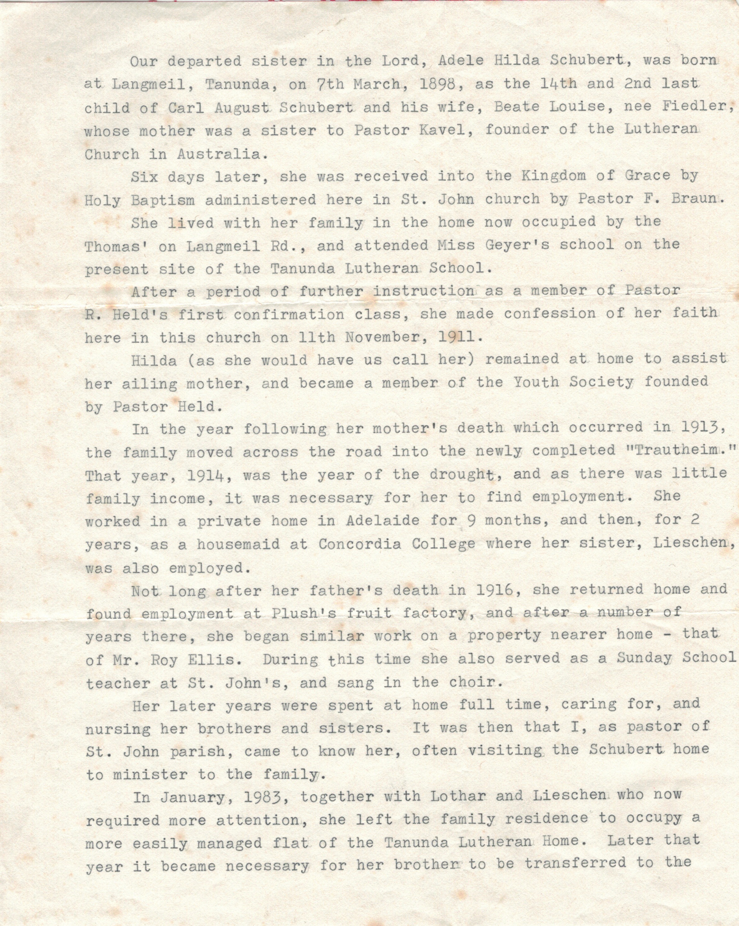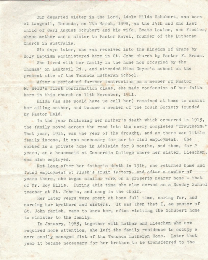 Documents and Memorabilia (1.8.14 SCHUBERT) Eulogy for Hilda Schubert, St. John’s Lutheran Church, Tanunda, SA, 22 October 1986.