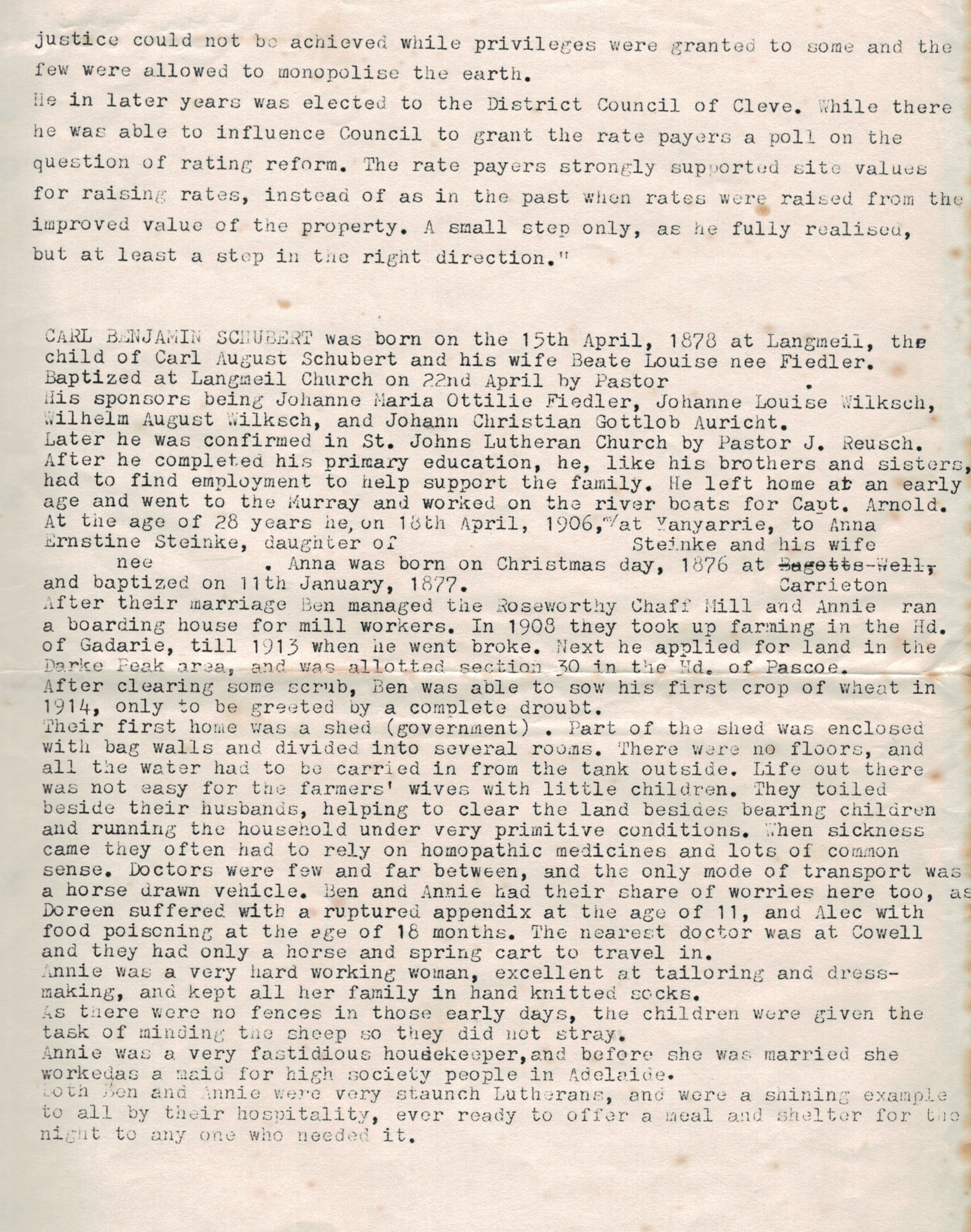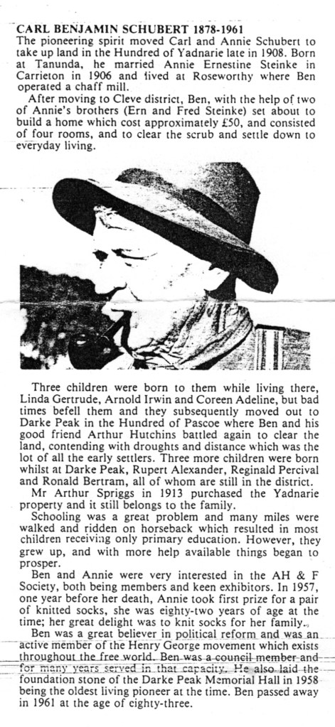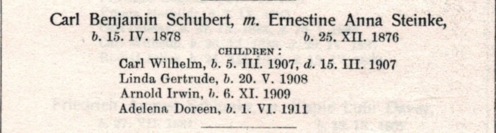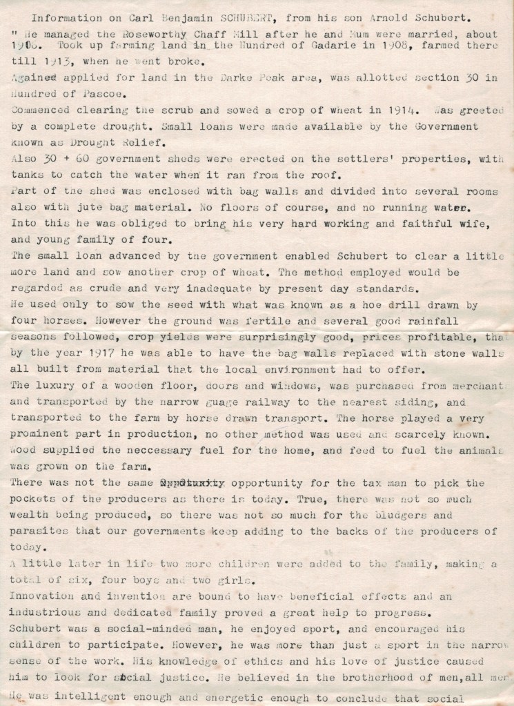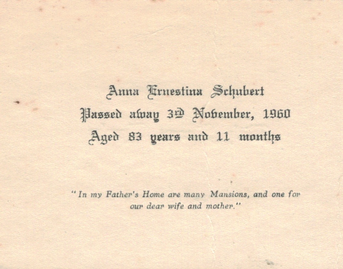 Documents and Memorabilia (1.8.3 SCHUBERT) “Family Registers” (Dulwich, SA) 6 January 1912 (extract). Bereavement thanks card (part) for Annie Schubert (Steinke), 1960 [Winnie Schubert (Adler)]. Source unknown [Karen Hall (Hann)]. Biographical account of Ben Schubert (from Arnold Schubert) [Hilda Frahn (Hoff)].