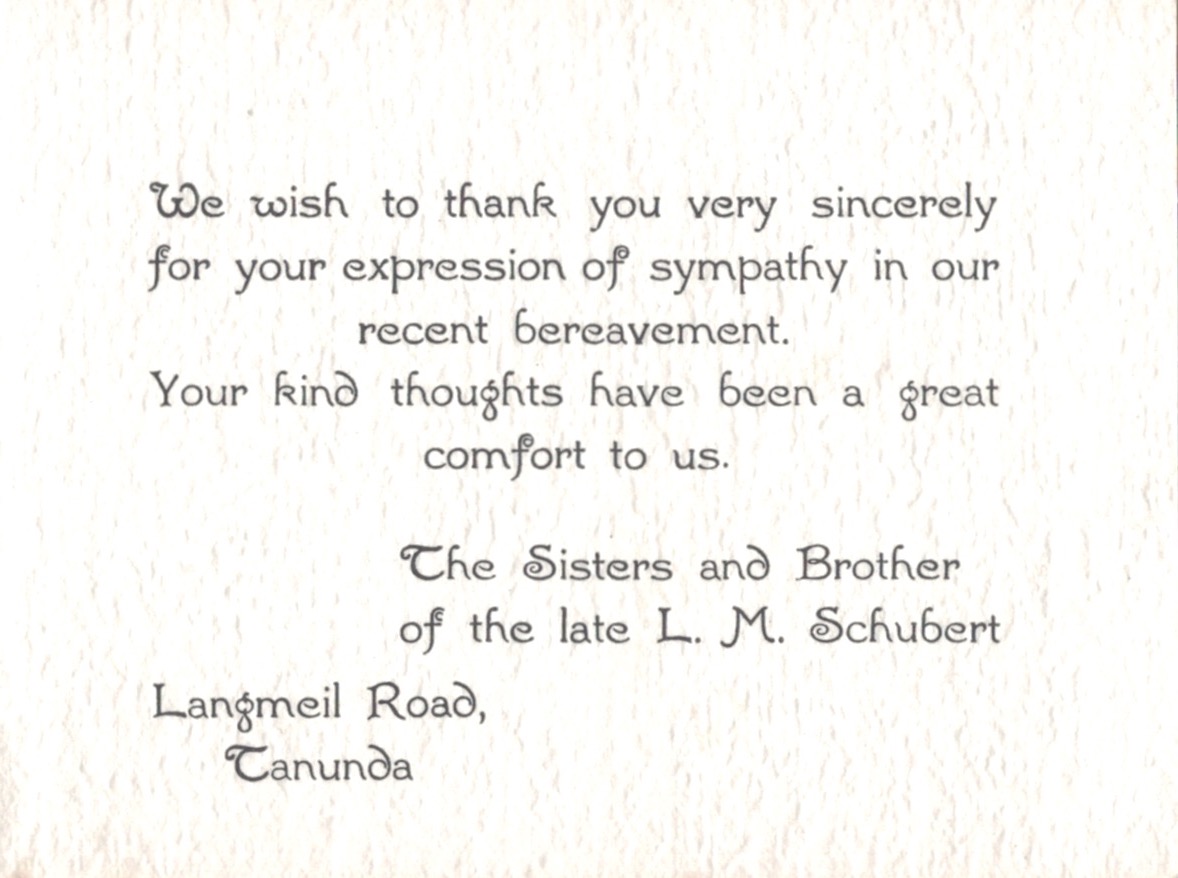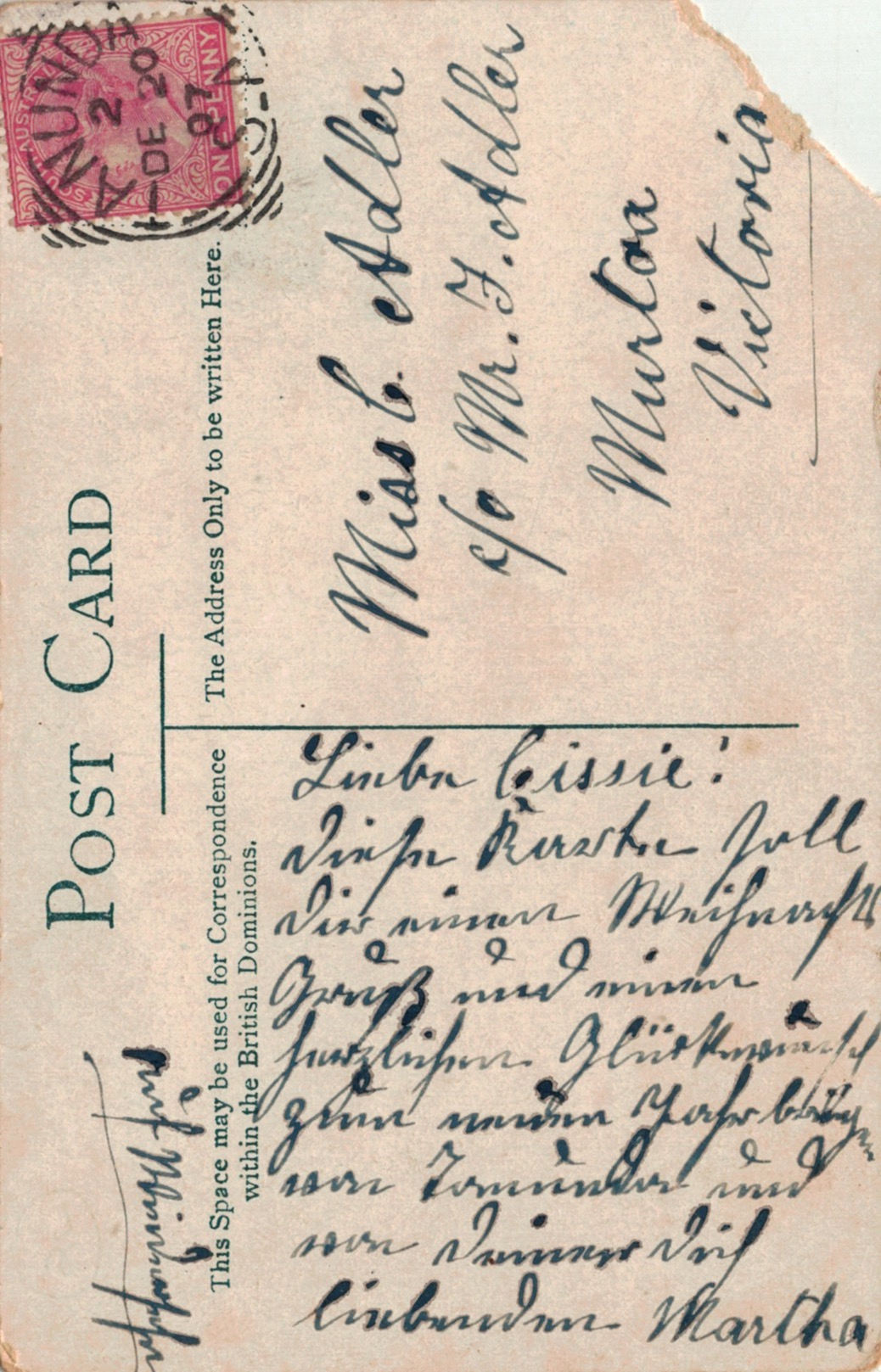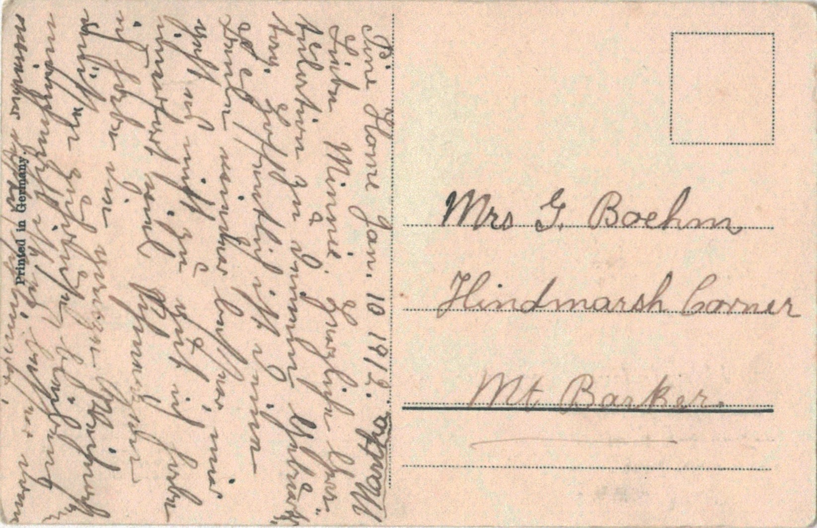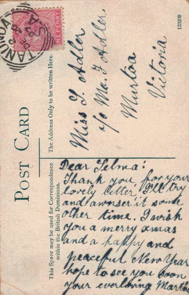 Documents and Memorabilia (1.8.5 SCHUBERT) Inscriptions in Royal Readers Third Reading Book used by Schubert siblings (Martha, August and Ossie). Postcard sent to Selma Adler (later Schache; c/o Mr F Adler, Murtoa, Vic.) by Martha Schubert, December 1907. Inscription on reverse of photograph above. Postcard sent to Cis Adler (c/o Mr F Adler, Murtoa, Vic.) by Martha Schubert, December 1907. Inscription on reverse of photograph above. Postcard from Martha Schubert to Minnie Boehm (Schubert), 1912 [Pam Elliott]. Postcard from Martha Schubert to Minnie Boehm (Schubert), 1912 [Pam Elliott]. Bereavement thanks card for Martha Schubert, 1966.