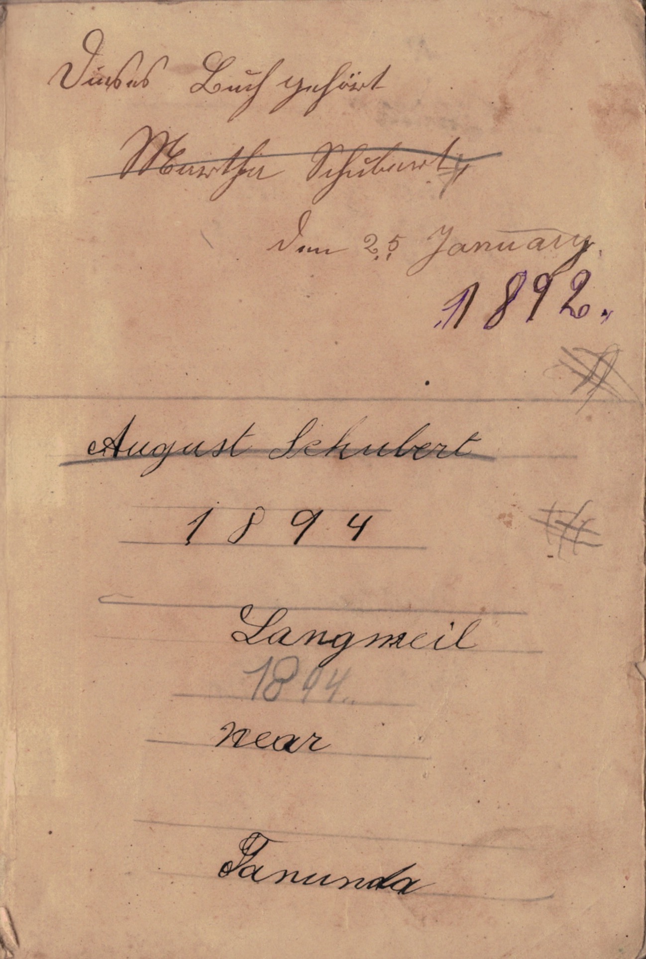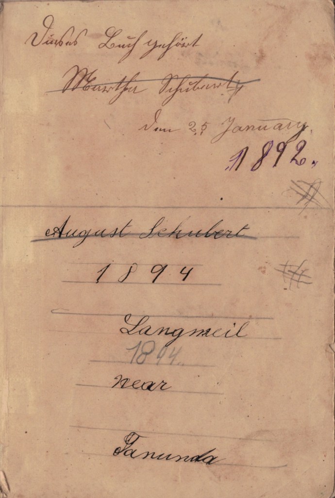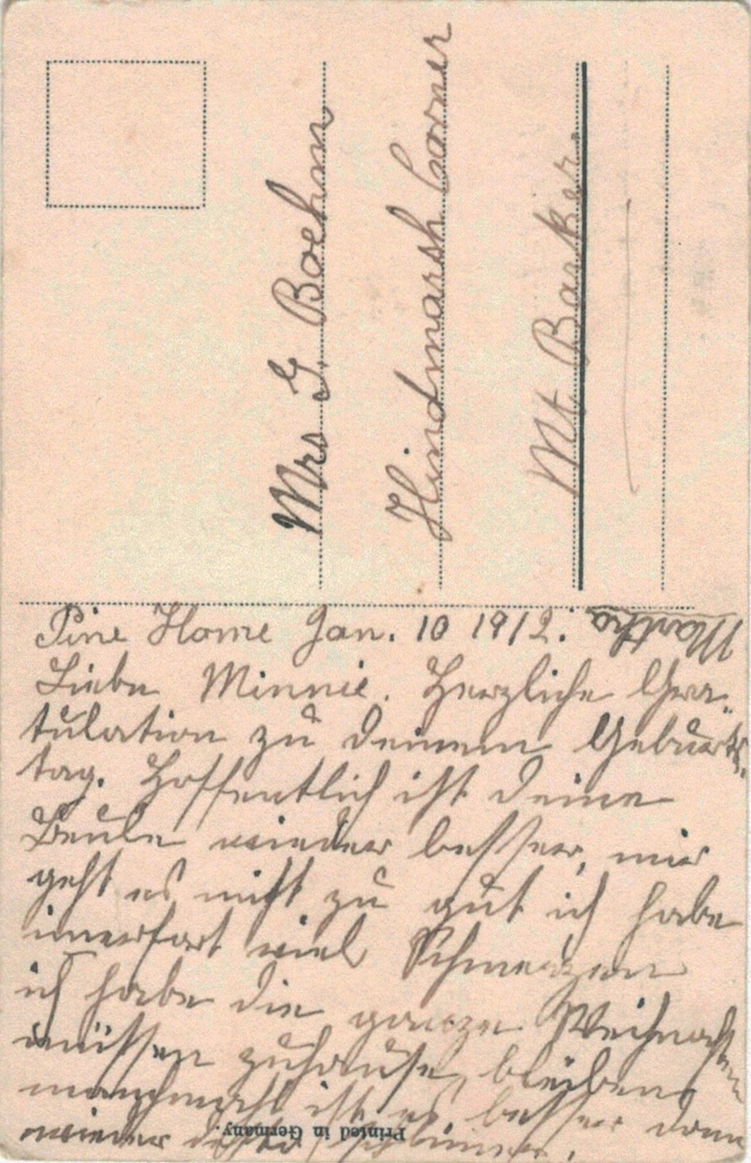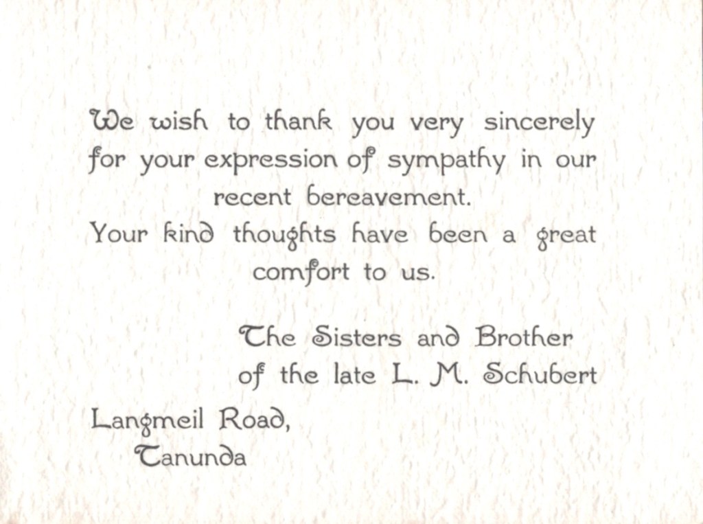 Documents and Memorabilia (1.8.5 SCHUBERT) Inscriptions in Royal Readers Third Reading Book used by Schubert siblings (Martha, August and Ossie). Postcard sent to Selma Adler (later Schache; c/o Mr F Adler, Murtoa, Vic.) by Martha Schubert, December 1907. Inscription on reverse of photograph above. Postcard sent to Cis Adler (c/o Mr F Adler, Murtoa, Vic.) by Martha Schubert, December 1907. Inscription on reverse of photograph above. Postcard from Martha Schubert to Minnie Boehm (Schubert), 1912 [Pam Elliott]. Postcard from Martha Schubert to Minnie Boehm (Schubert), 1912 [Pam Elliott]. Bereavement thanks card for Martha Schubert, 1966.