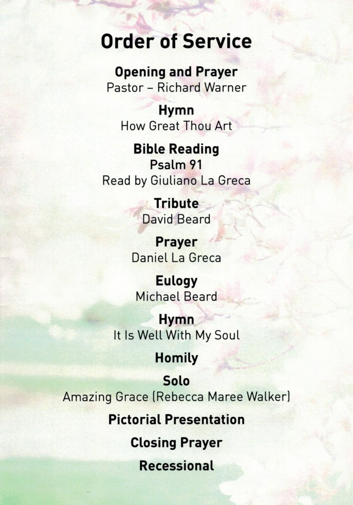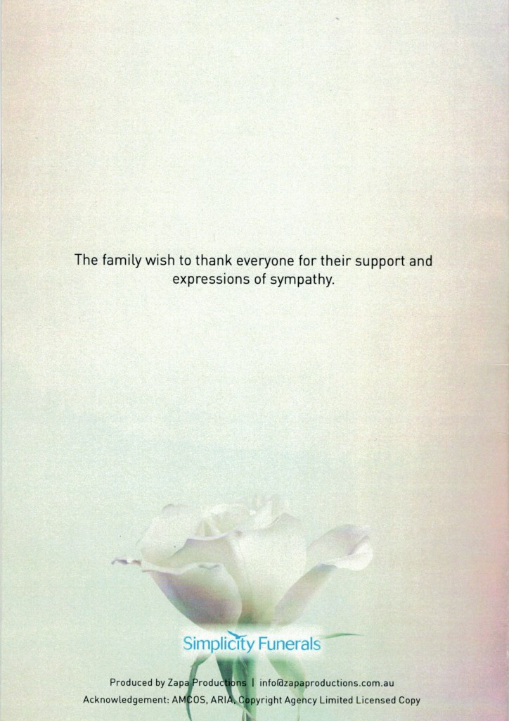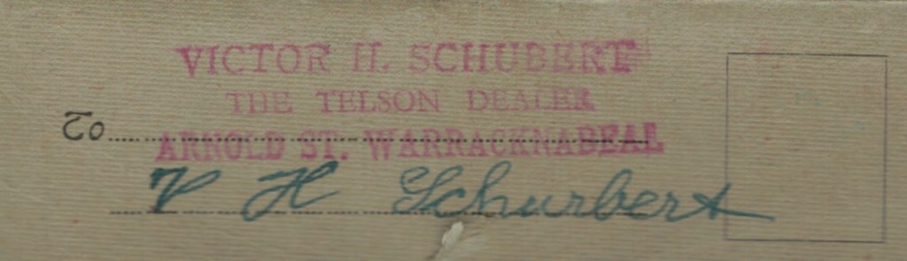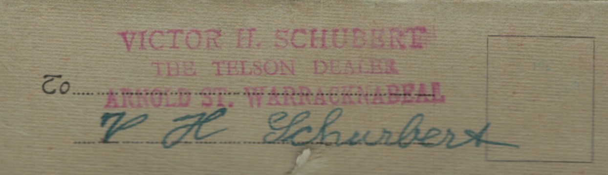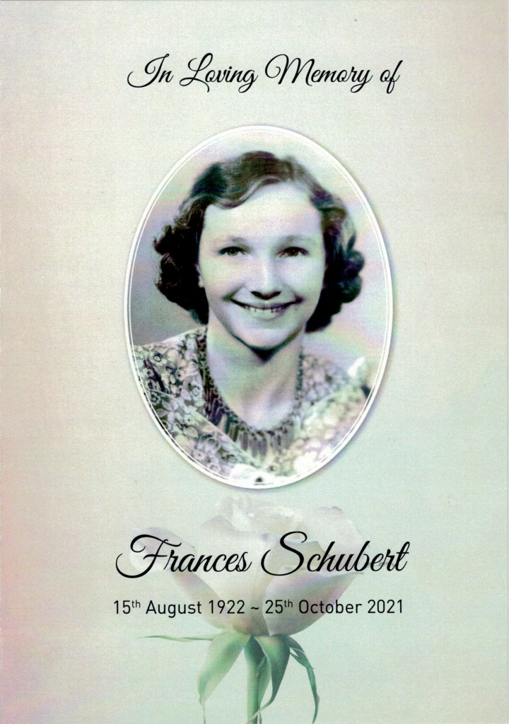 Documents and Memorabilia (1.8.6.1 SCHUBERT) Vic. Schubert’s Telson Dealer stamp. Funeral service order for Frances Schubert (Beard nee Wilson), Springvale, 2021.