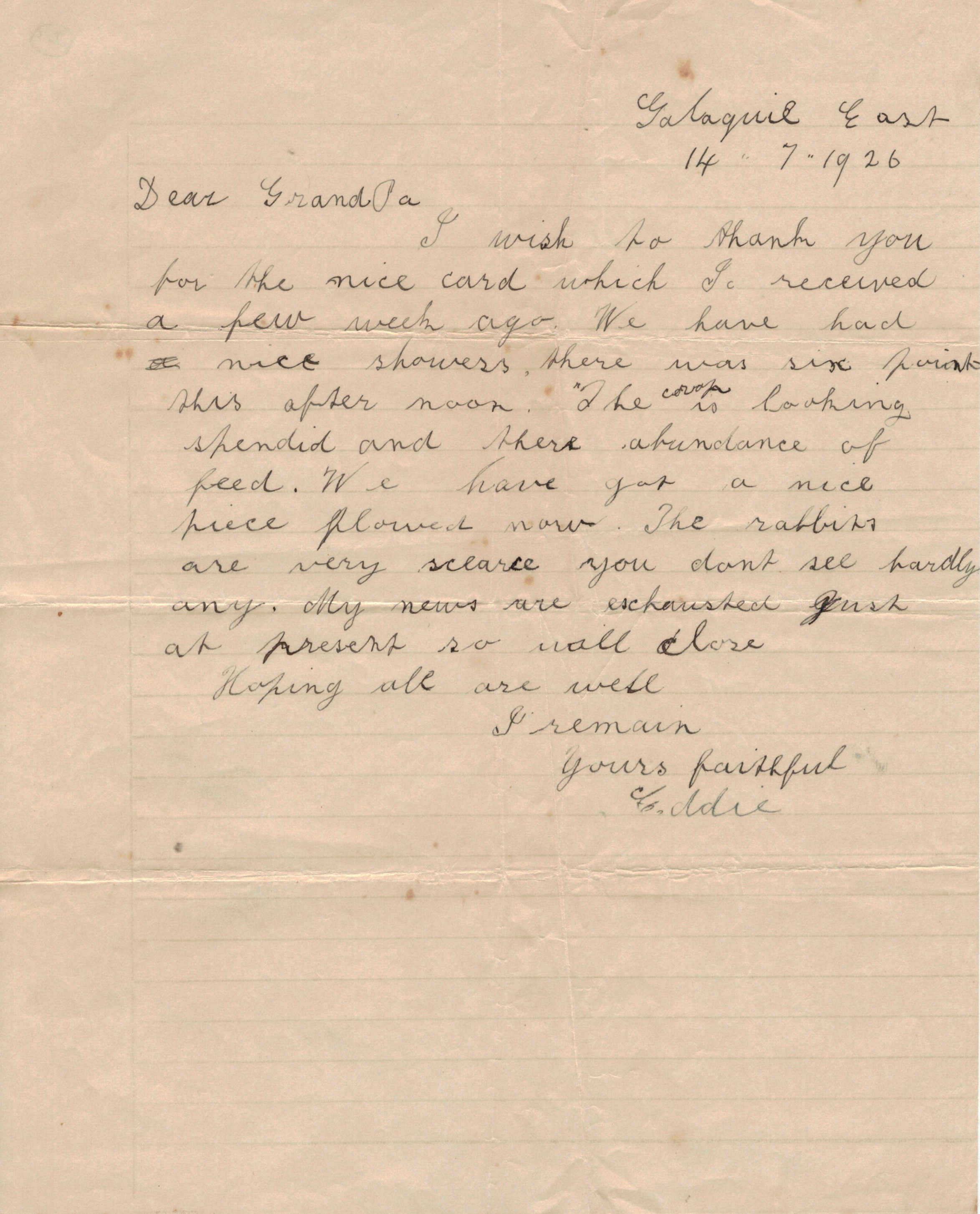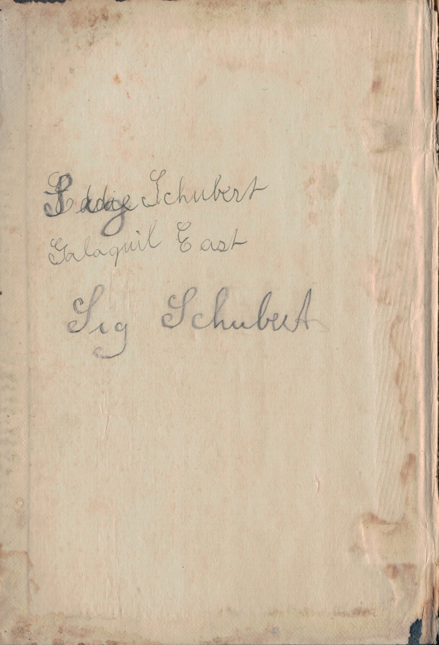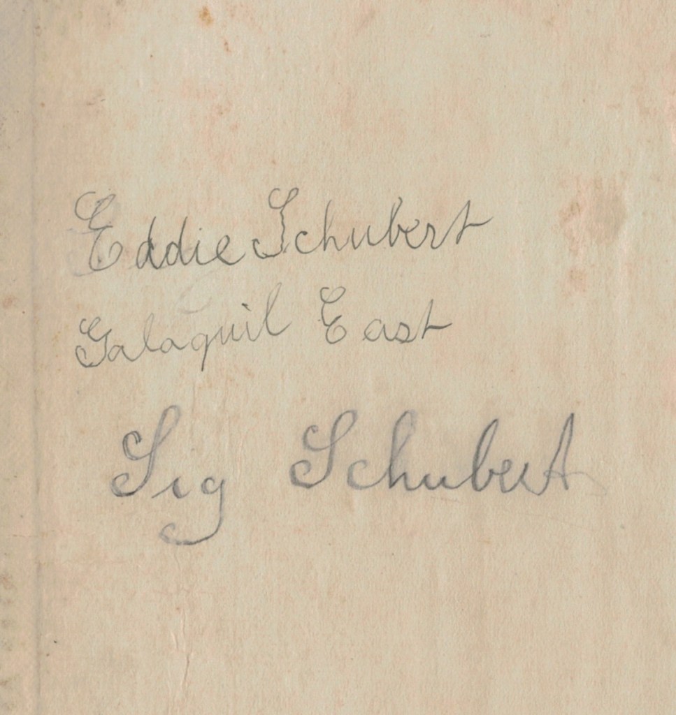 Documents and Memorabilia (1.8.6.2 SCHUBERT) Letter written by Eddie Schubert to his grandfather, Fred Adler, Murtoa Vic. Novel owned and inscribed by Eddie Schubert, later given to his brother Sig.