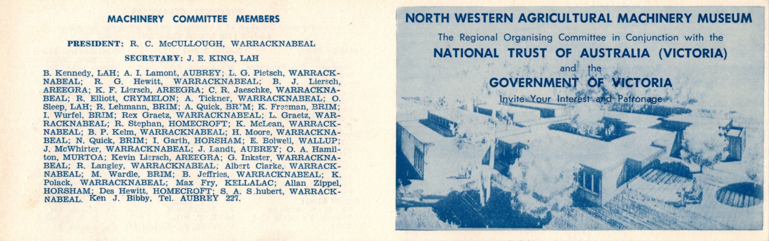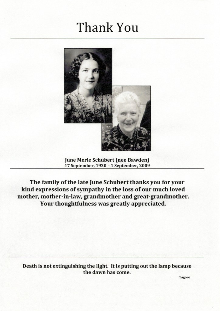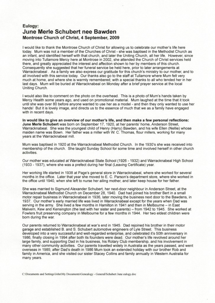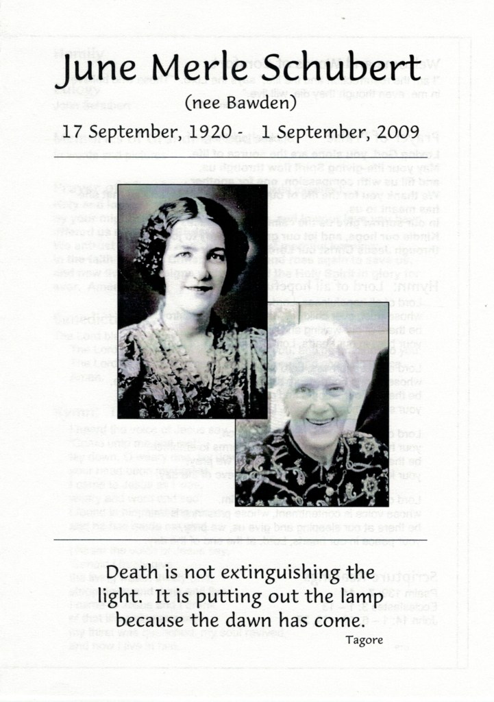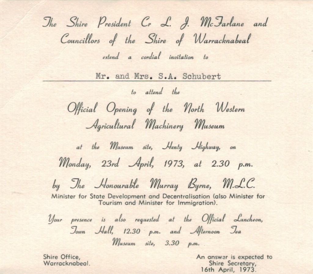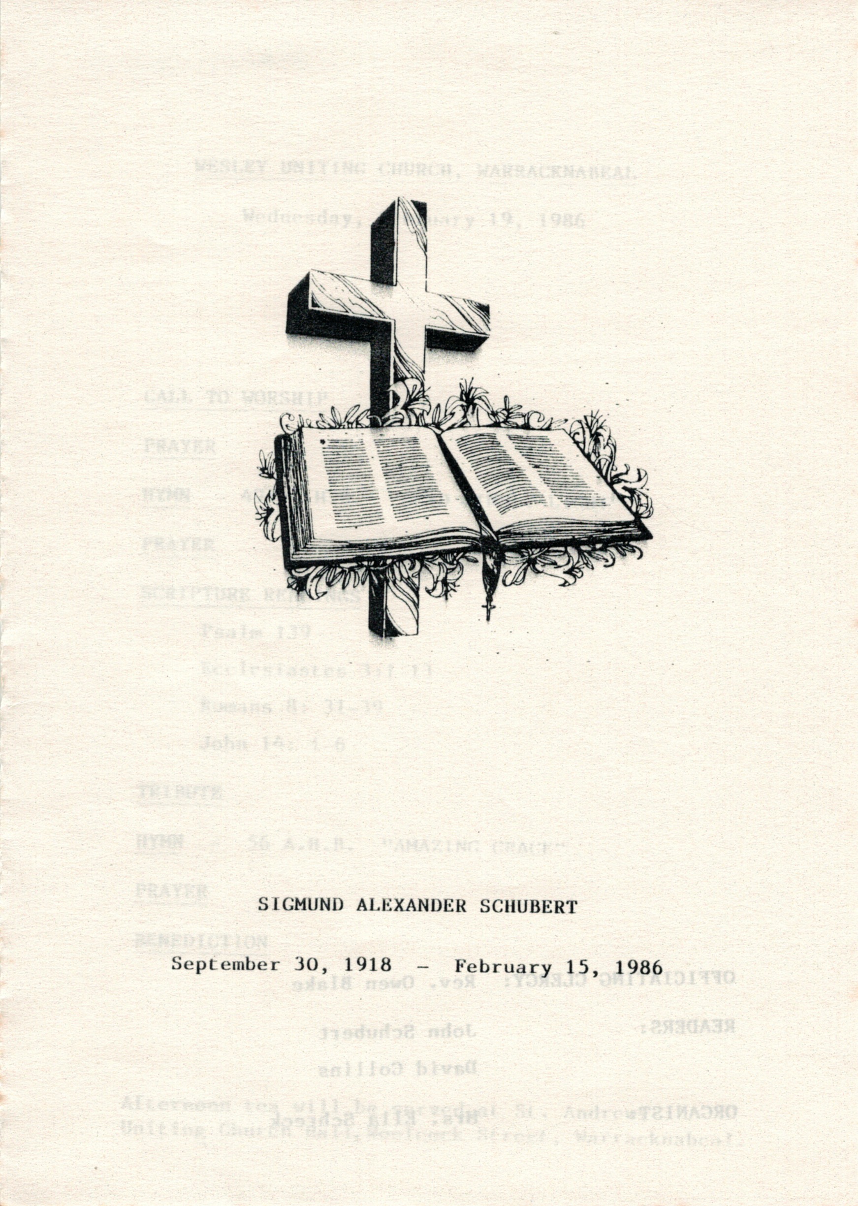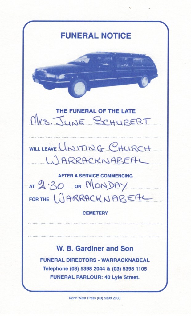 Promotional cards for the establishment of the North Western Agricultural Museum, Warracknabeal, Vic..Invitation to the Opening of the North Western Agricultural Machinery Museum, Warracknabeal (Vic.), Monday 23 April 1973Funeral Service Order for Sig Schubert, Warracknabeal, 1986.R.S.L. Funeral for Sig Schubert, Warracknabeal, 1986.Bereavement card for Sig Schubert, Warracknabeal, 1986.Funeral Service Order for June Schubert (Bawden), Montrose, 2009.Eulogy for June Schubert (Bawden), Montrose, Vic., 2009.Funeral notice for June Schubert (Bawden), originally posted in window of Southend Florist, Warracknabeal, Vic. (Ralph Schubert).Bereavement thanks for June Schubert (Bawden), 2009.Thanksgiving Ceremony, Mercy Place Montrose (Vic.), 2009.