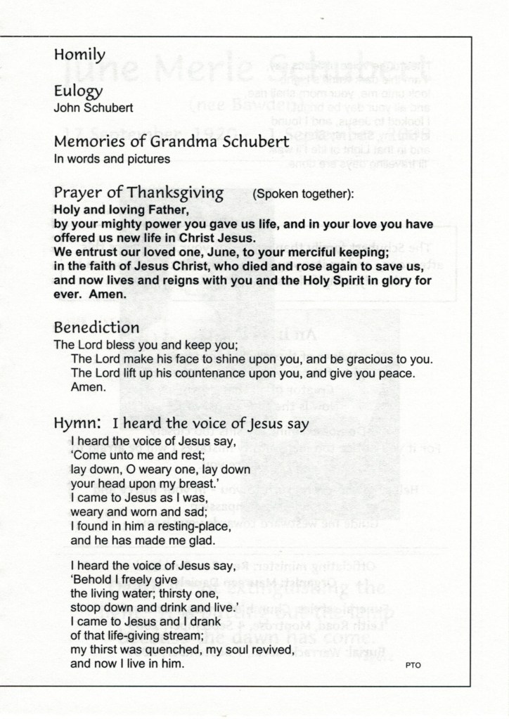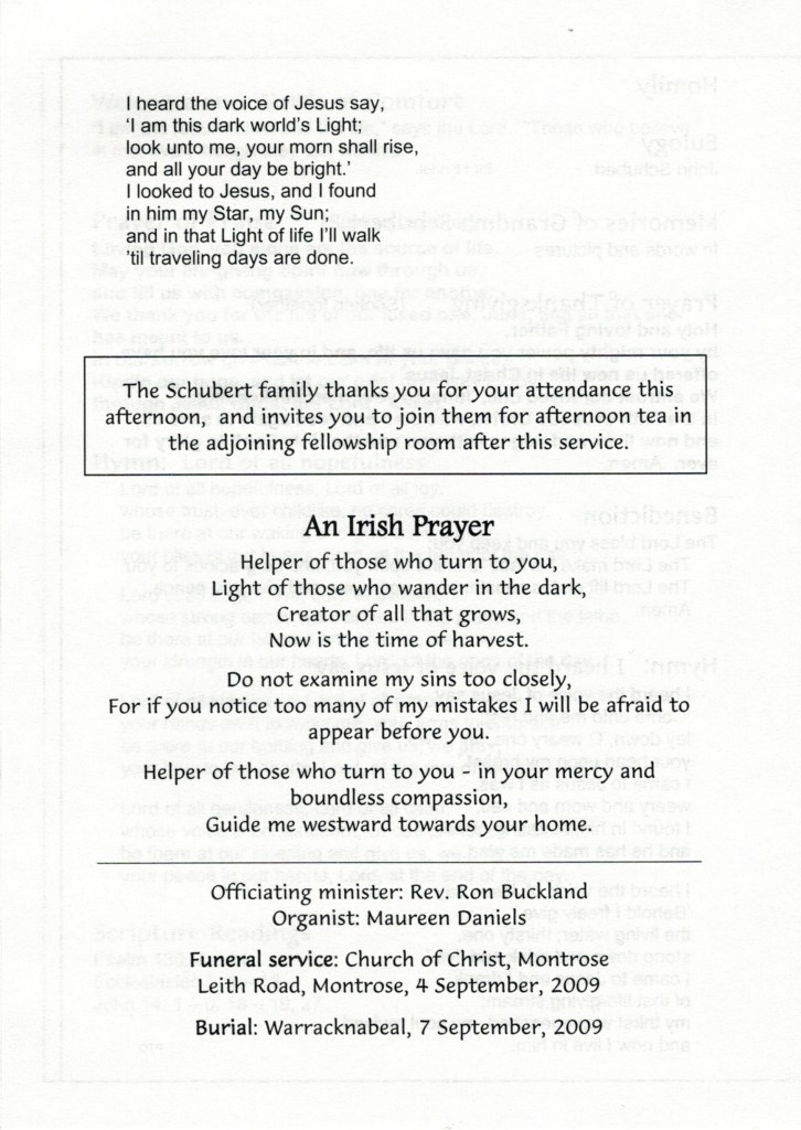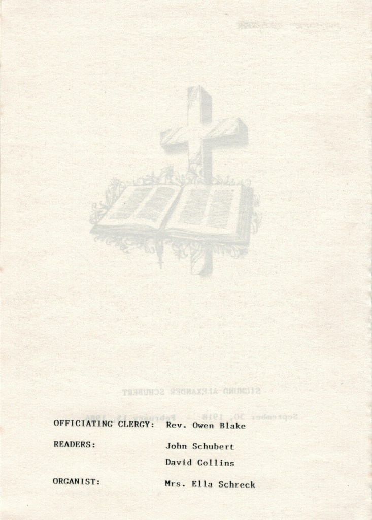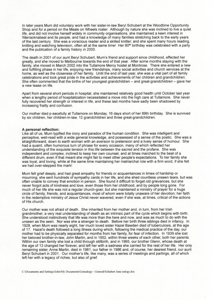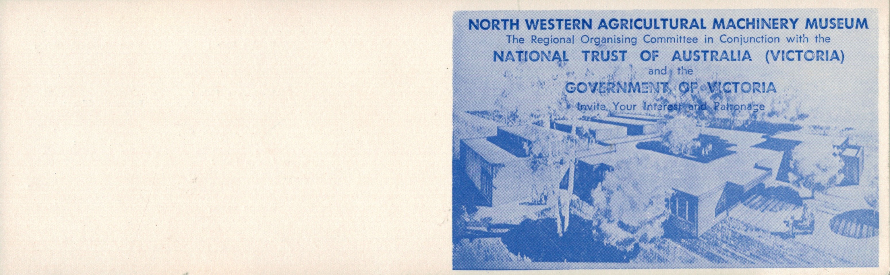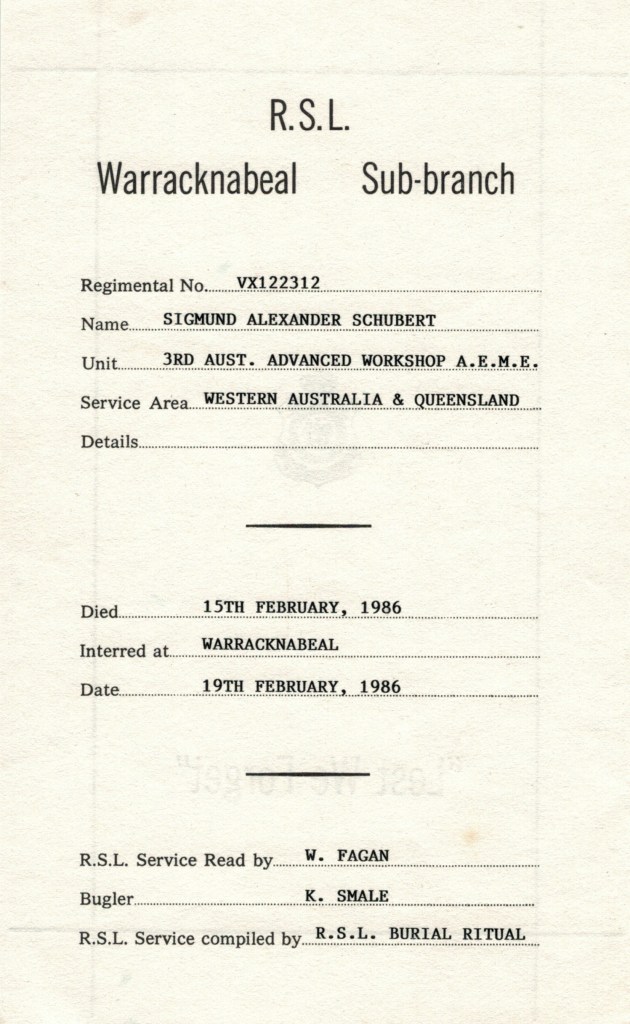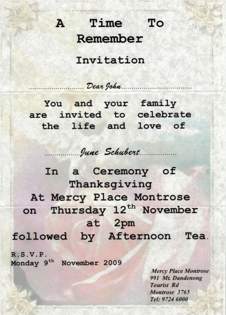 Promotional cards for the establishment of the North Western Agricultural Museum, Warracknabeal, Vic..Invitation to the Opening of the North Western Agricultural Machinery Museum, Warracknabeal (Vic.), Monday 23 April 1973Funeral Service Order for Sig Schubert, Warracknabeal, 1986.R.S.L. Funeral for Sig Schubert, Warracknabeal, 1986.Bereavement card for Sig Schubert, Warracknabeal, 1986.Funeral Service Order for June Schubert (Bawden), Montrose, 2009.Eulogy for June Schubert (Bawden), Montrose, Vic., 2009.Funeral notice for June Schubert (Bawden), originally posted in window of Southend Florist, Warracknabeal, Vic. (Ralph Schubert).Bereavement thanks for June Schubert (Bawden), 2009.Thanksgiving Ceremony, Mercy Place Montrose (Vic.), 2009.