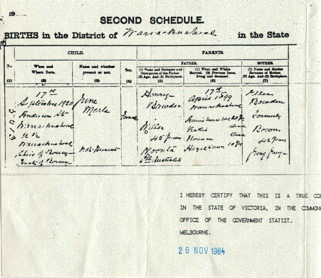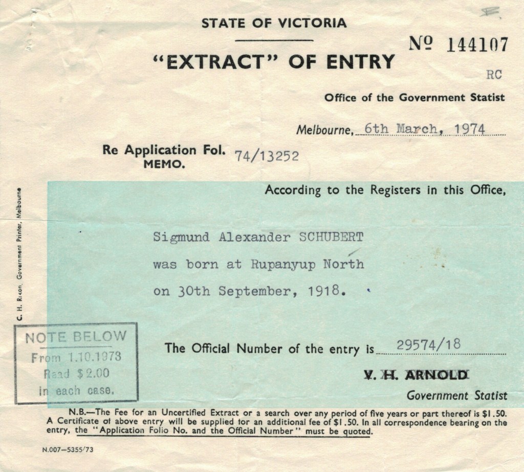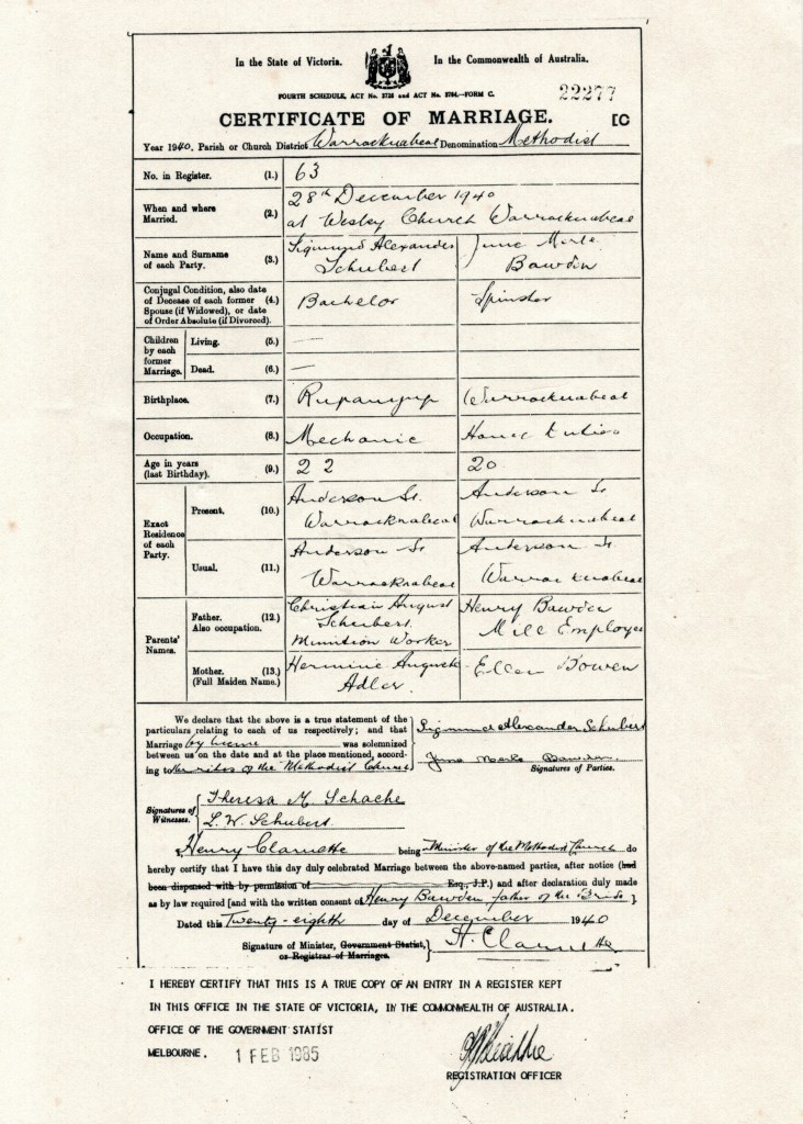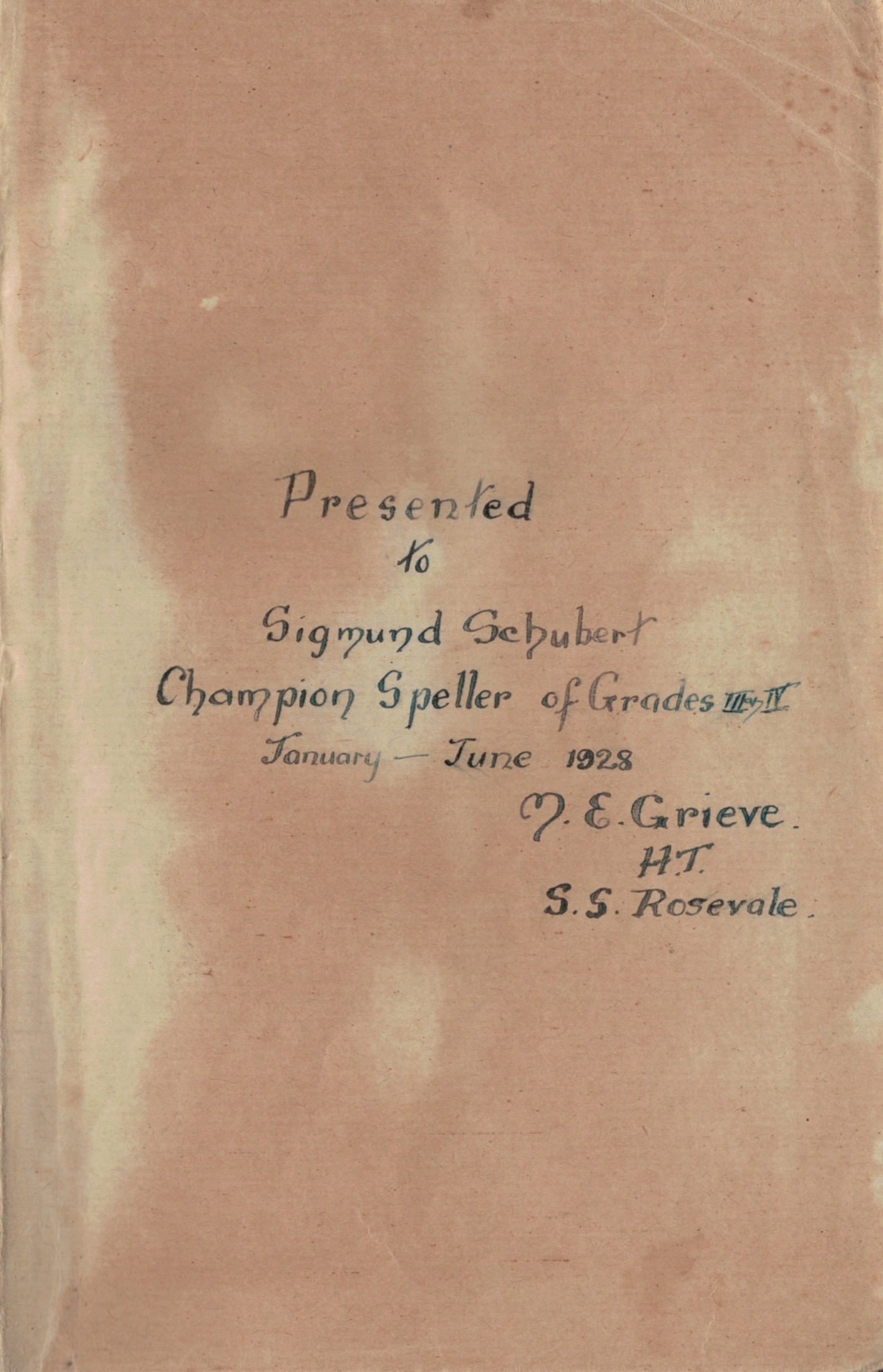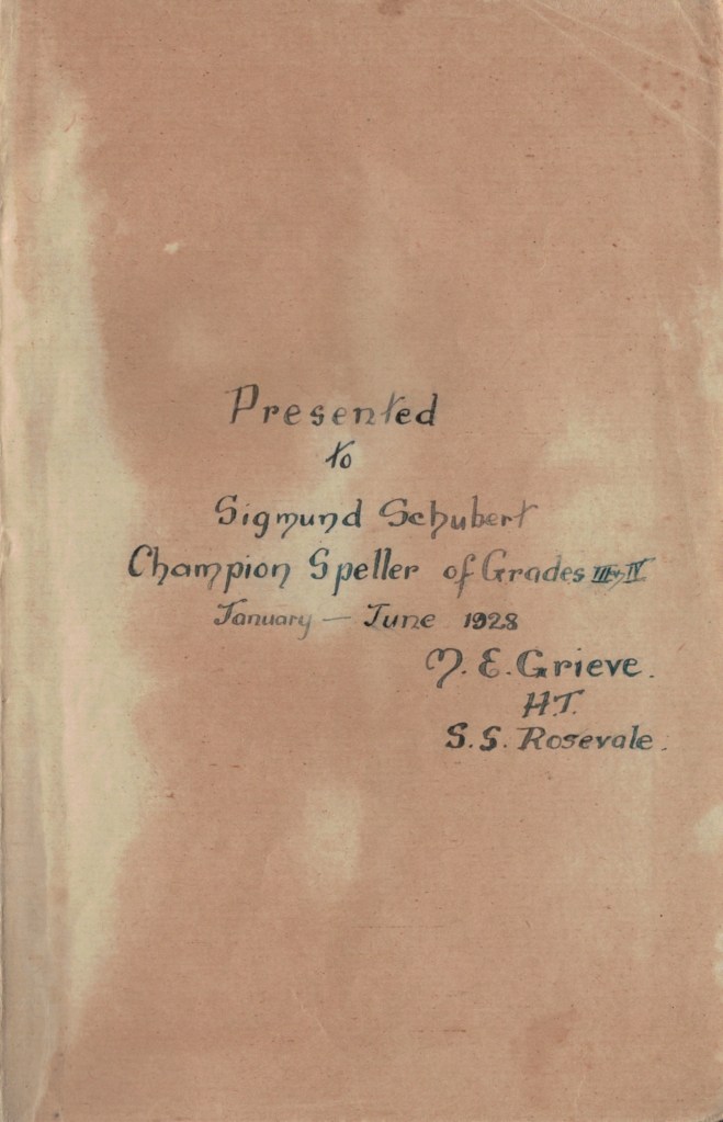 Rosevale State School, Galaquil East, Vic.: prize for Sig Schubert, 1928.Extract of birth certificate of Sig Schubert, Rupanyup North, Vic., 1918 [BDMVic.].Birth certificate of June Bawden (later Schubert), Warracknabeal, Vic., 1920 [BDMVic.].Marriage certificate of Sig and June Schubert (Bawden), Warracknabeal, Vic., 1940.