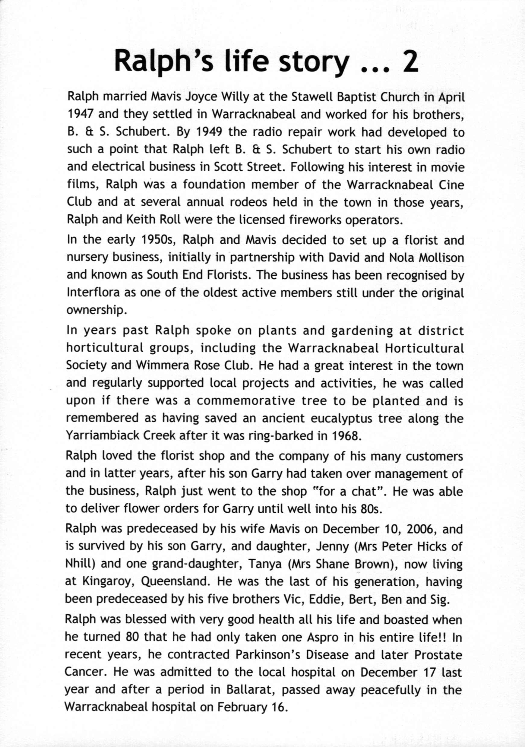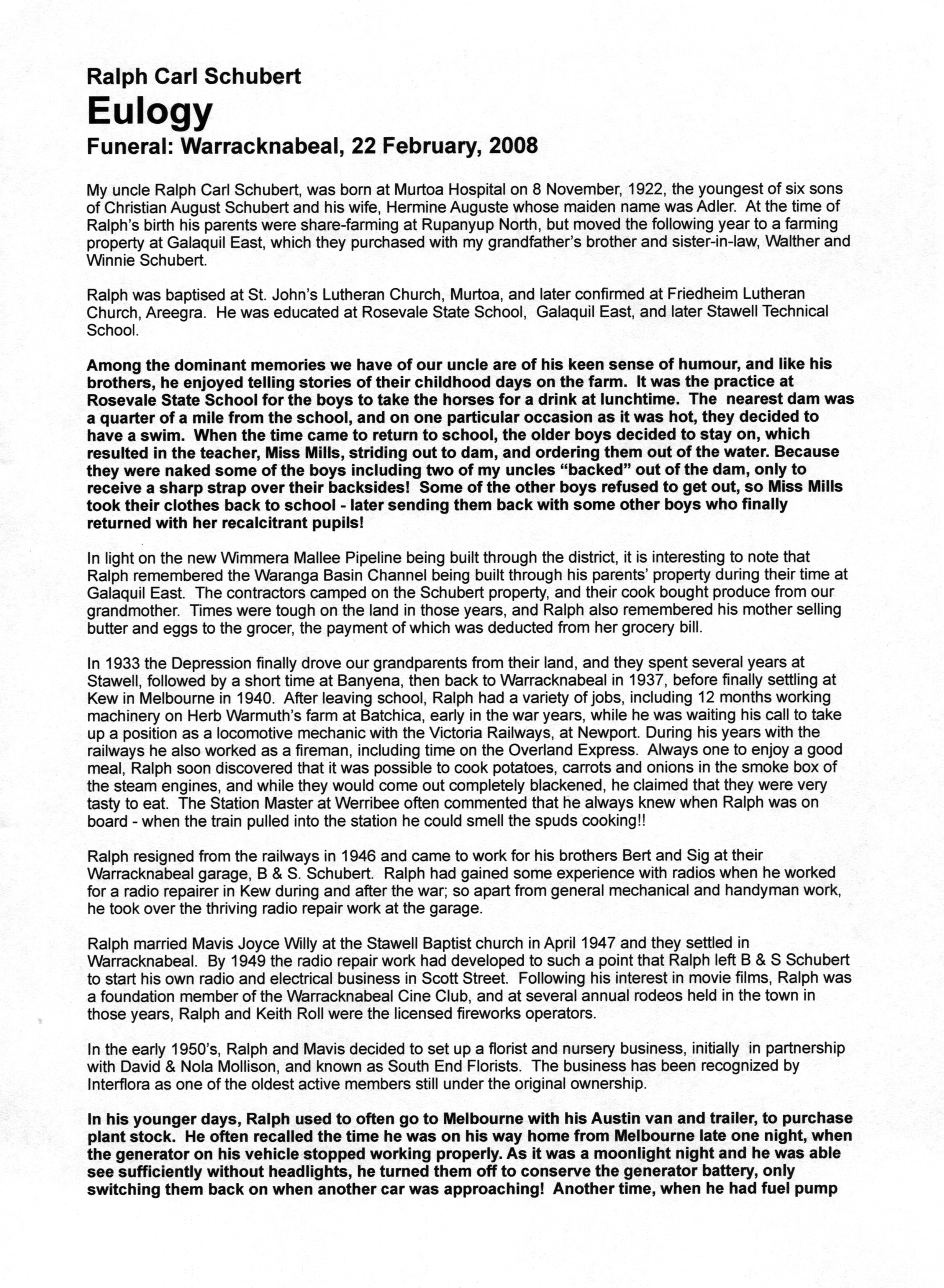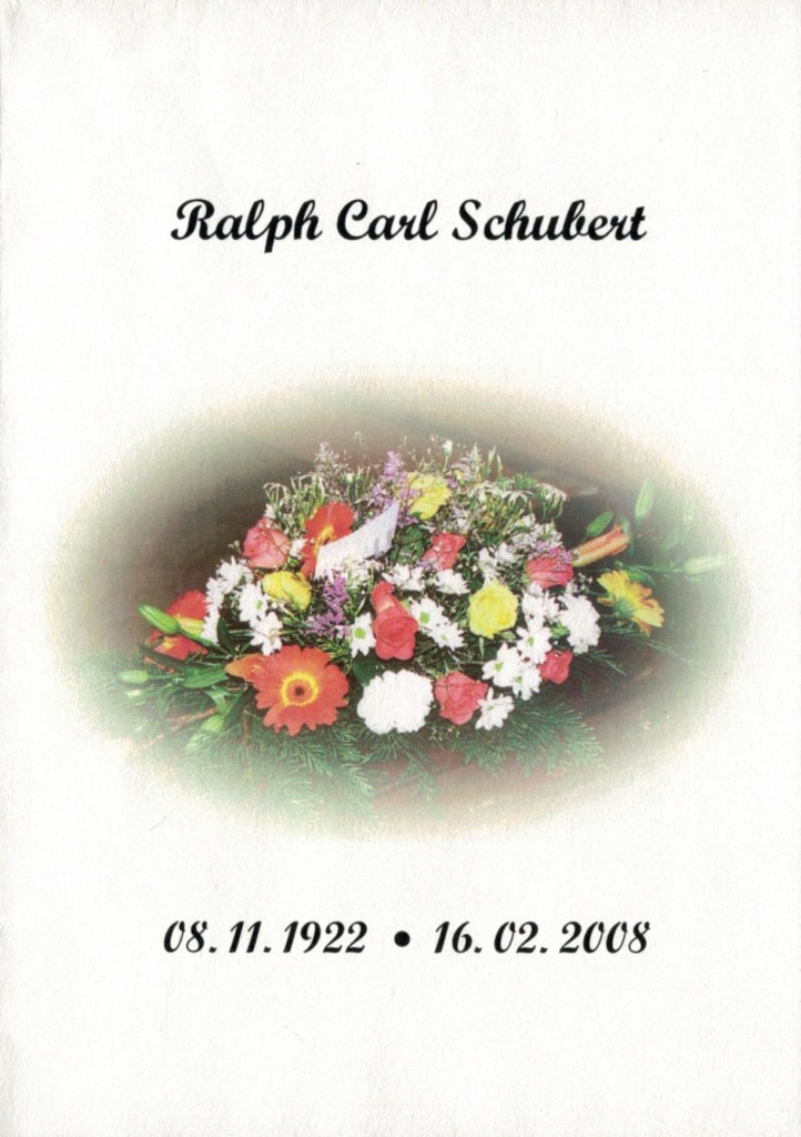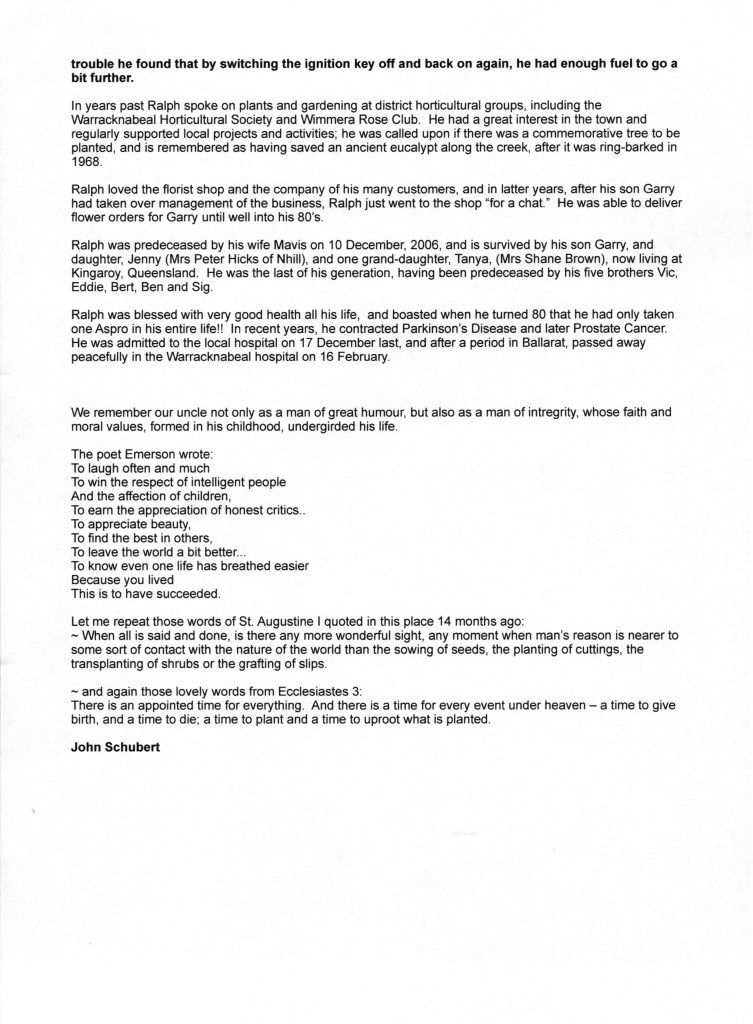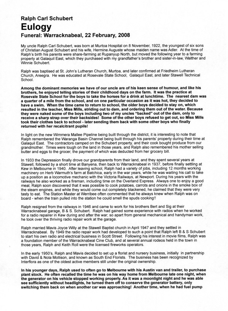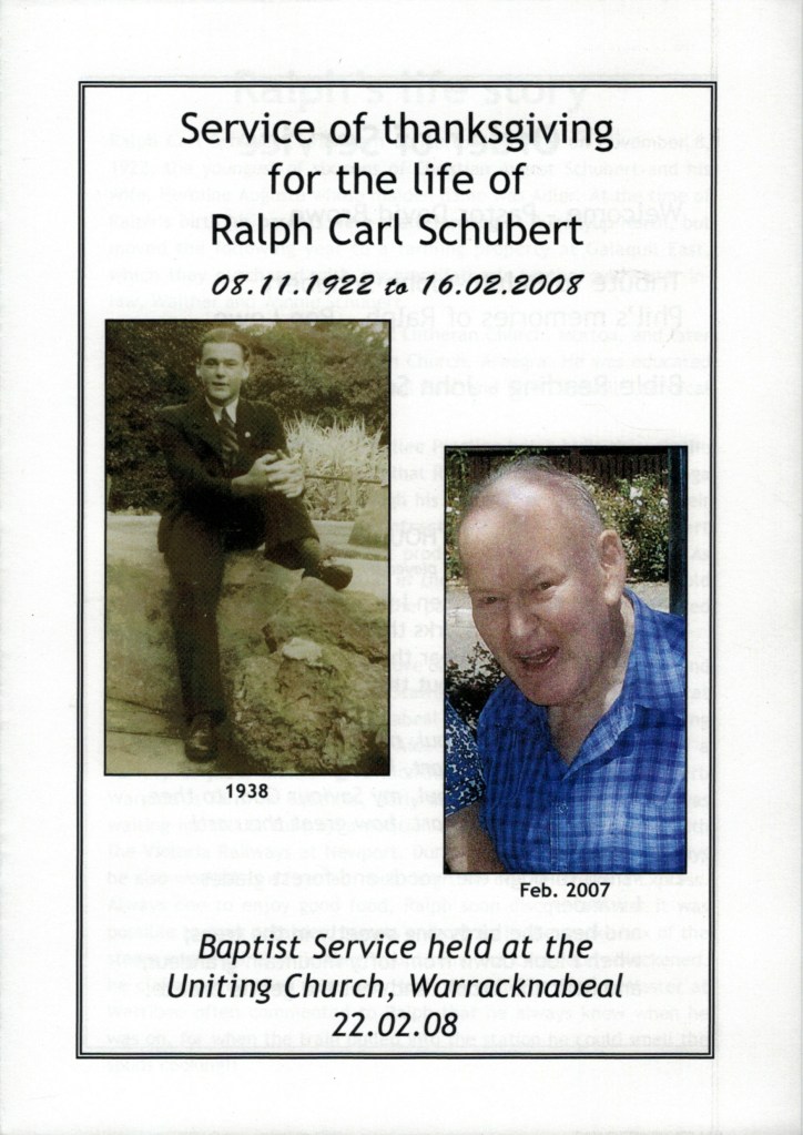Bereavement thanks card for Mavis Schubert (Willy), 2006.Funeral Service Order for Ralph Schubert, Warracknabeal, Vic., 2008.Eulogy for Ralph Schubert, Warracknabeal, Vic., 22 February 2008.Bereavement thanks card for Ralph Schubert, 2006.Bereavement thanks (Ralph Schubert).