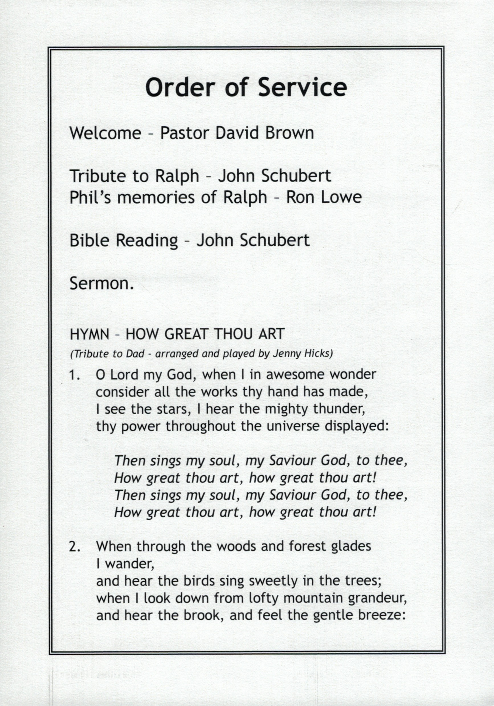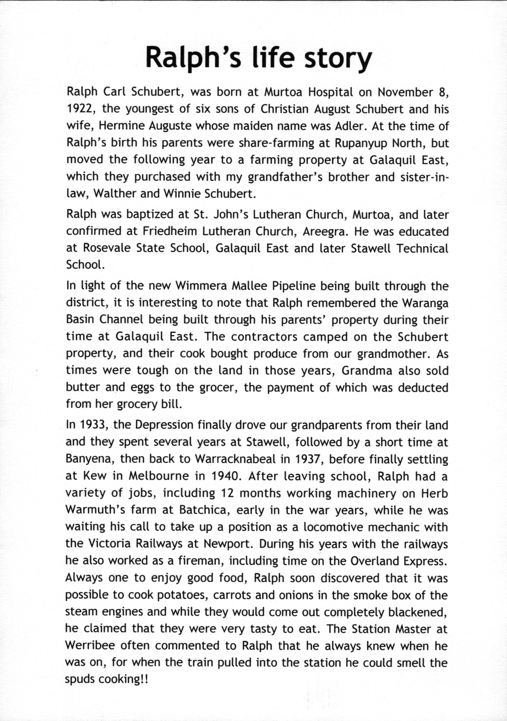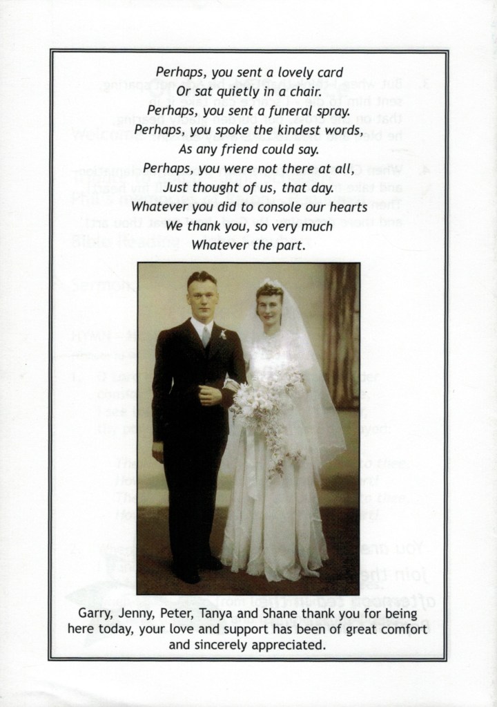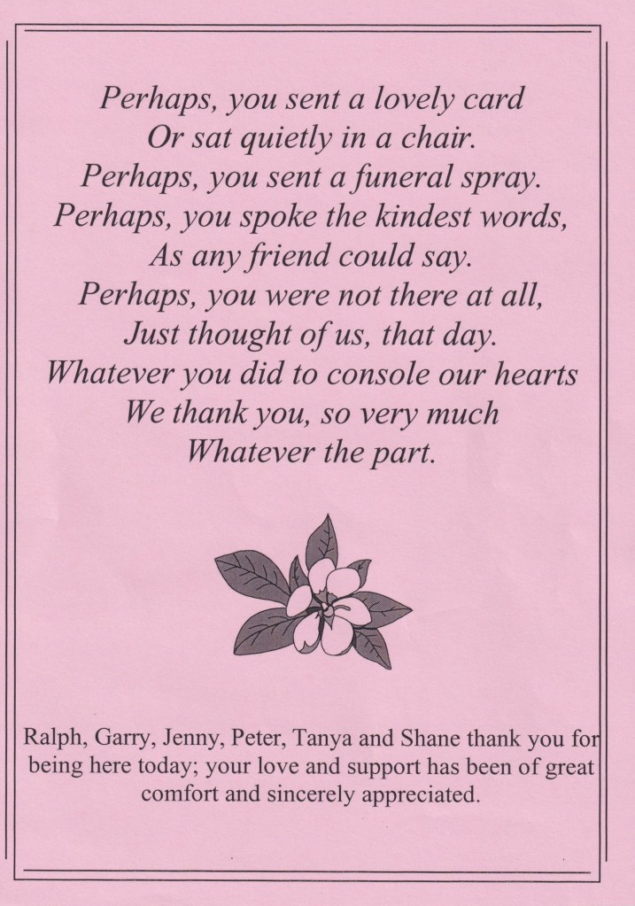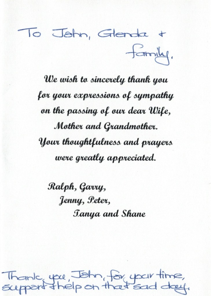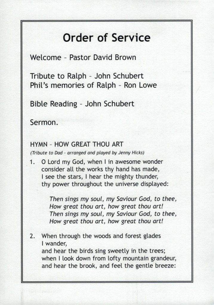 Bereavement thanks card for Mavis Schubert (Willy), 2006.Funeral Service Order for Ralph Schubert, Warracknabeal, Vic., 2008.Eulogy for Ralph Schubert, Warracknabeal, Vic., 22 February 2008.Bereavement thanks card for Ralph Schubert, 2006.Bereavement thanks (Ralph Schubert).