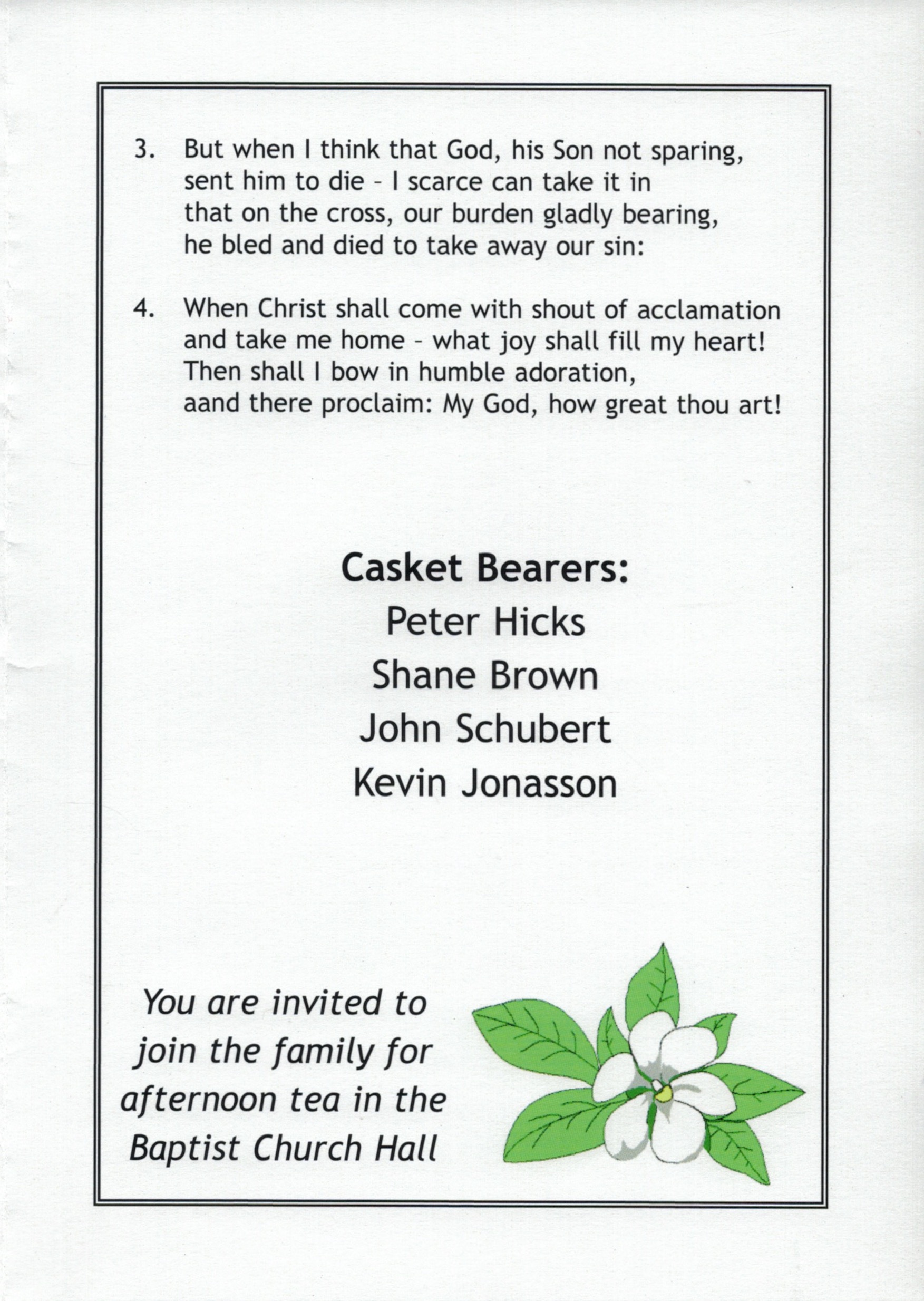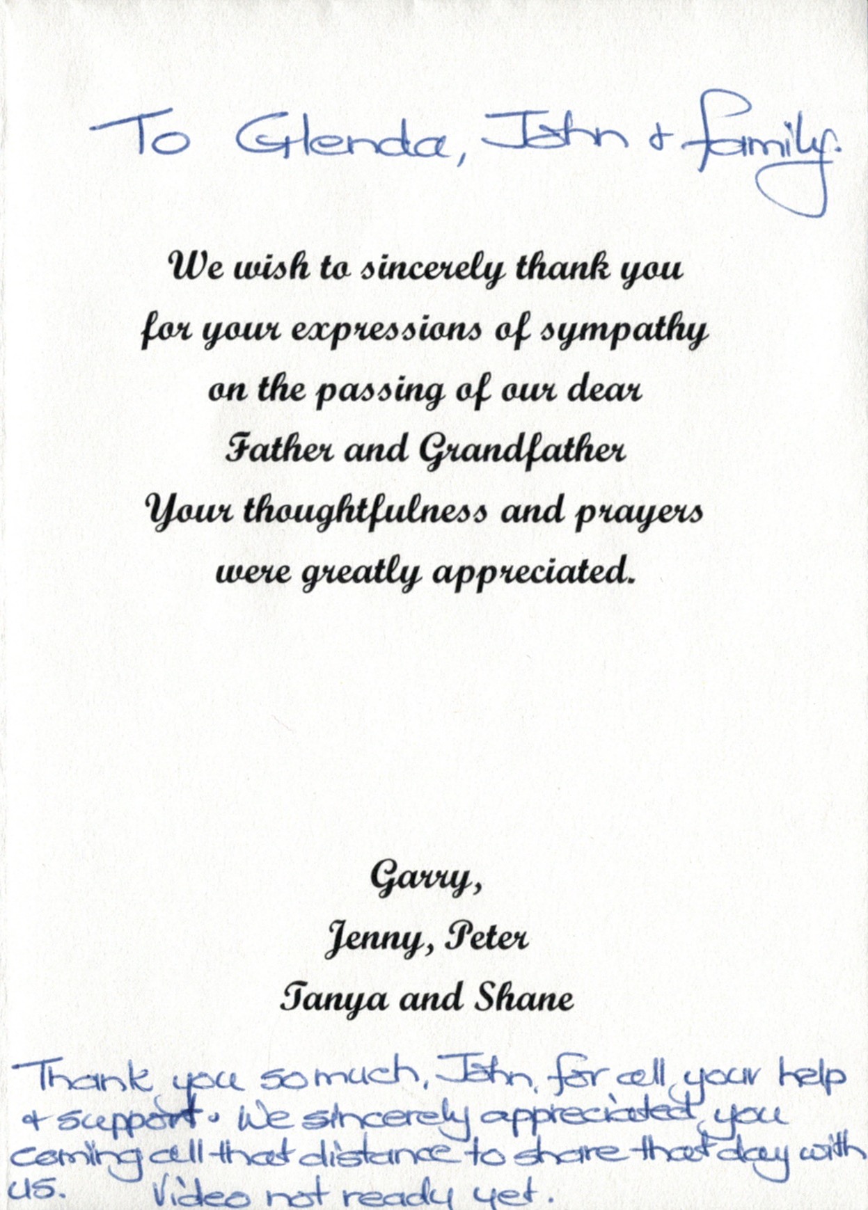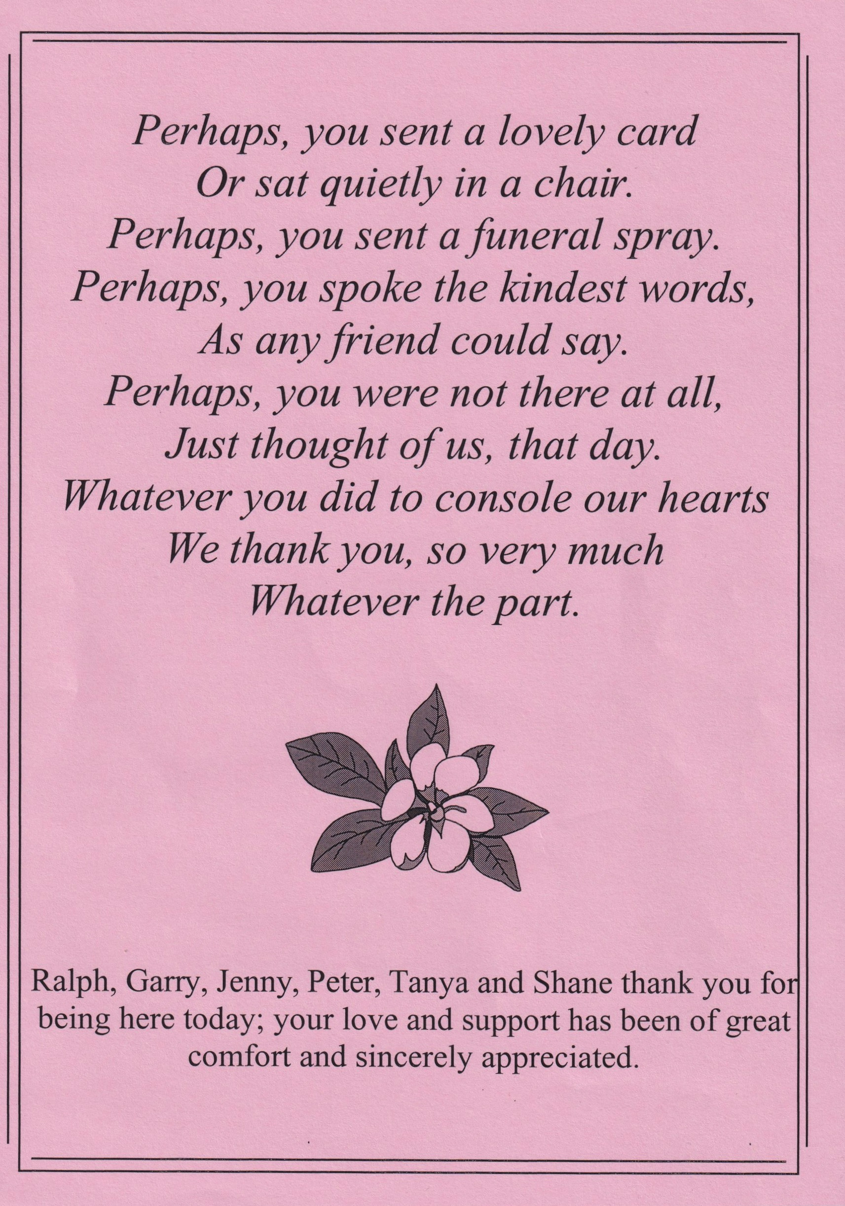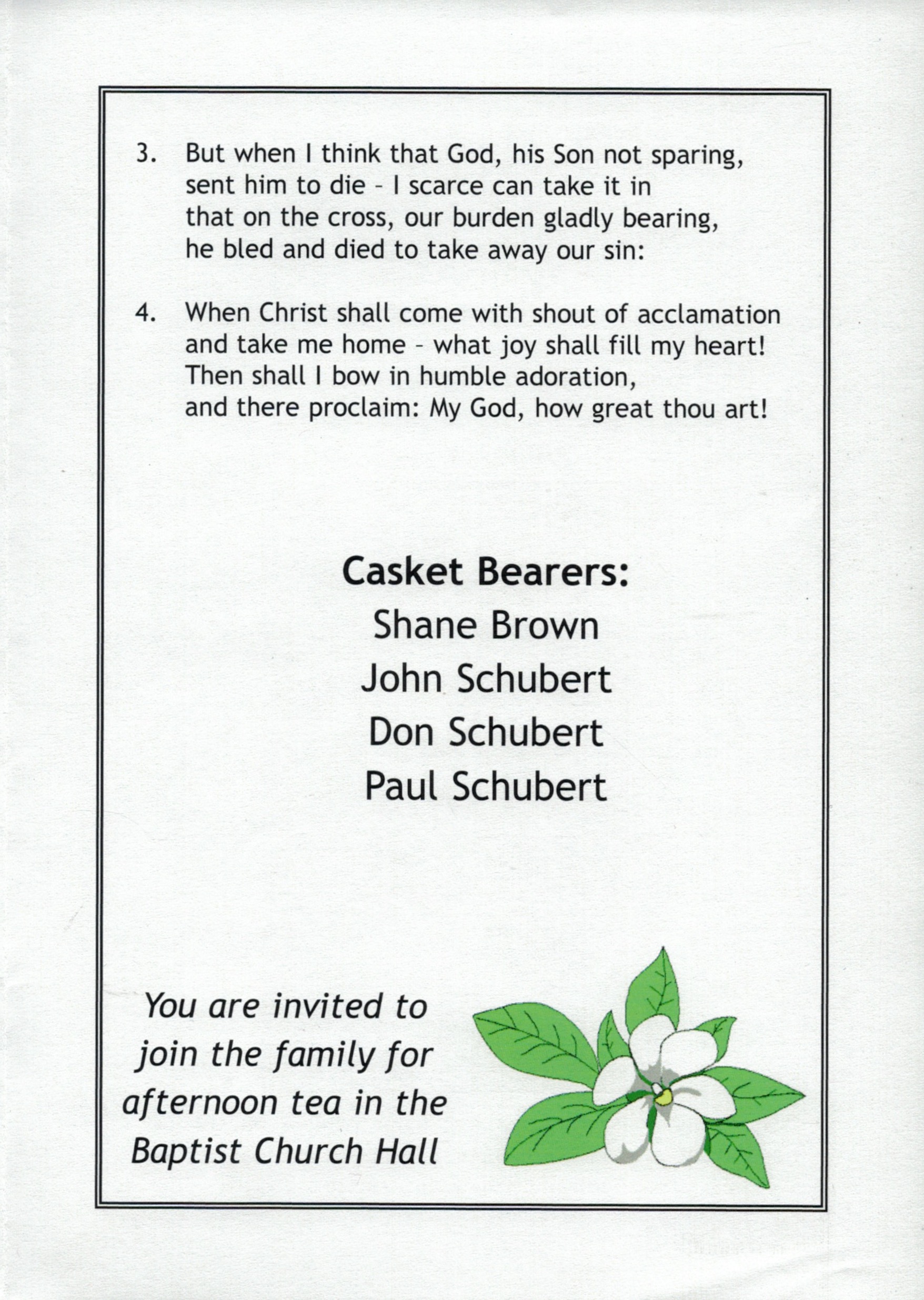 Bereavement thanks card for Mavis Schubert (Willy), 2006.Funeral Service Order for Ralph Schubert, Warracknabeal, Vic., 2008.Eulogy for Ralph Schubert, Warracknabeal, Vic., 22 February 2008.Bereavement thanks card for Ralph Schubert, 2006.Bereavement thanks (Ralph Schubert).