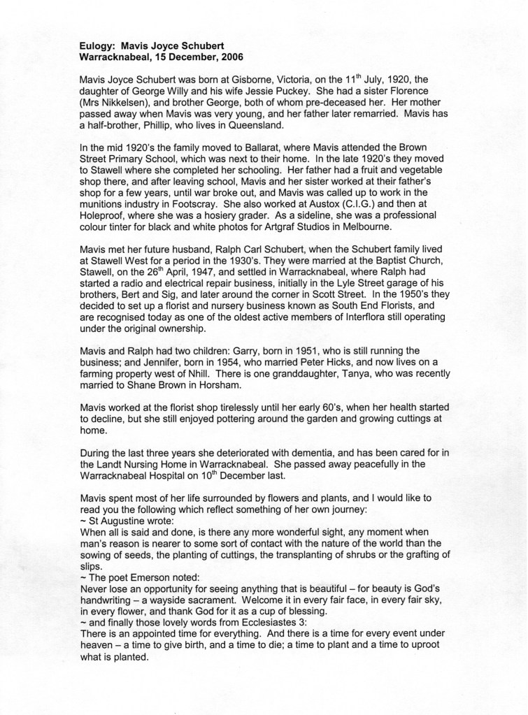 Eulogy for Mavis Schubert (Willy), Warracknabeal, Vic., 15 December 2006.