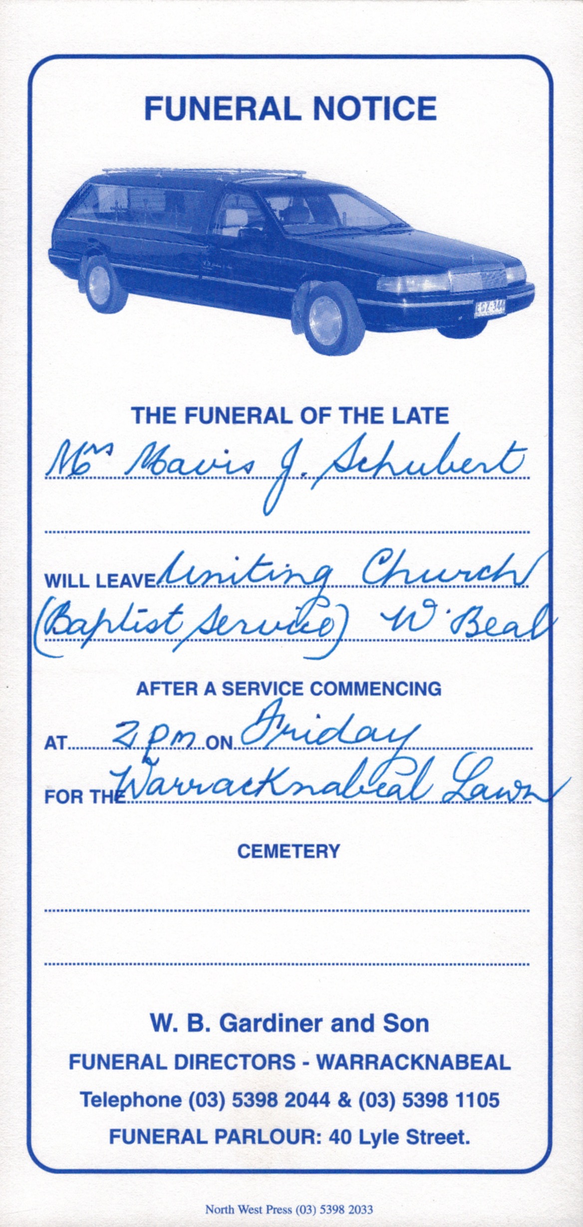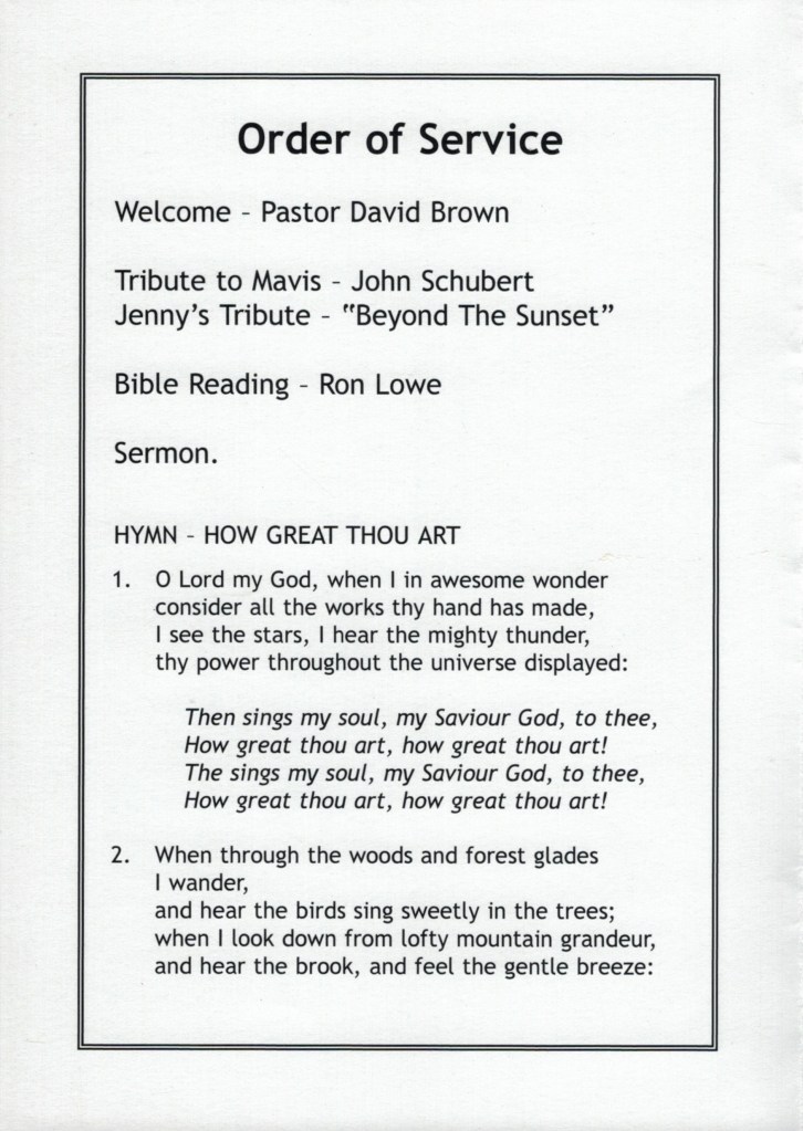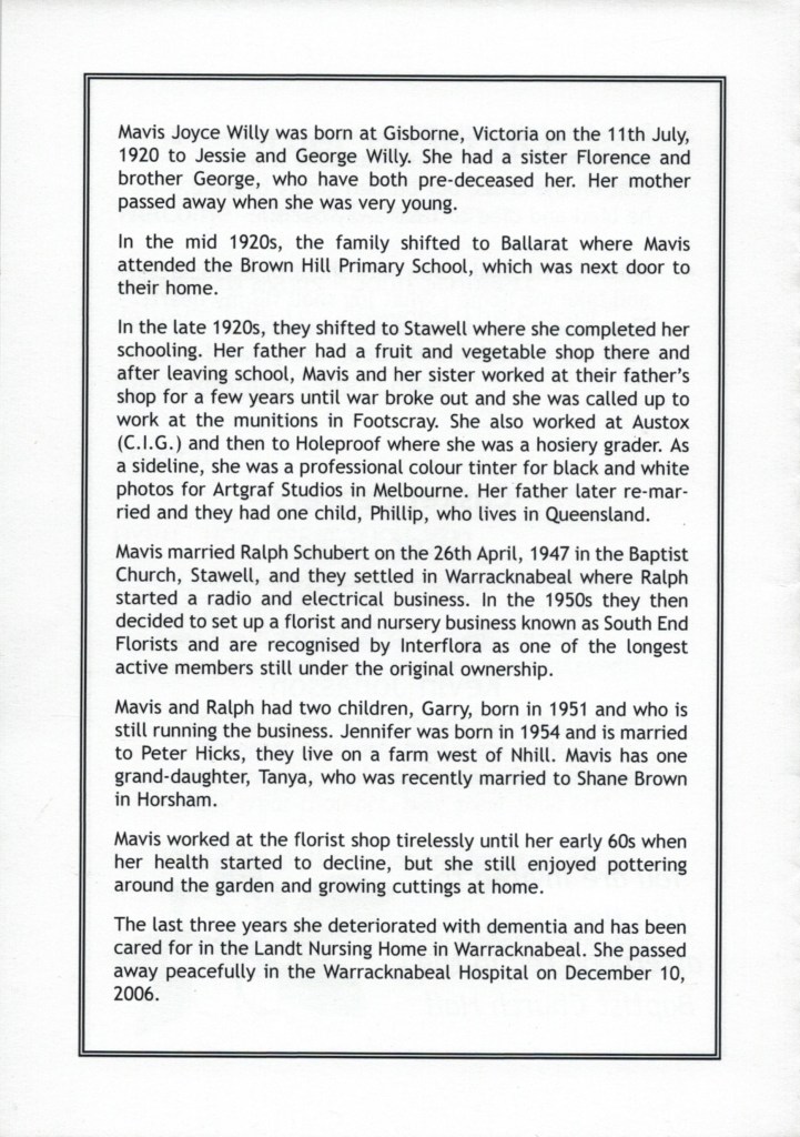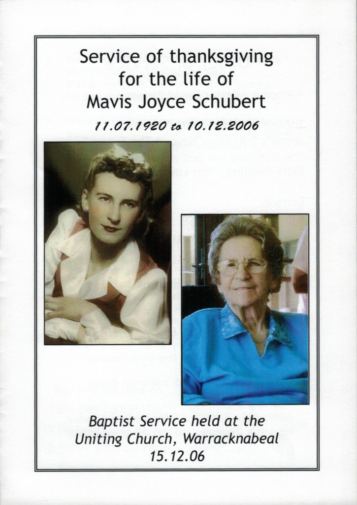 Funeral Sevice Order for Mavis Schubert (Willy), Warracknabeal, Vic., 2006.