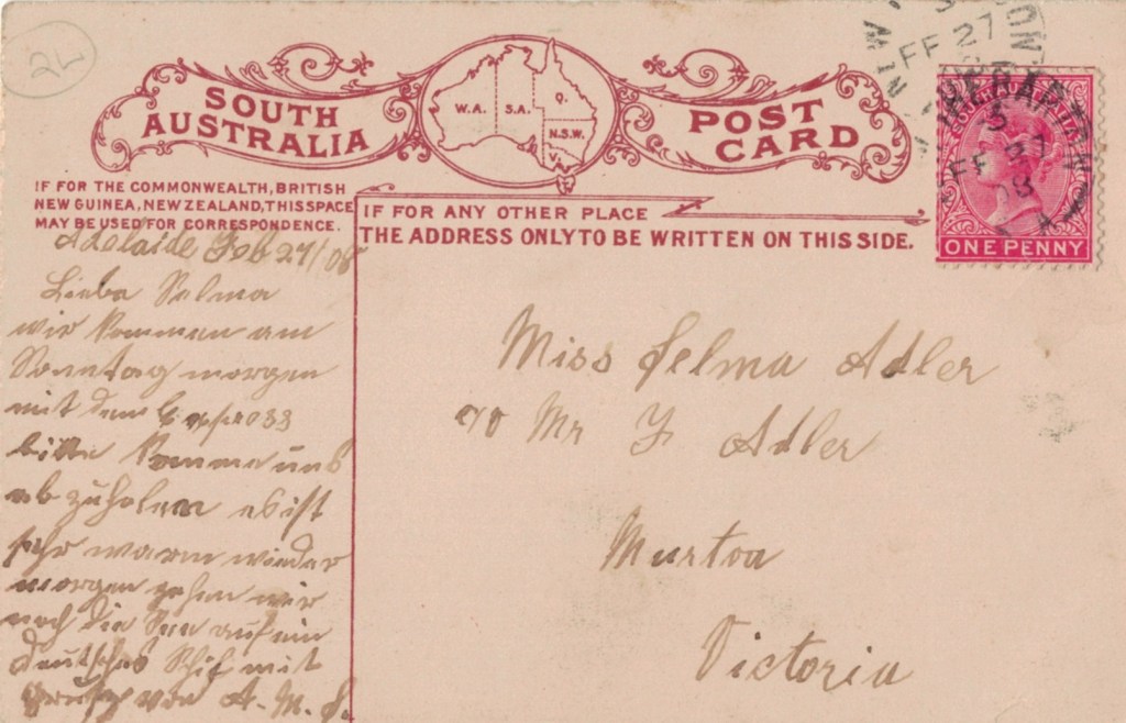 Documents and Memorabilia 1.8.7 SCHUBERT Postcard from Lenchen Schubert, Adelaide SA, to Selma Adler (later Schache), Murtoa Vic., 1908 [Selma Schache (Adler)].
