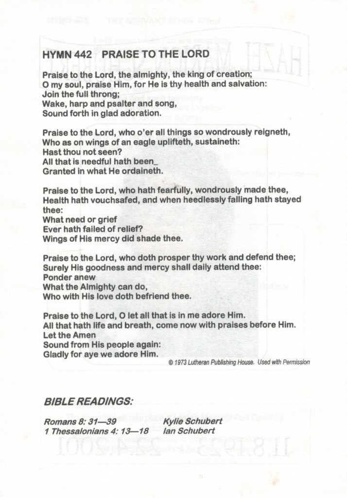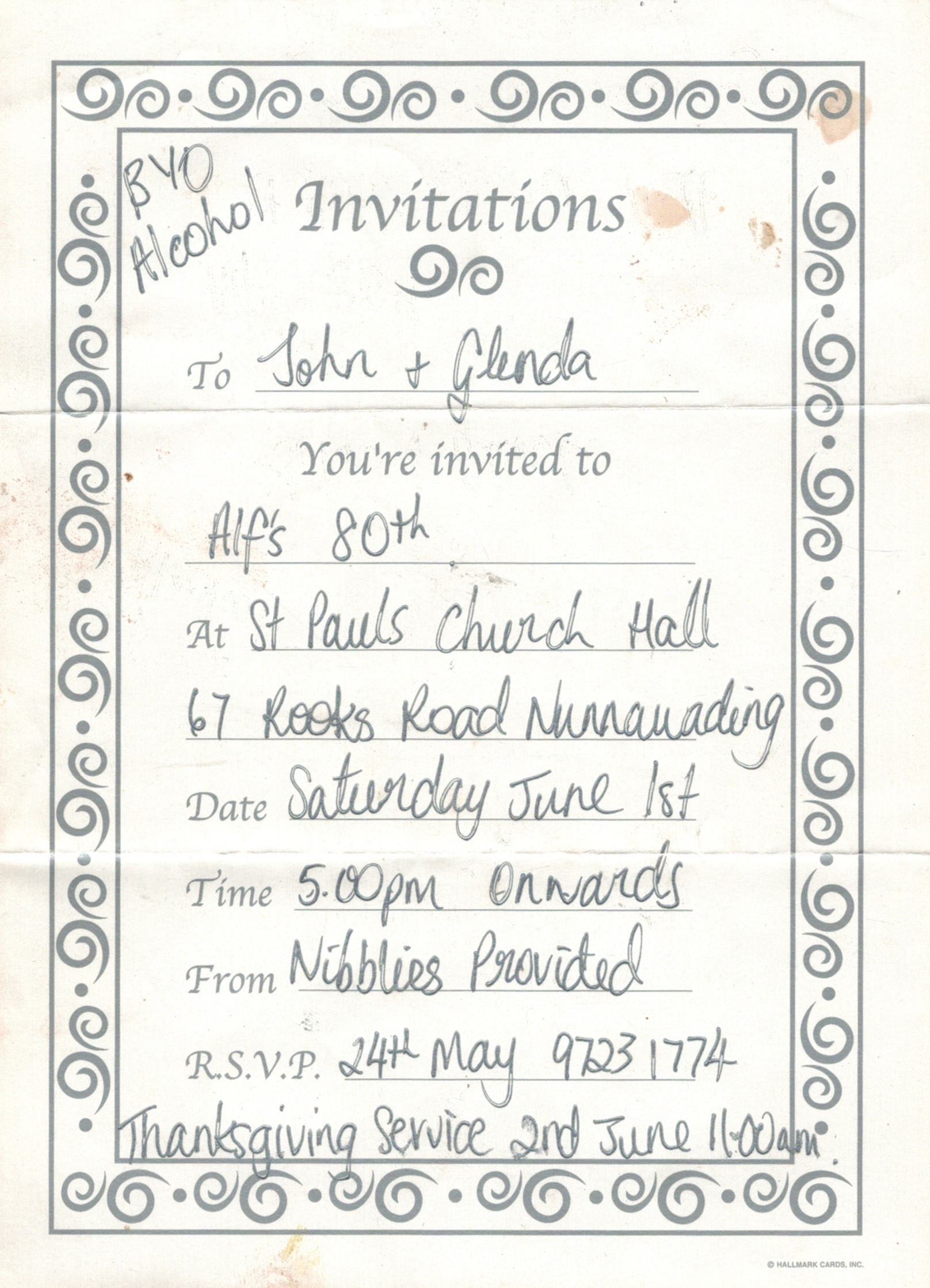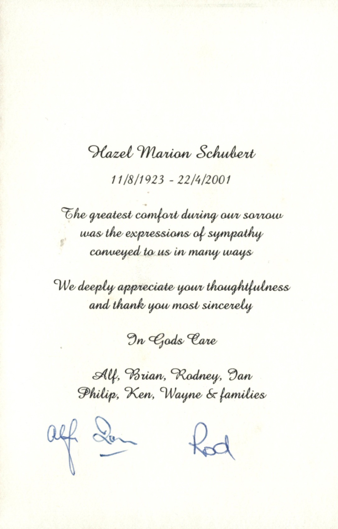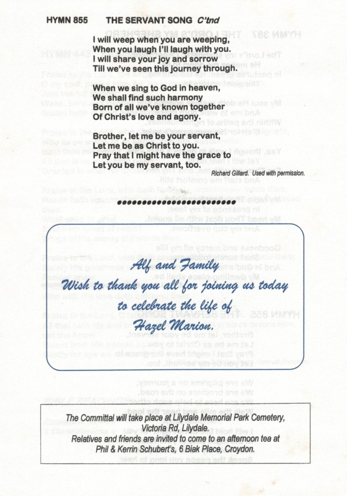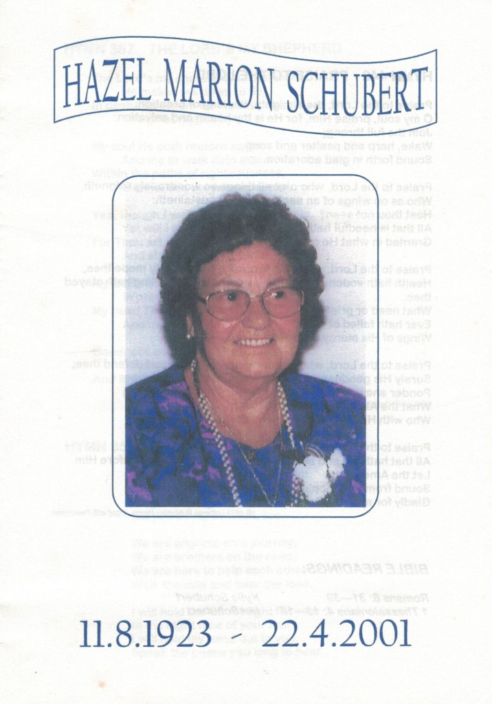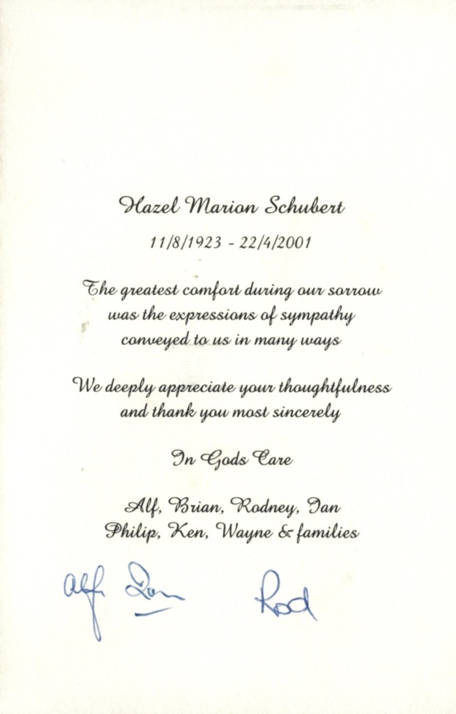 Documents and Memorabilia (1.8.9.3 SCHUBERT) Funeral service order for Hazel Schubert (Hateley), Nunawading, 2001. From funeral of Hazel Schubert (Hateley), 2001. Bereavement thanks card for Hazel Schubert (Hateley), 2001. Invitation to Alf Schubert’s 80th birthday celebration, 2002.