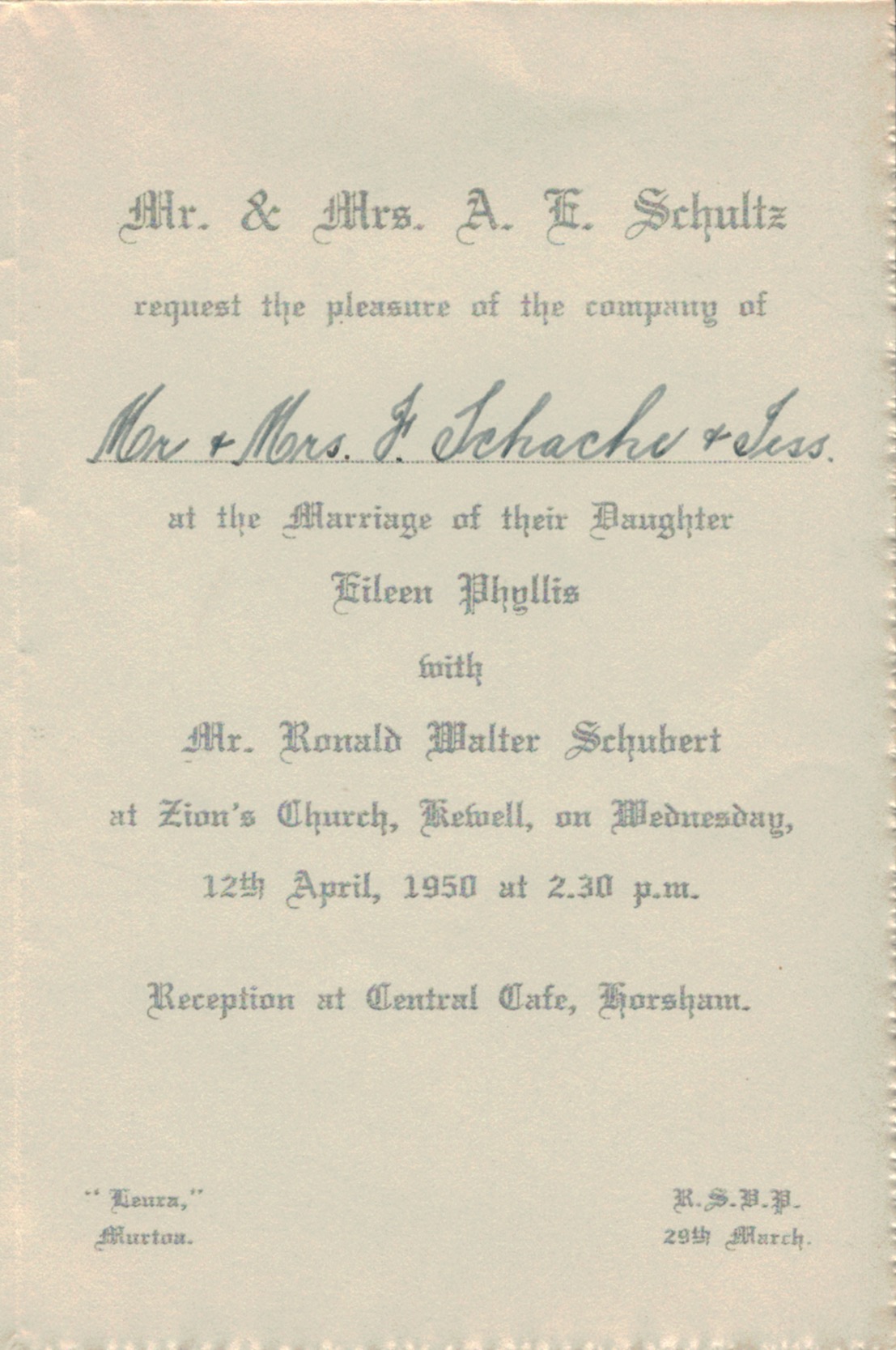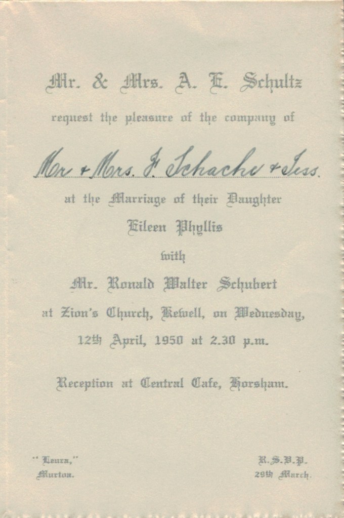 Documents and Memorabilia (1.8.9.4 SCHUBERT) Wedding invitation for Ron and Phyllis Schubert (Schultz), Kewell via Murtoa, Vic., 1950 [Tess Hausler (Schache)].