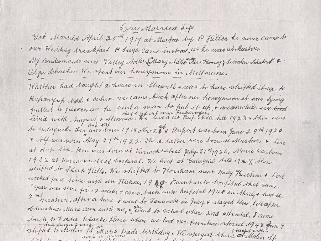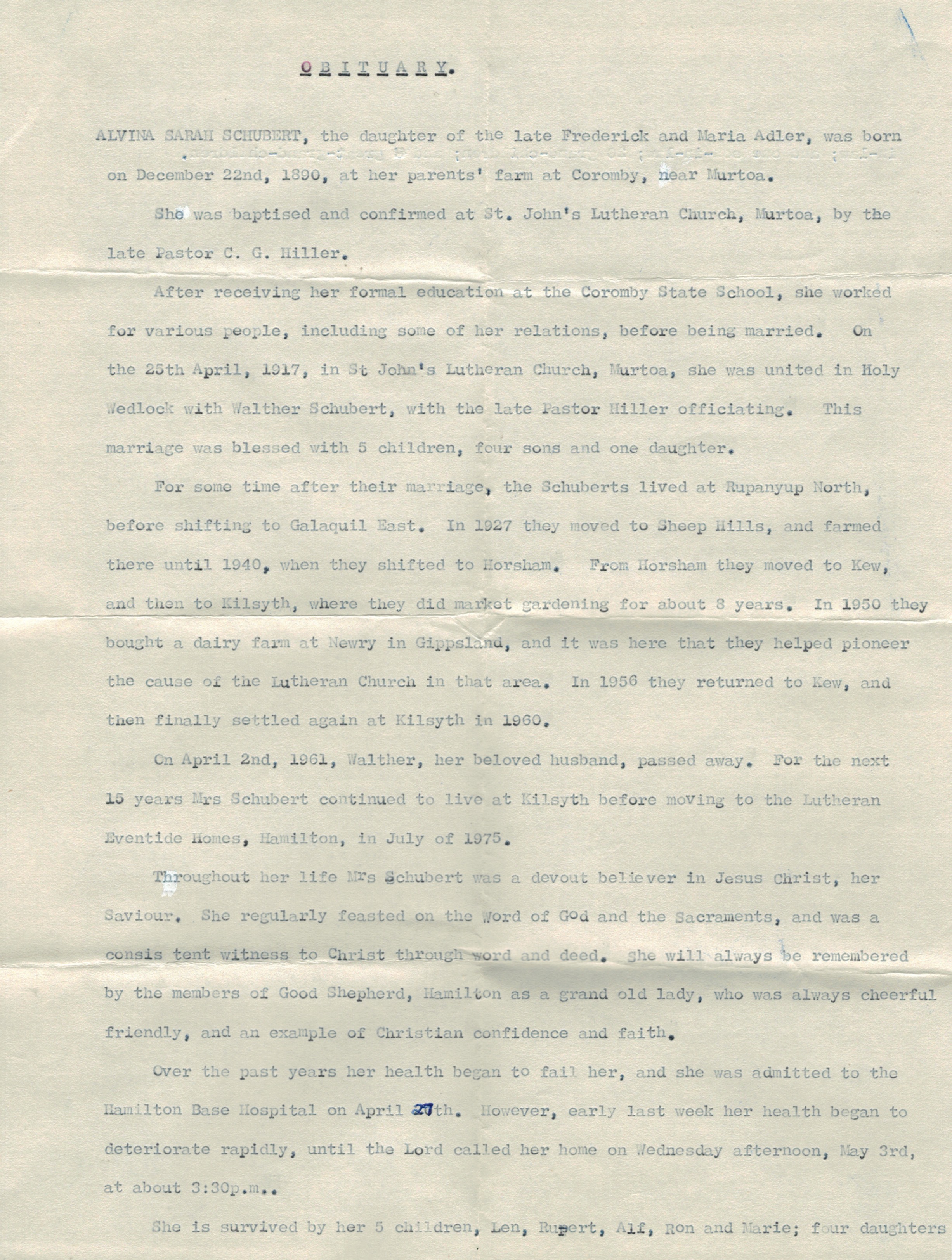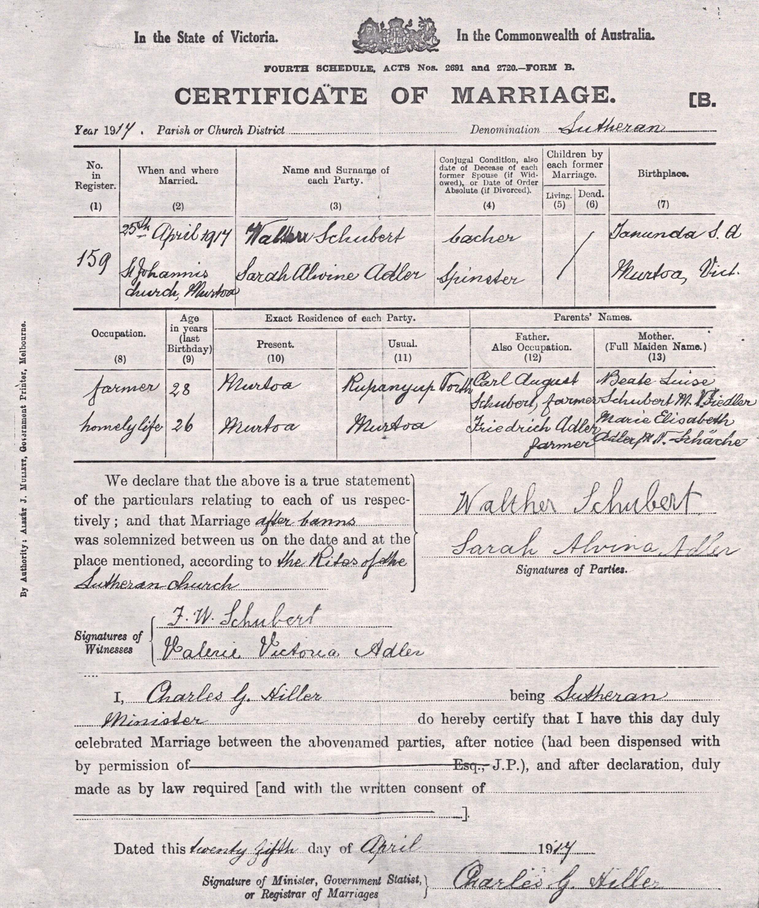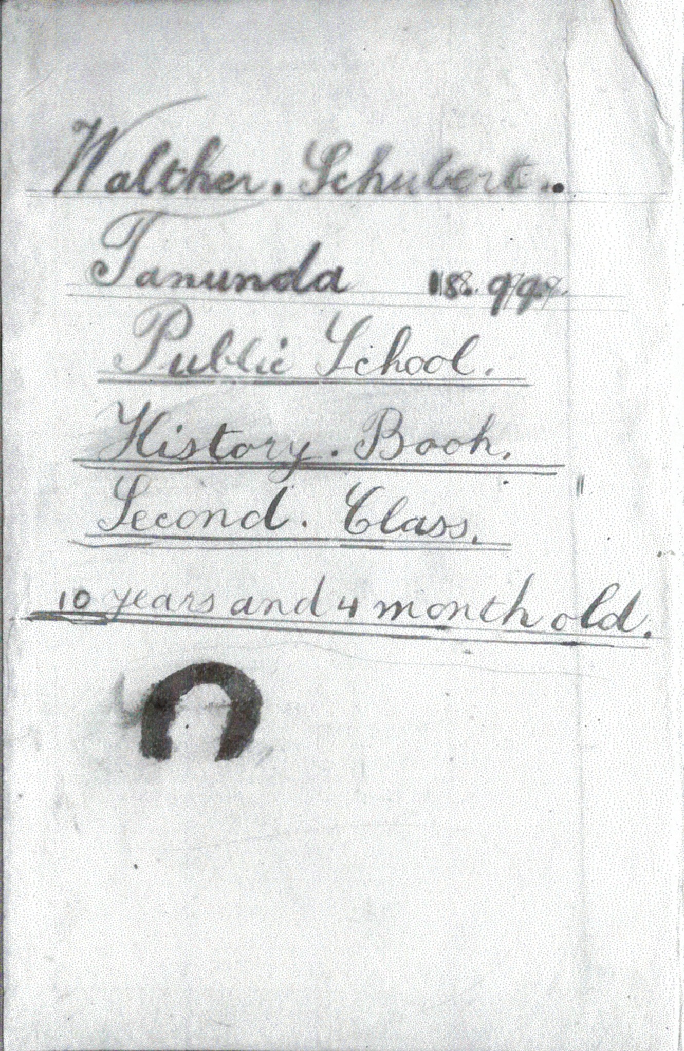 Documents and Memorabilia (1.8.9 SCHUBERT) Walther Schubert’s second class history reader, Tanunda, SA, 1899. Reading and writing primer used by Winnie Adler (later Schubert) and Carl Adler. Inscriptions in the book above. Inscription of Walther Schubert in the autograph book belonging to Minnie Schubert (later Boehm), 1913 [Pam Elliott]. Marriage certificate of Walther and Winnie Schubert (Adler), Murtoa, Vic., 1917 [Winnie Schubert (Adler)]. Pages from the family Bible of Walter and Winnie Schubert (Adler) [Winnie Schubert (Adler)]. Telegrams for silver wedding of Walther and Winnie Schubert (Adler), 1942. Walther Schubert, loan application, 1947 [Winnie Schubert (Adler)]. The Diary of Our Married Life”, a memoir by Winnie Schubert (Adler), Kilsyth, Vic., written post-1961 [Winnie Schubert (Adler)]. “Our Married Life”, a memoir by Winnie Schubert (Adler), Kilsyth, Vic, written 1975 [Winnie Schubert (Adler)]. Funeral service sheet for Winnie Schubert (Adler), Hamilton, Vic., 1978. Obituary for Winnie Schubert (Adler), Hamilton, Vic., 1978.