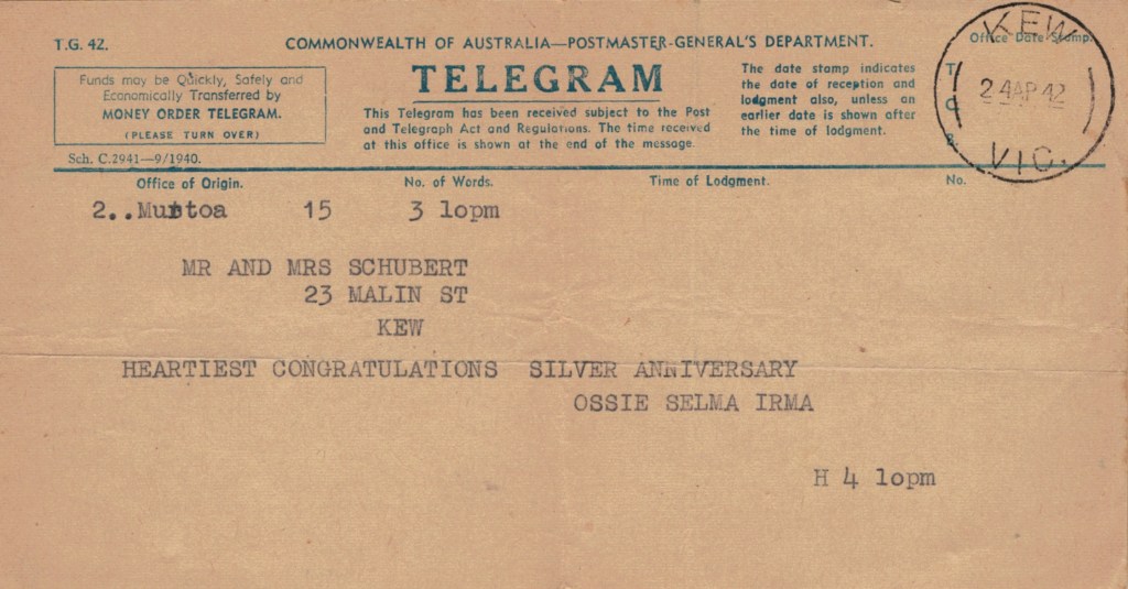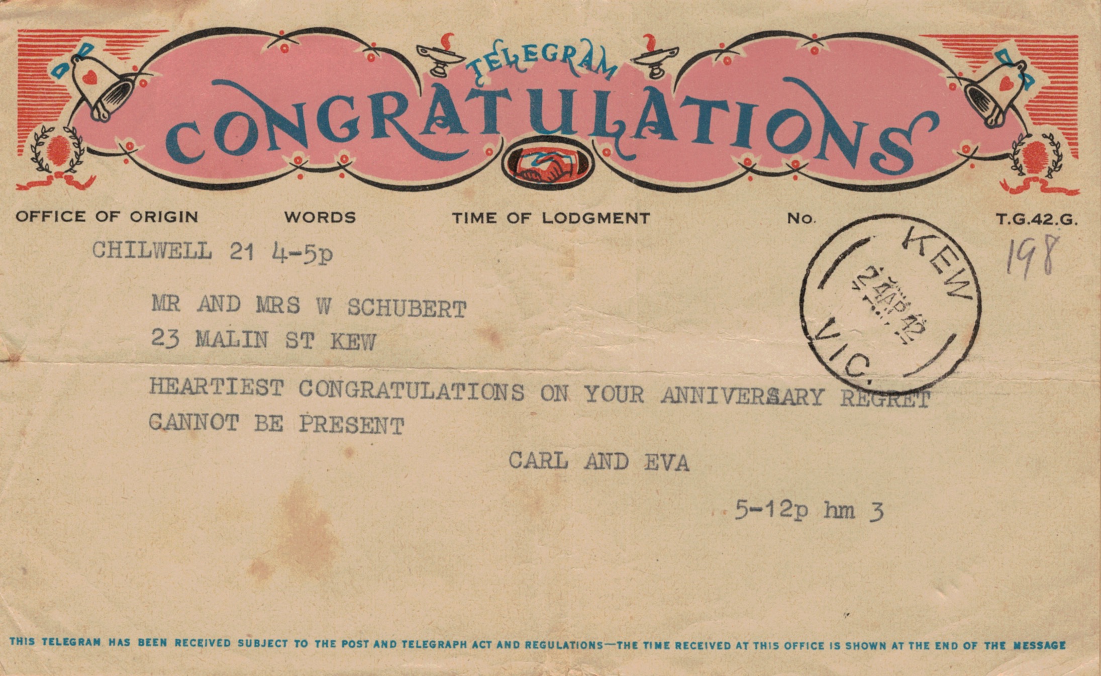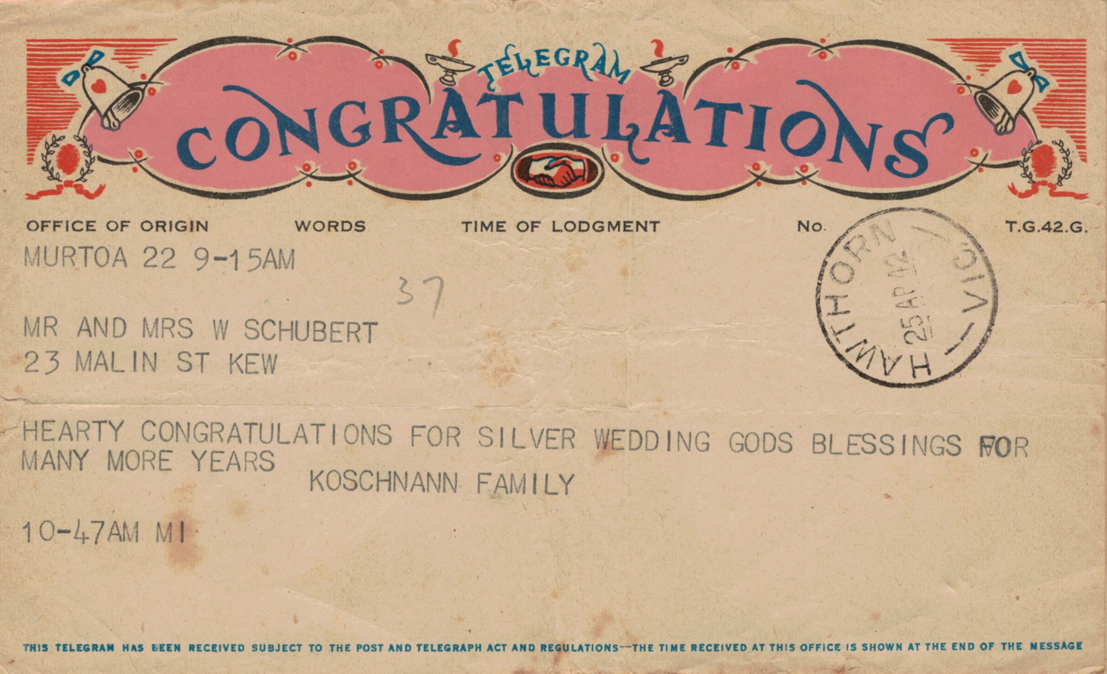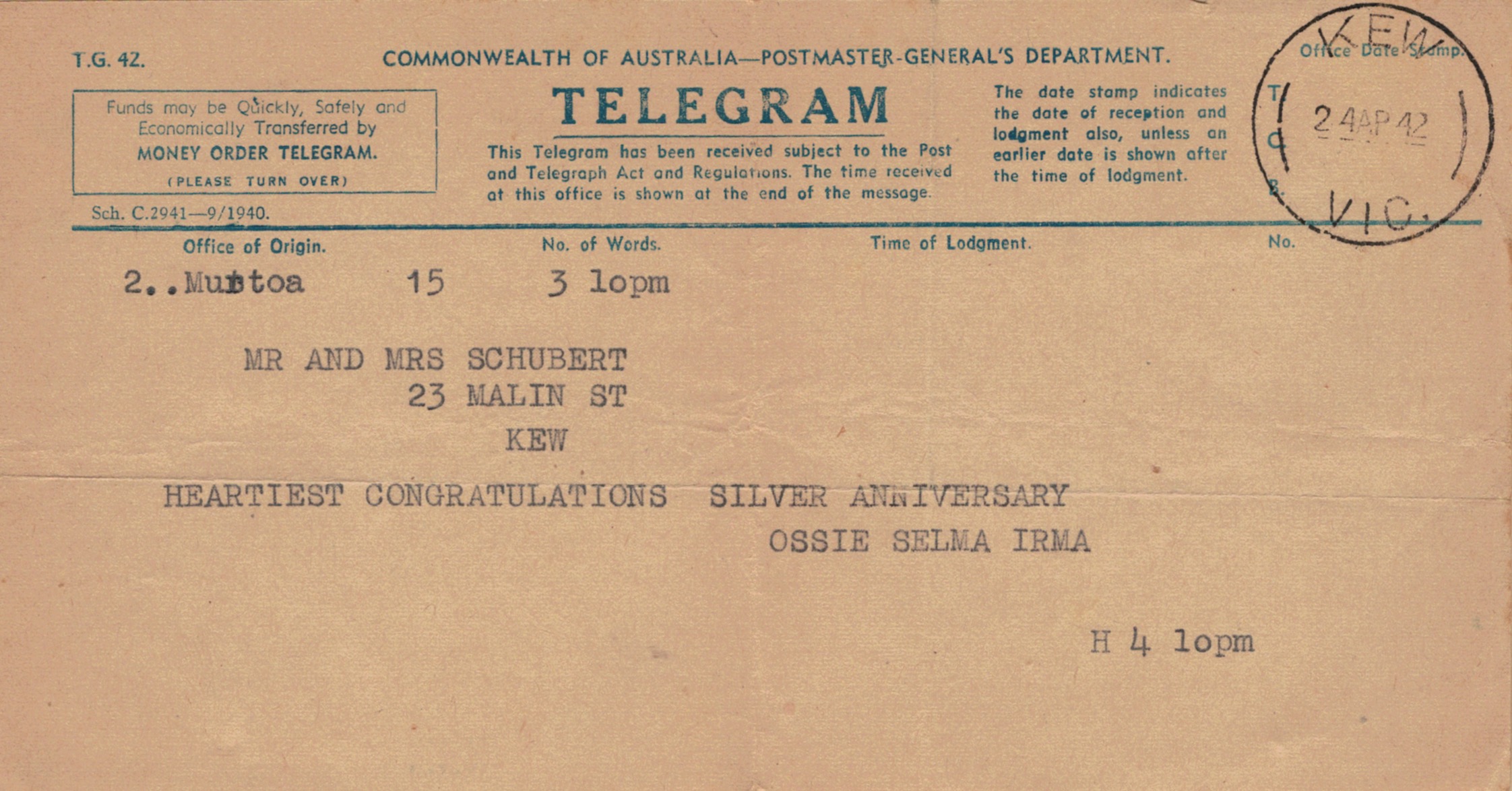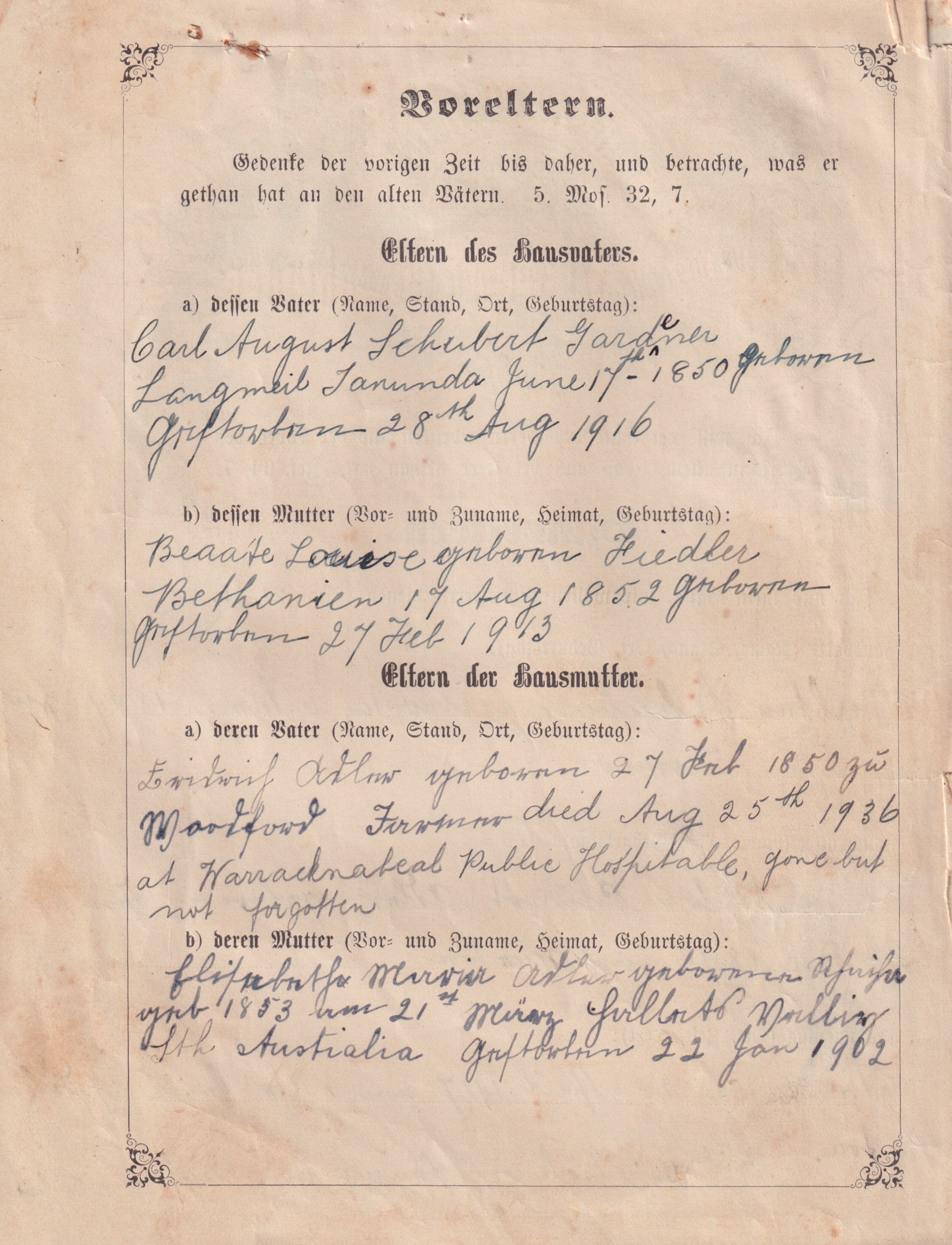 Documents and Memorabilia (1.8.9 SCHUBERT) Walther Schubert’s second class history reader, Tanunda, SA, 1899. Reading and writing primer used by Winnie Adler (later Schubert) and Carl Adler. Inscriptions in the book above. Inscription of Walther Schubert in the autograph book belonging to Minnie Schubert (later Boehm), 1913 [Pam Elliott]. Marriage certificate of Walther and Winnie Schubert (Adler), Murtoa, Vic., 1917 [Winnie Schubert (Adler)]. Pages from the family Bible of Walter and Winnie Schubert (Adler) [Winnie Schubert (Adler)]. Telegrams for silver wedding of Walther and Winnie Schubert (Adler), 1942. Walther Schubert, loan application, 1947 [Winnie Schubert (Adler)]. The Diary of Our Married Life”, a memoir by Winnie Schubert (Adler), Kilsyth, Vic., written post-1961 [Winnie Schubert (Adler)]. “Our Married Life”, a memoir by Winnie Schubert (Adler), Kilsyth, Vic, written 1975 [Winnie Schubert (Adler)]. Funeral service sheet for Winnie Schubert (Adler), Hamilton, Vic., 1978. Obituary for Winnie Schubert (Adler), Hamilton, Vic., 1978.