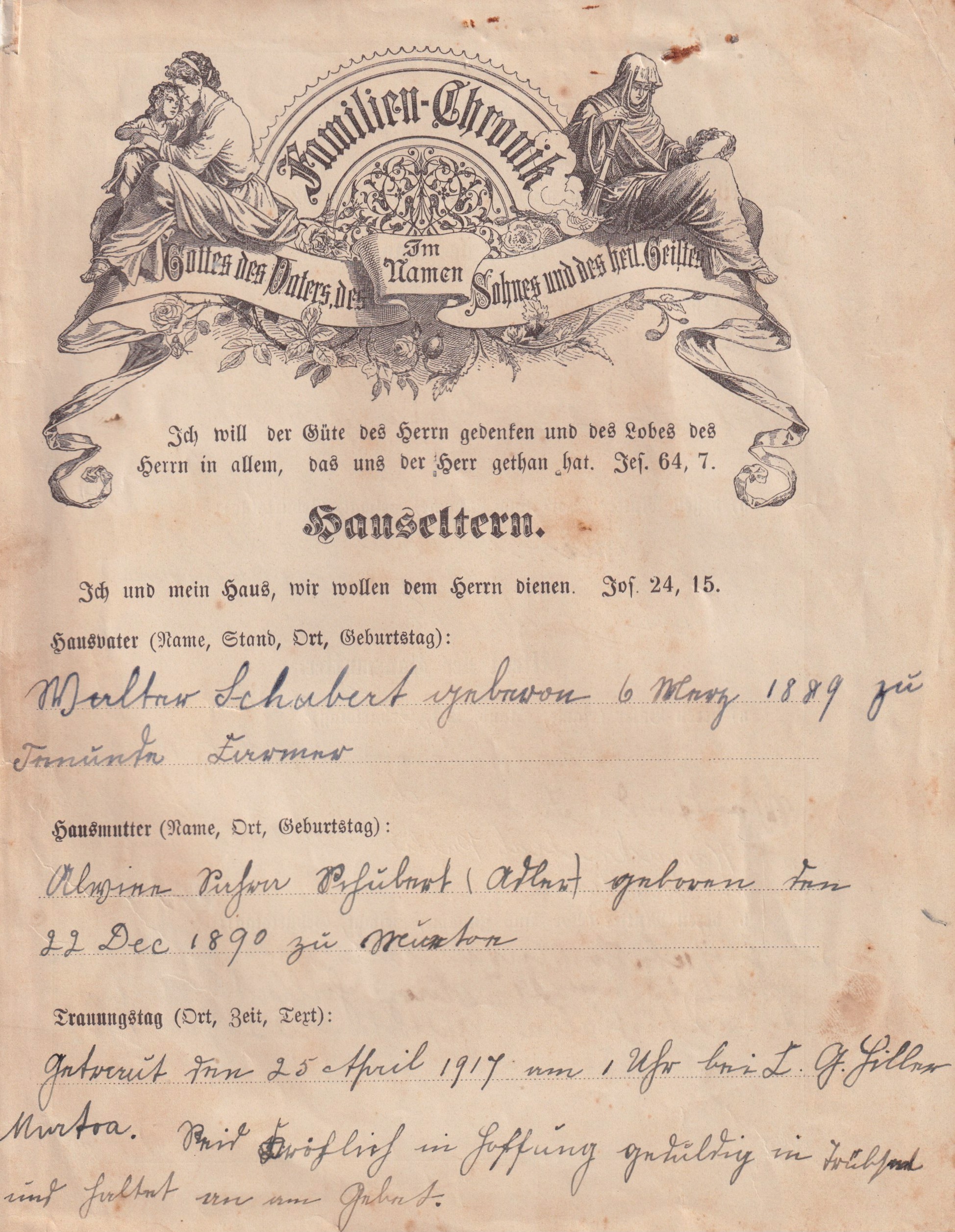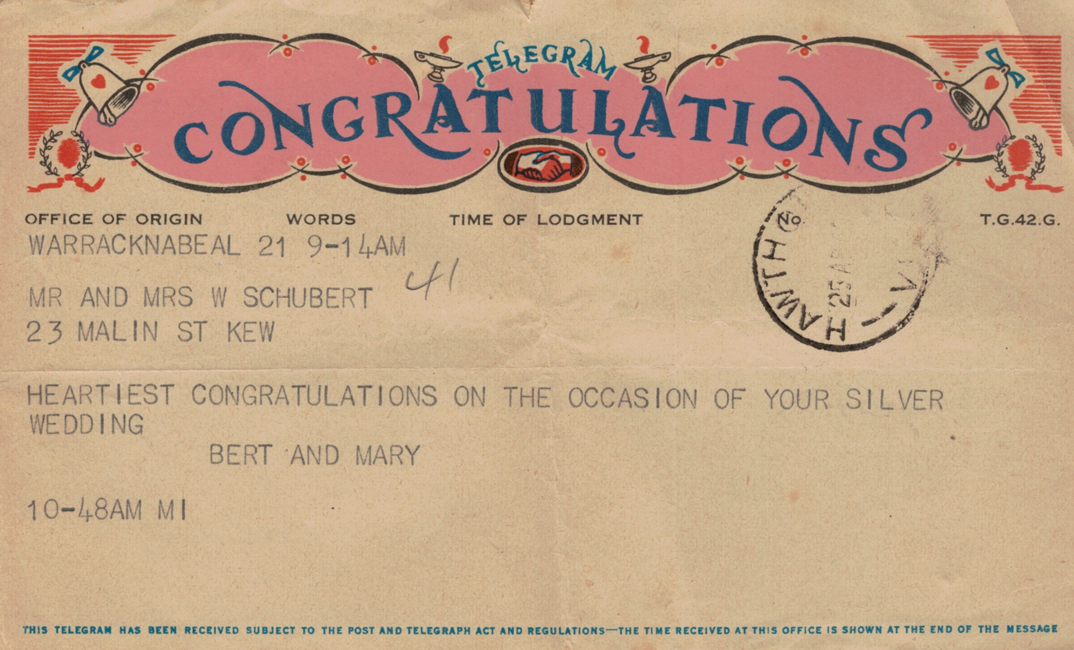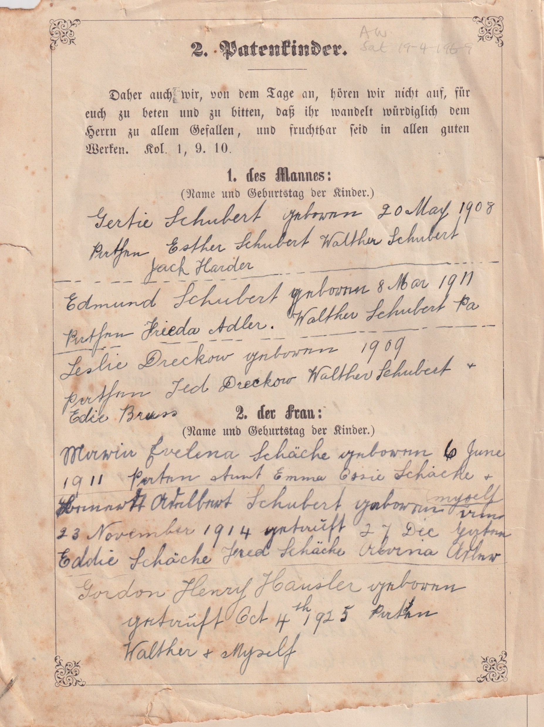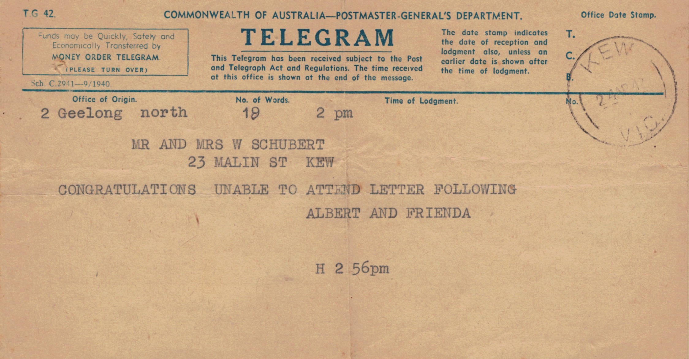 Documents and Memorabilia (1.8.9 SCHUBERT) Walther Schubert’s second class history reader, Tanunda, SA, 1899. Reading and writing primer used by Winnie Adler (later Schubert) and Carl Adler. Inscriptions in the book above. Inscription of Walther Schubert in the autograph book belonging to Minnie Schubert (later Boehm), 1913 [Pam Elliott]. Marriage certificate of Walther and Winnie Schubert (Adler), Murtoa, Vic., 1917 [Winnie Schubert (Adler)]. Pages from the family Bible of Walter and Winnie Schubert (Adler) [Winnie Schubert (Adler)]. Telegrams for silver wedding of Walther and Winnie Schubert (Adler), 1942. Walther Schubert, loan application, 1947 [Winnie Schubert (Adler)]. The Diary of Our Married Life”, a memoir by Winnie Schubert (Adler), Kilsyth, Vic., written post-1961 [Winnie Schubert (Adler)]. “Our Married Life”, a memoir by Winnie Schubert (Adler), Kilsyth, Vic, written 1975 [Winnie Schubert (Adler)]. Funeral service sheet for Winnie Schubert (Adler), Hamilton, Vic., 1978. Obituary for Winnie Schubert (Adler), Hamilton, Vic., 1978.