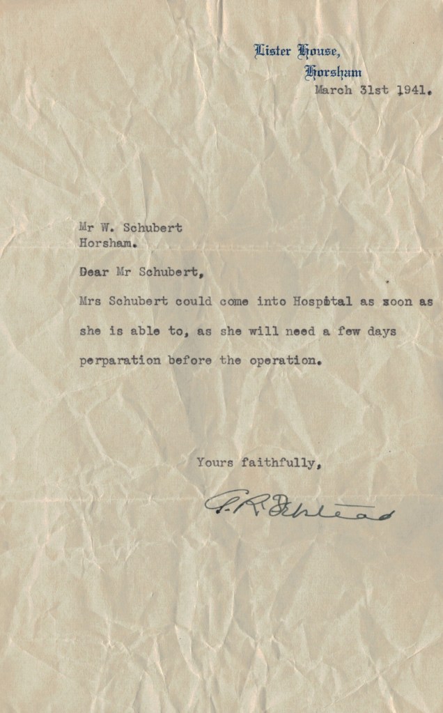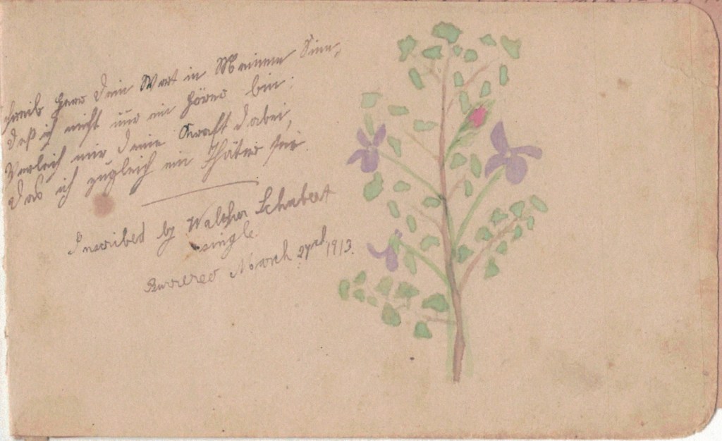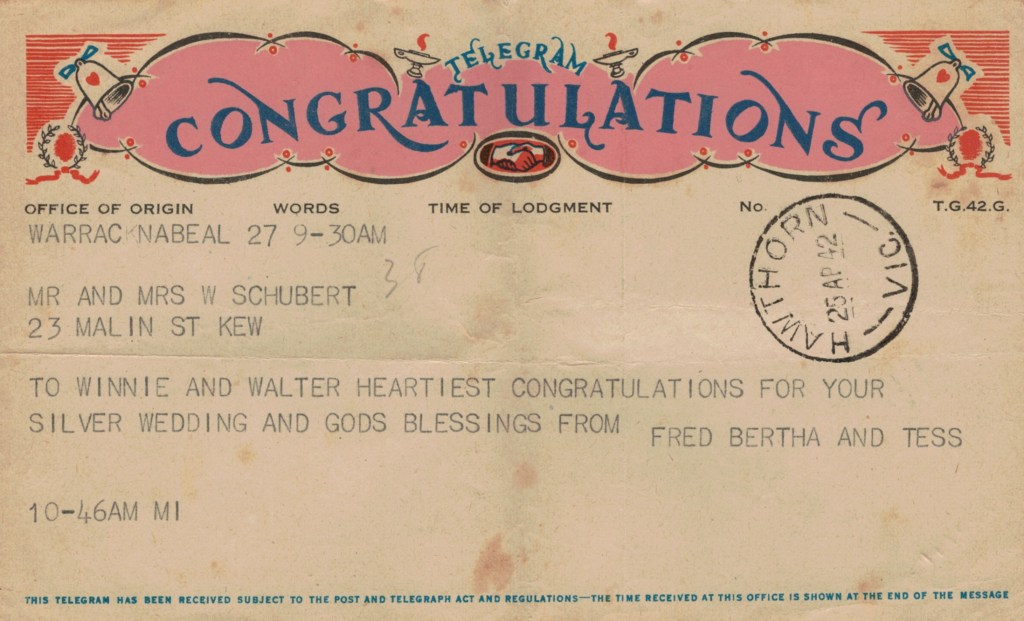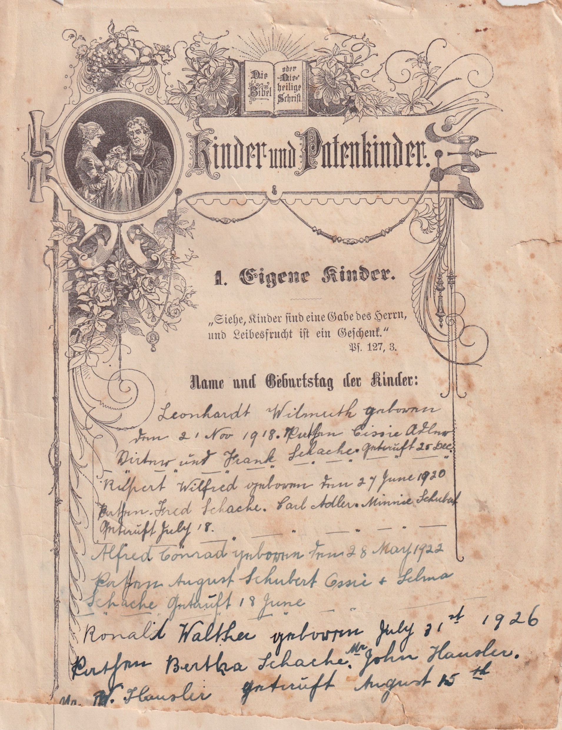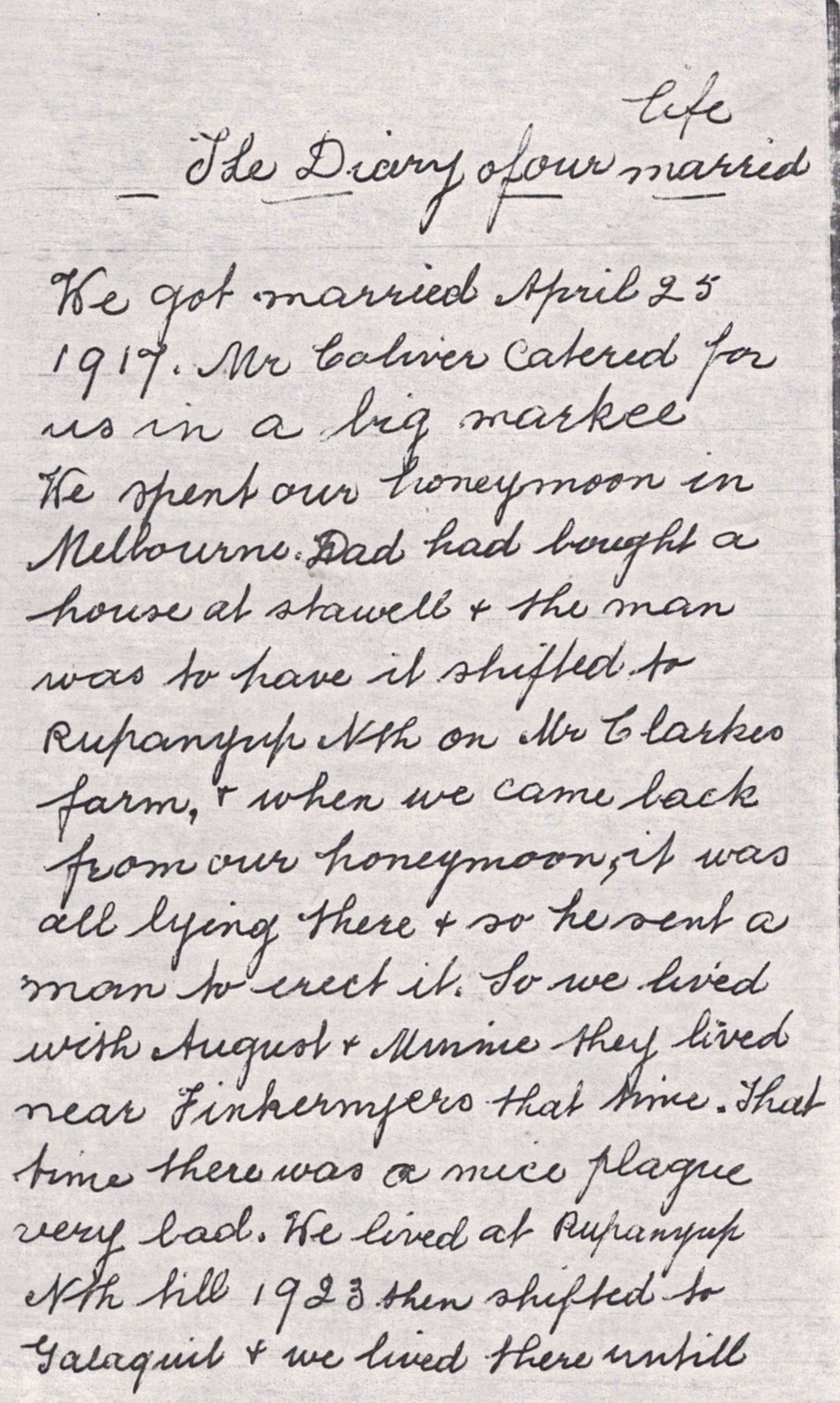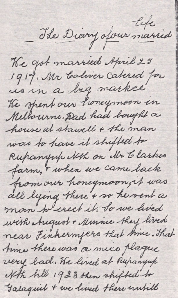 Documents and Memorabilia (1.8.9 SCHUBERT) Walther Schubert’s second class history reader, Tanunda, SA, 1899. Reading and writing primer used by Winnie Adler (later Schubert) and Carl Adler. Inscriptions in the book above. Inscription of Walther Schubert in the autograph book belonging to Minnie Schubert (later Boehm), 1913 [Pam Elliott]. Marriage certificate of Walther and Winnie Schubert (Adler), Murtoa, Vic., 1917 [Winnie Schubert (Adler)]. Pages from the family Bible of Walter and Winnie Schubert (Adler) [Winnie Schubert (Adler)]. Telegrams for silver wedding of Walther and Winnie Schubert (Adler), 1942. Walther Schubert, loan application, 1947 [Winnie Schubert (Adler)]. The Diary of Our Married Life”, a memoir by Winnie Schubert (Adler), Kilsyth, Vic., written post-1961 [Winnie Schubert (Adler)]. “Our Married Life”, a memoir by Winnie Schubert (Adler), Kilsyth, Vic, written 1975 [Winnie Schubert (Adler)]. Funeral service sheet for Winnie Schubert (Adler), Hamilton, Vic., 1978. Obituary for Winnie Schubert (Adler), Hamilton, Vic., 1978.