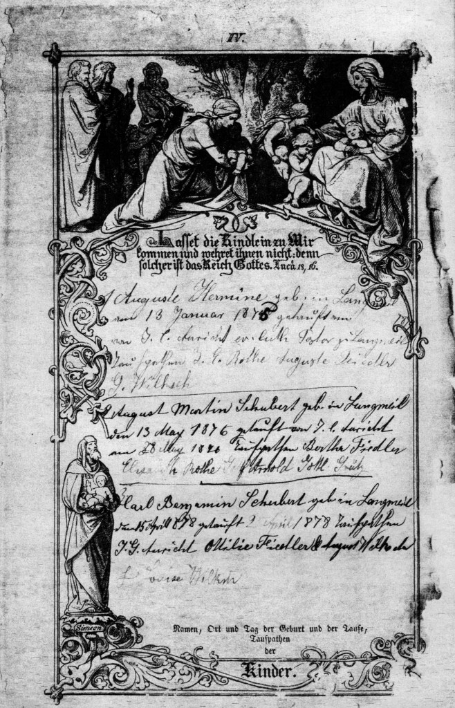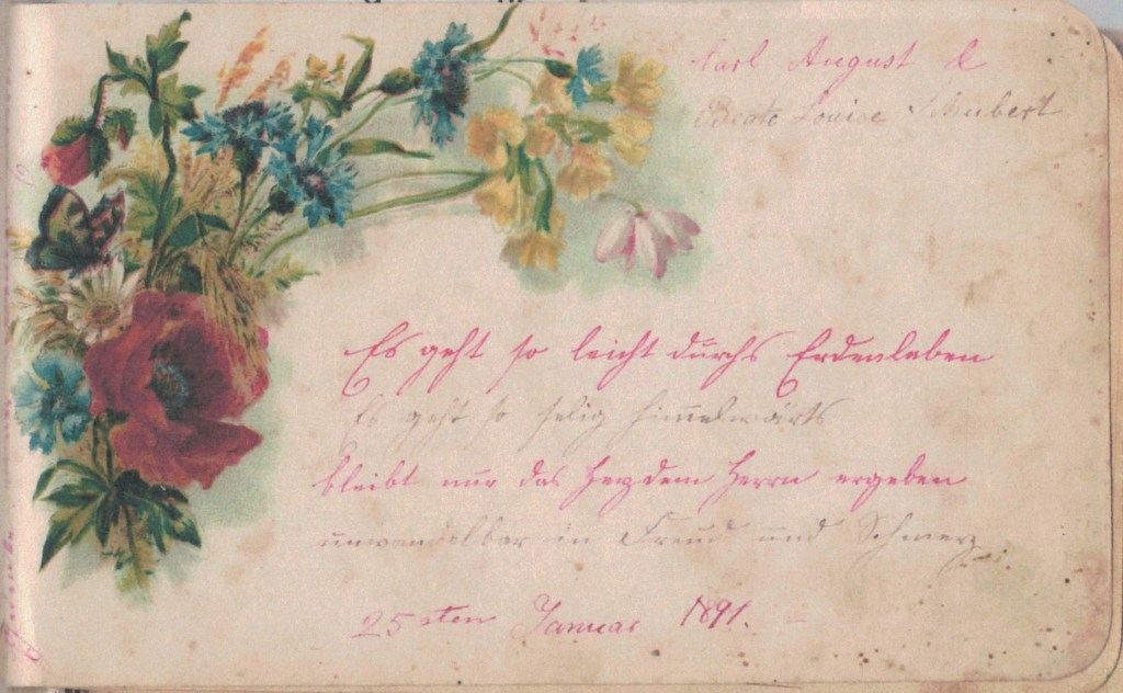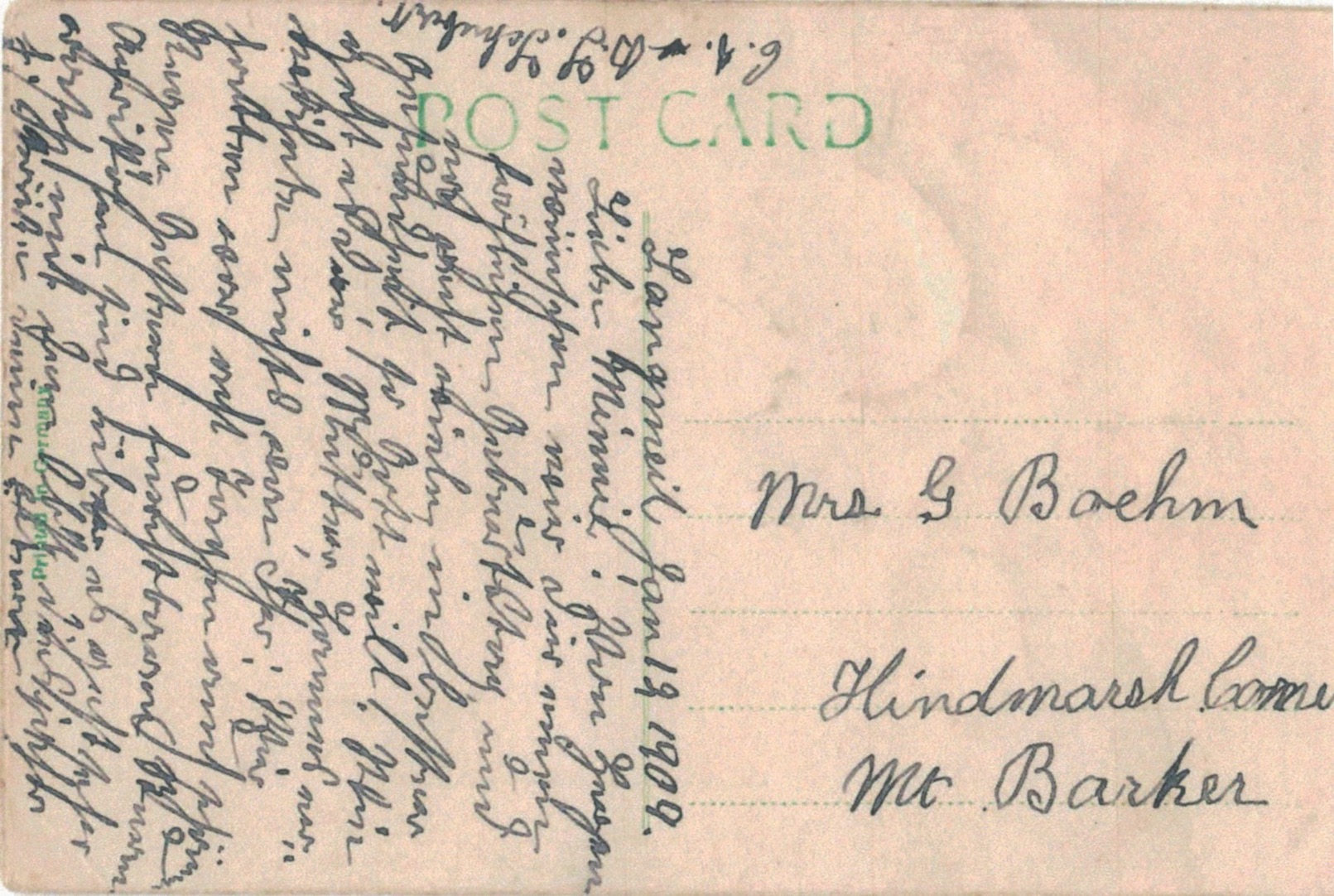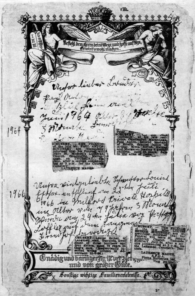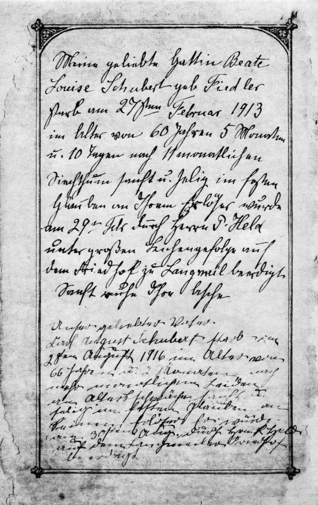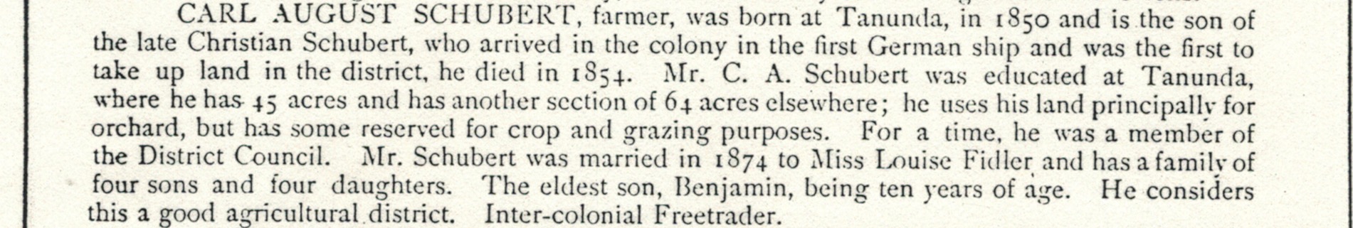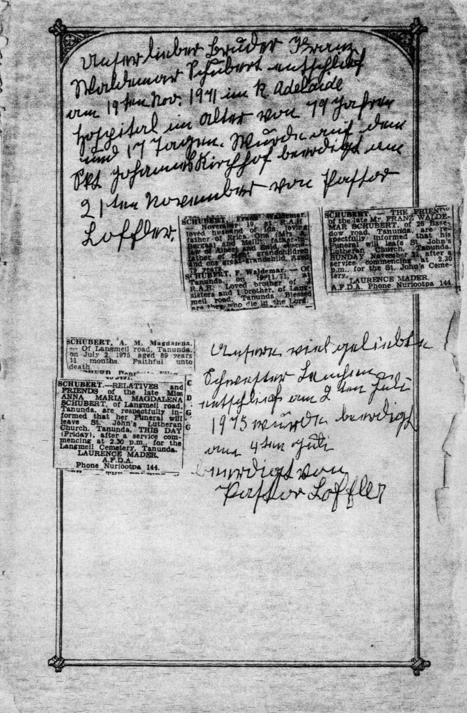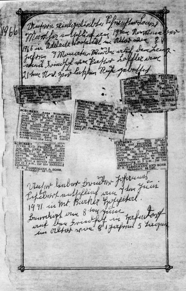 Entries in the family Bible of August and Louise Schubert Fiedler), “Traut Heim”, Tanunda, SA; photocopied 1979 (per Lothar Schubert)[JAS]Legal agreement between Carl August Schubert and Christian Rothe concerning transfer of Langmeil land, SA., 1874.Morrison, W. Frederic, “The Aldine History of South Australia”, Sydney and Adelaide, Aldine Publishing Co., 1890, page 588 (Tanunda).Inscription of August and Louise Schubert (Fiedler) in the autograph book belonging to Minnie Schubert (later Boehm), 1891 [Pam Elliott].Postcard to Minnie Boehm (Schubert) from August and Louise Schubert (Fiedler), 1909; possibly written by Louise [Pam Elliott].Postcard with birthday greeting from August and Louise Schubert (Fiedler) to Wilfred Boehm, 1910; possibly written by Louise [Pam Elliott].Postcard with birthday greeting, probably from August Schubert to Gustav Boehm, 1910 [Pam Elliott].Postcard with birthday greeting from August Schubert to Wilfred Boehm [Pam Elliott].Verse written by August Schubert for the 60th birthday of his wife Louise, 1912 (read by her children Lieschen, Hilda and Lothar, and grand-daughter Sophie Boehm (later Liebelt); transcribed by Hilda Schubert, “Traut Heim”, Tanunda, SA, May 1979.