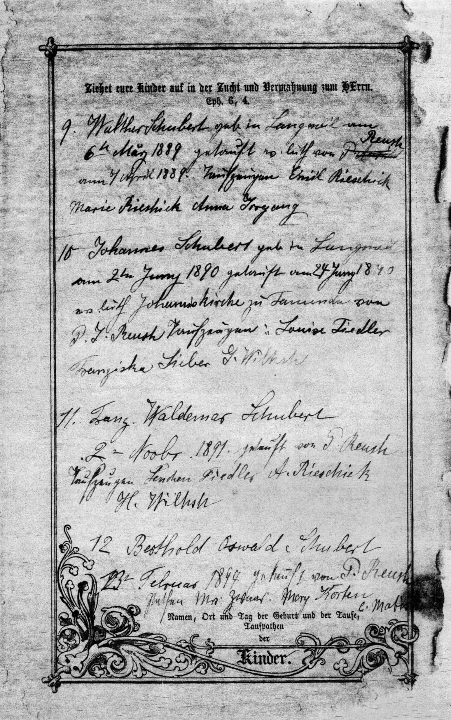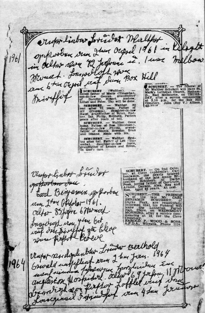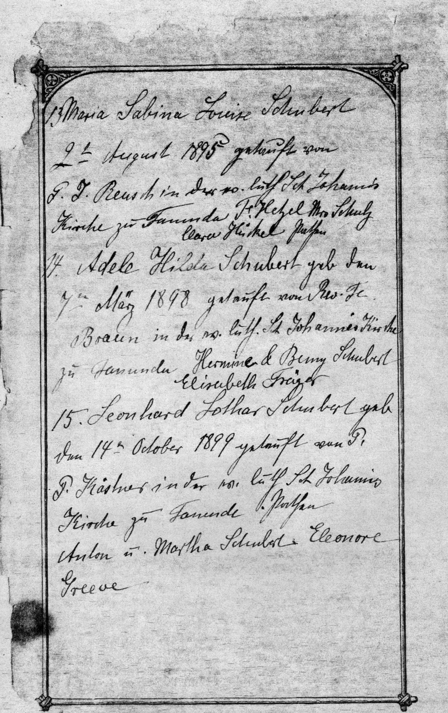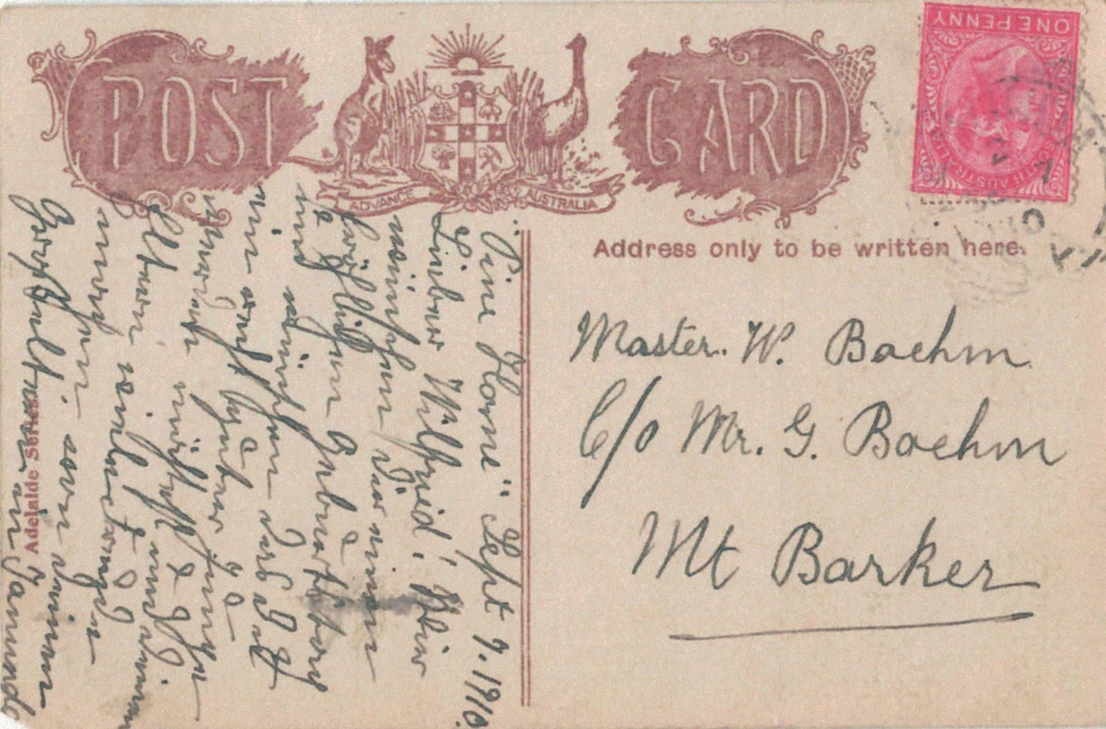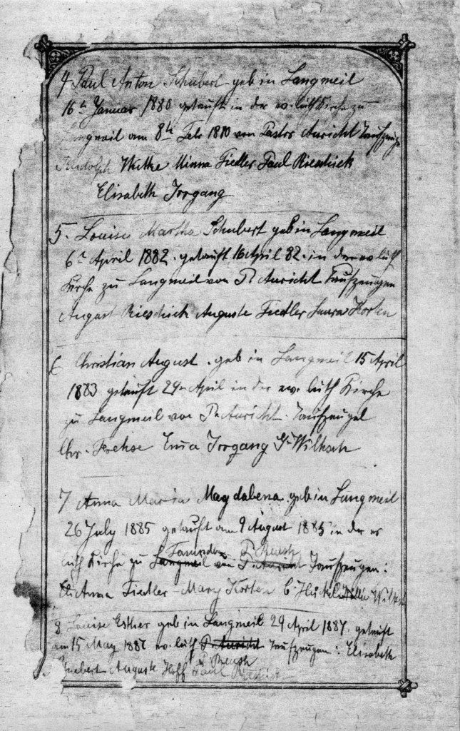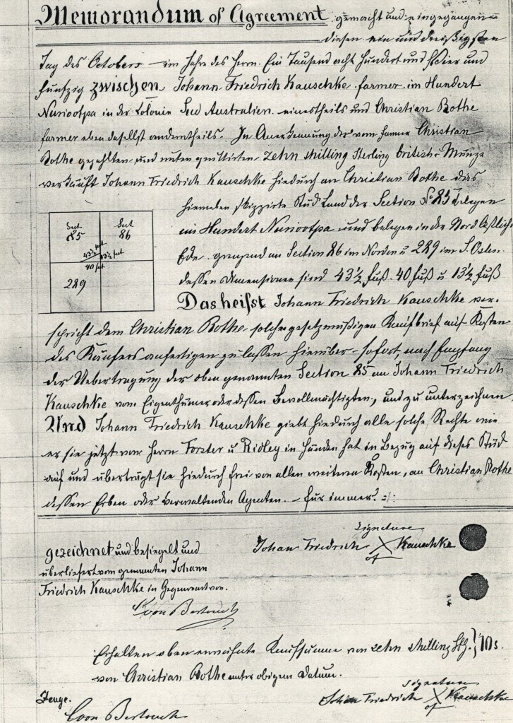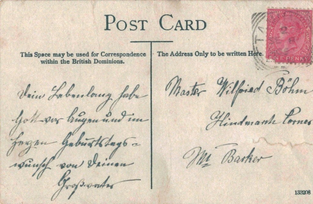 Entries in the family Bible of August and Louise Schubert Fiedler), “Traut Heim”, Tanunda, SA; photocopied 1979 (per Lothar Schubert)[JAS]Legal agreement between Carl August Schubert and Christian Rothe concerning transfer of Langmeil land, SA., 1874.Morrison, W. Frederic, “The Aldine History of South Australia”, Sydney and Adelaide, Aldine Publishing Co., 1890, page 588 (Tanunda).Inscription of August and Louise Schubert (Fiedler) in the autograph book belonging to Minnie Schubert (later Boehm), 1891 [Pam Elliott].Postcard to Minnie Boehm (Schubert) from August and Louise Schubert (Fiedler), 1909; possibly written by Louise [Pam Elliott].Postcard with birthday greeting from August and Louise Schubert (Fiedler) to Wilfred Boehm, 1910; possibly written by Louise [Pam Elliott].Postcard with birthday greeting, probably from August Schubert to Gustav Boehm, 1910 [Pam Elliott].Postcard with birthday greeting from August Schubert to Wilfred Boehm [Pam Elliott].Verse written by August Schubert for the 60th birthday of his wife Louise, 1912 (read by her children Lieschen, Hilda and Lothar, and grand-daughter Sophie Boehm (later Liebelt); transcribed by Hilda Schubert, “Traut Heim”, Tanunda, SA, May 1979.