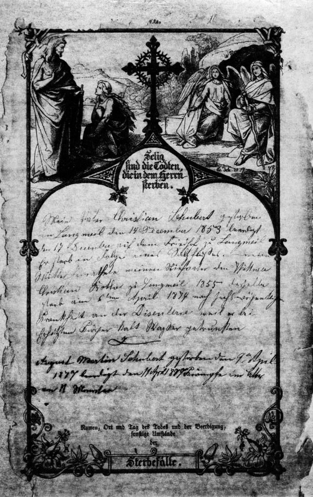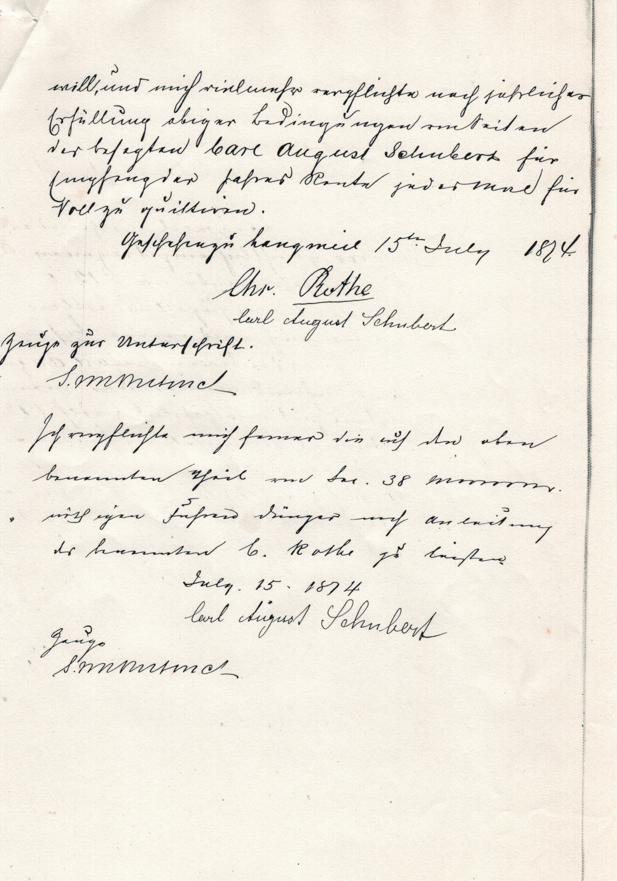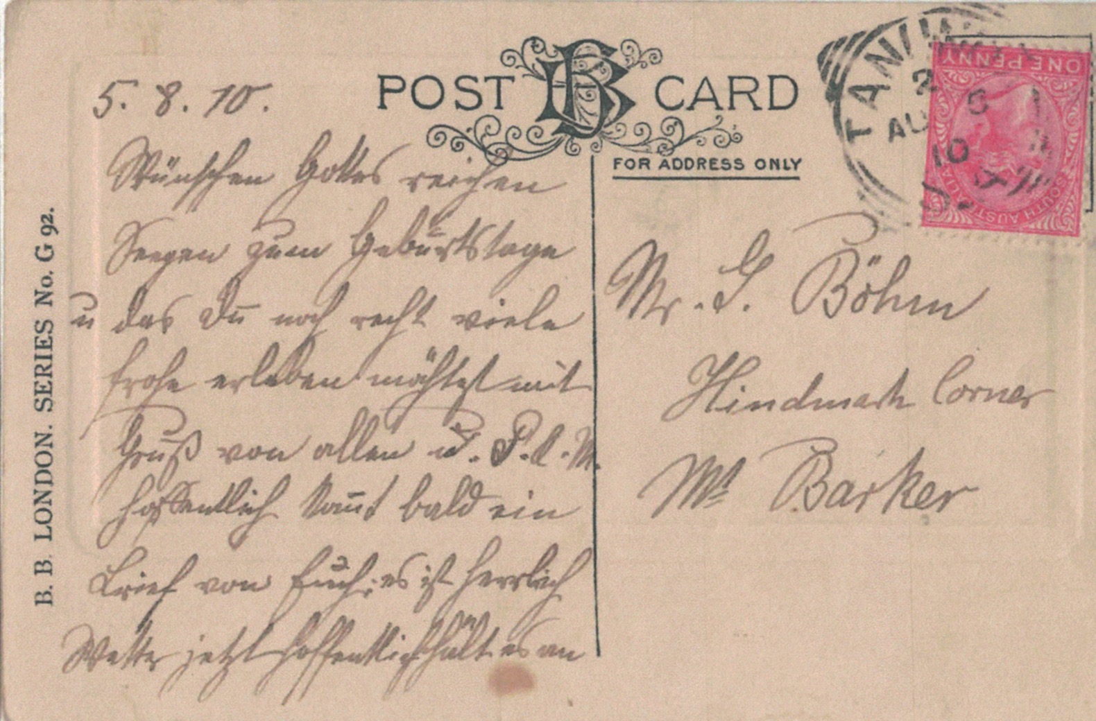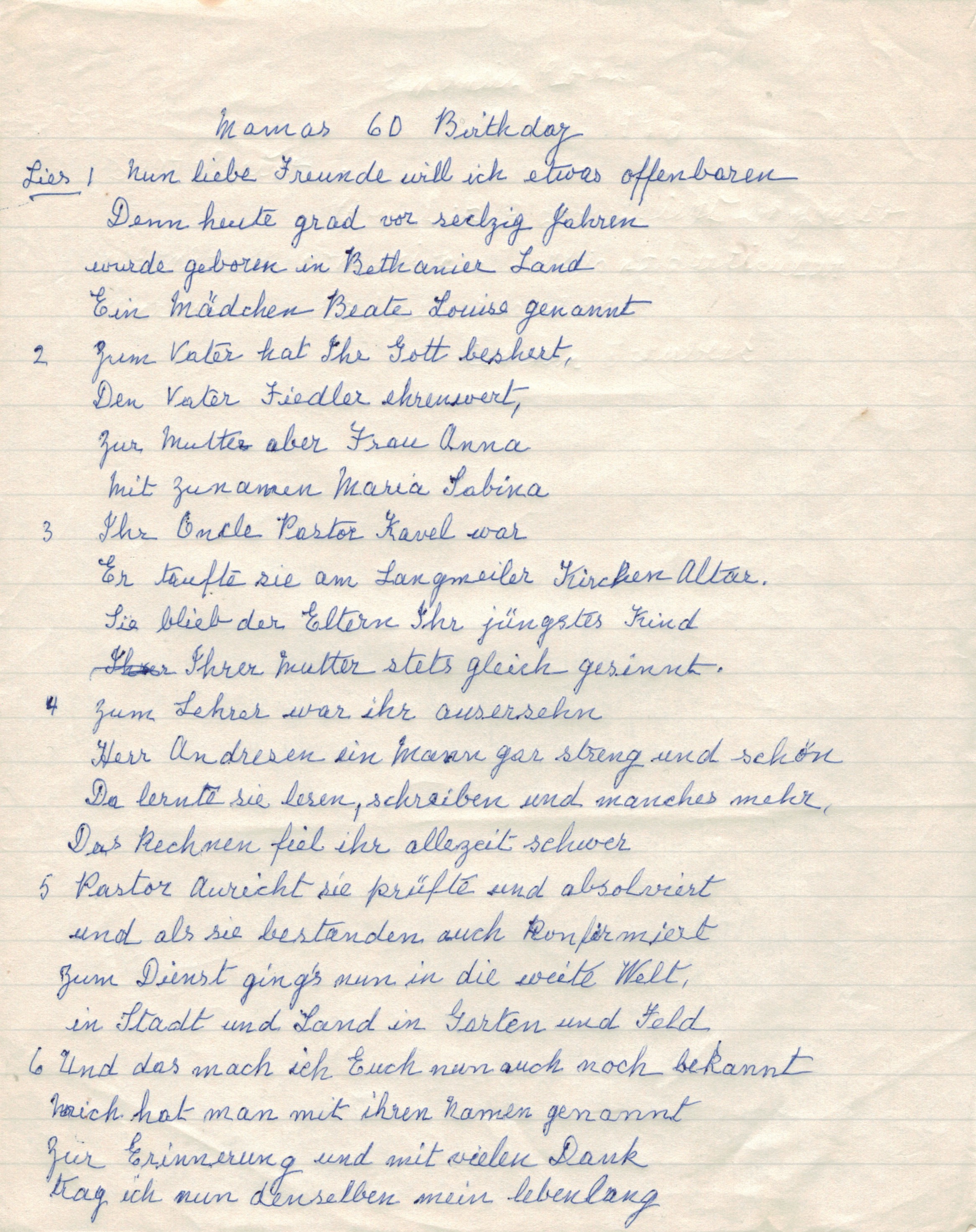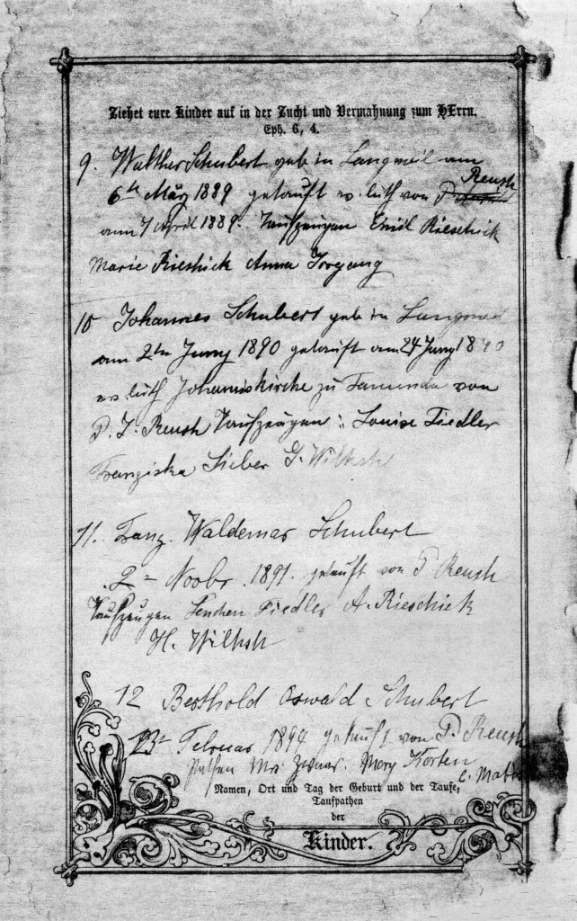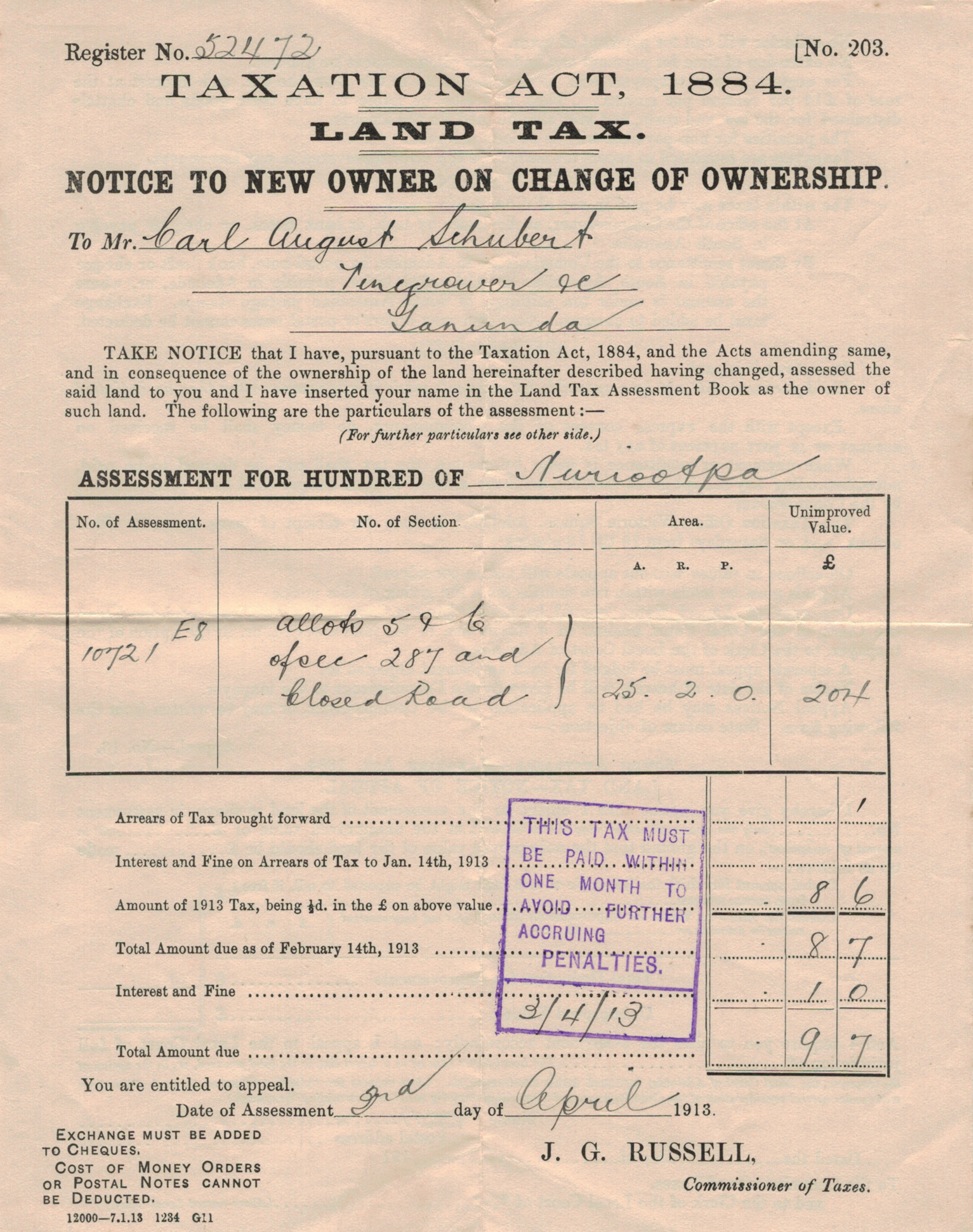 Entries in the family Bible of August and Louise Schubert Fiedler), “Traut Heim”, Tanunda, SA; photocopied 1979 (per Lothar Schubert)[JAS]Legal agreement between Carl August Schubert and Christian Rothe concerning transfer of Langmeil land, SA., 1874.Morrison, W. Frederic, “The Aldine History of South Australia”, Sydney and Adelaide, Aldine Publishing Co., 1890, page 588 (Tanunda).Inscription of August and Louise Schubert (Fiedler) in the autograph book belonging to Minnie Schubert (later Boehm), 1891 [Pam Elliott].Postcard to Minnie Boehm (Schubert) from August and Louise Schubert (Fiedler), 1909; possibly written by Louise [Pam Elliott].Postcard with birthday greeting from August and Louise Schubert (Fiedler) to Wilfred Boehm, 1910; possibly written by Louise [Pam Elliott].Postcard with birthday greeting, probably from August Schubert to Gustav Boehm, 1910 [Pam Elliott].Postcard with birthday greeting from August Schubert to Wilfred Boehm [Pam Elliott].Verse written by August Schubert for the 60th birthday of his wife Louise, 1912 (read by her children Lieschen, Hilda and Lothar, and grand-daughter Sophie Boehm (later Liebelt); transcribed by Hilda Schubert, “Traut Heim”, Tanunda, SA, May 1979.