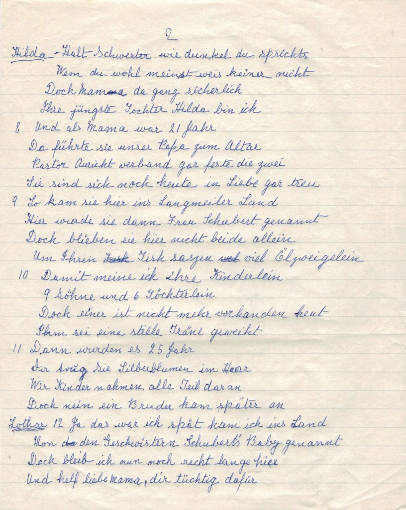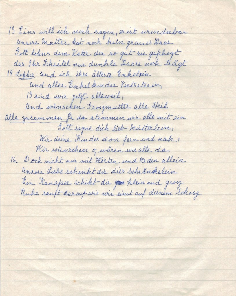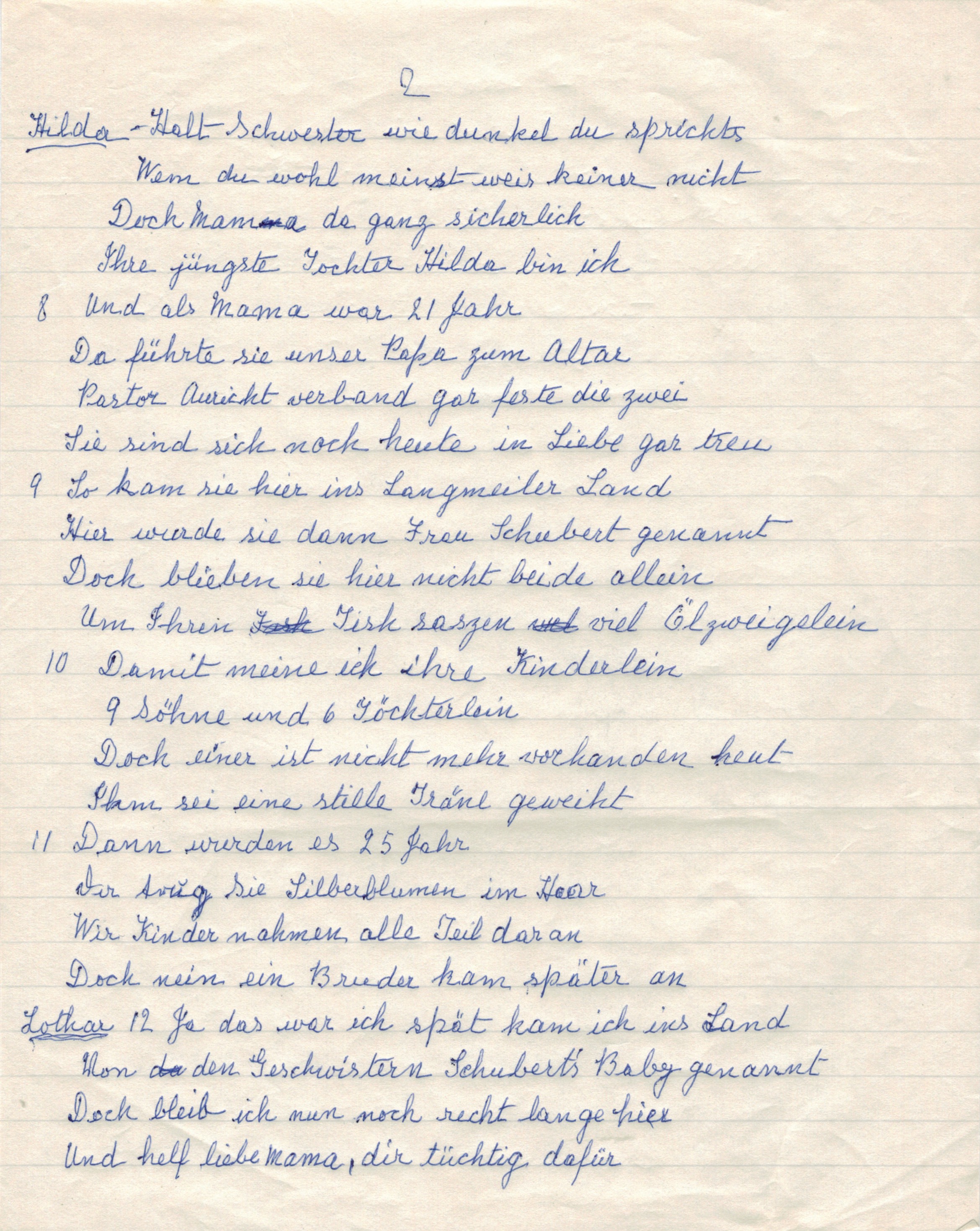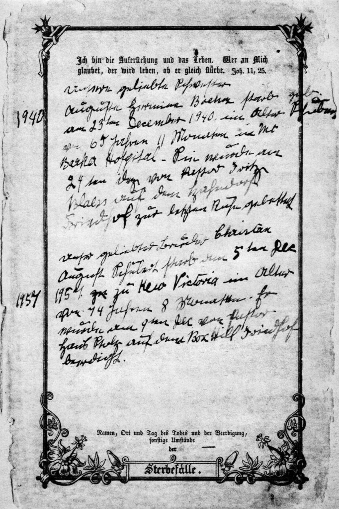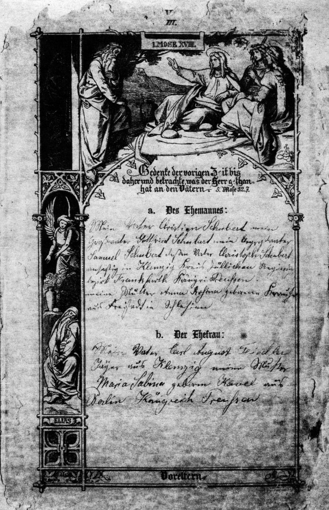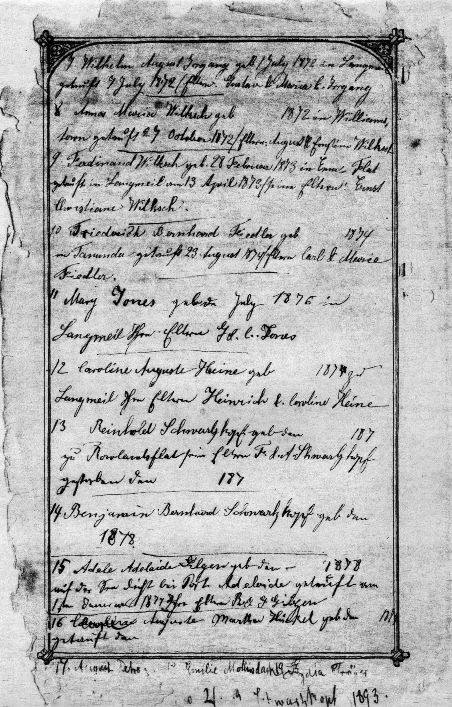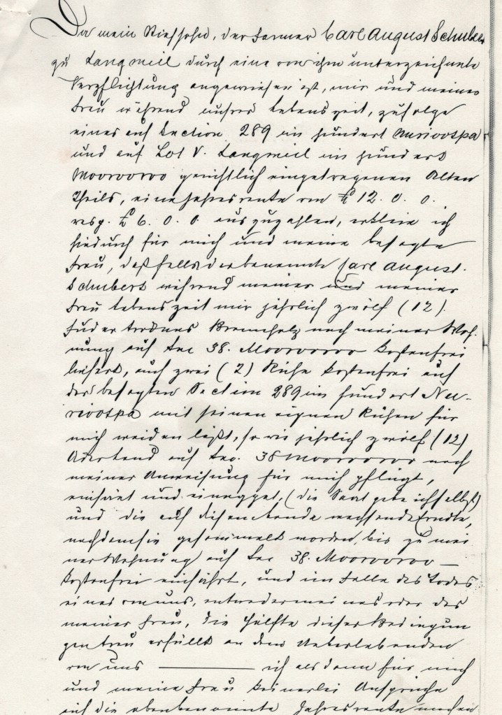 Entries in the family Bible of August and Louise Schubert Fiedler), “Traut Heim”, Tanunda, SA; photocopied 1979 (per Lothar Schubert)[JAS]Legal agreement between Carl August Schubert and Christian Rothe concerning transfer of Langmeil land, SA., 1874.Morrison, W. Frederic, “The Aldine History of South Australia”, Sydney and Adelaide, Aldine Publishing Co., 1890, page 588 (Tanunda).Inscription of August and Louise Schubert (Fiedler) in the autograph book belonging to Minnie Schubert (later Boehm), 1891 [Pam Elliott].Postcard to Minnie Boehm (Schubert) from August and Louise Schubert (Fiedler), 1909; possibly written by Louise [Pam Elliott].Postcard with birthday greeting from August and Louise Schubert (Fiedler) to Wilfred Boehm, 1910; possibly written by Louise [Pam Elliott].Postcard with birthday greeting, probably from August Schubert to Gustav Boehm, 1910 [Pam Elliott].Postcard with birthday greeting from August Schubert to Wilfred Boehm [Pam Elliott].Verse written by August Schubert for the 60th birthday of his wife Louise, 1912 (read by her children Lieschen, Hilda and Lothar, and grand-daughter Sophie Boehm (later Liebelt); transcribed by Hilda Schubert, “Traut Heim”, Tanunda, SA, May 1979.